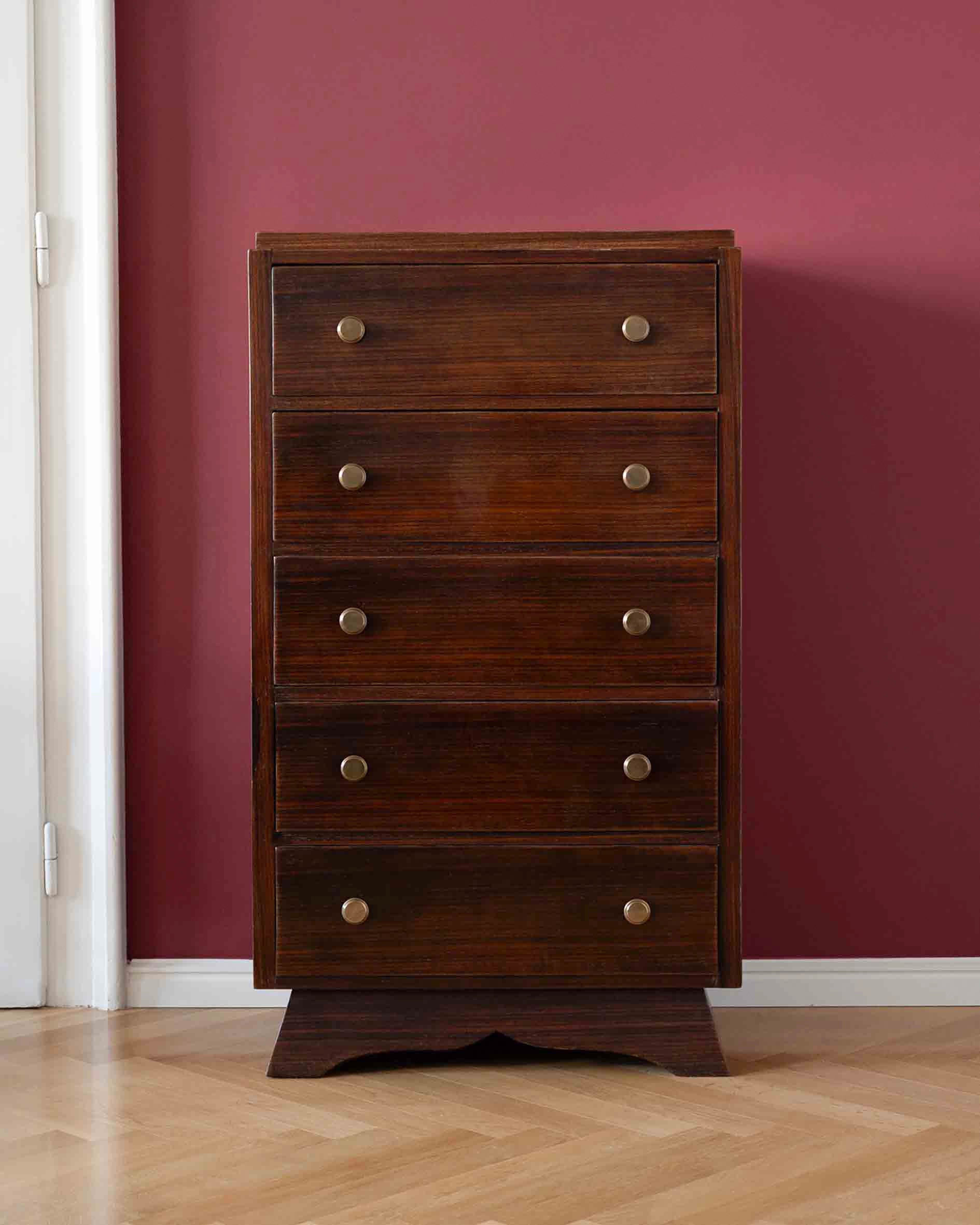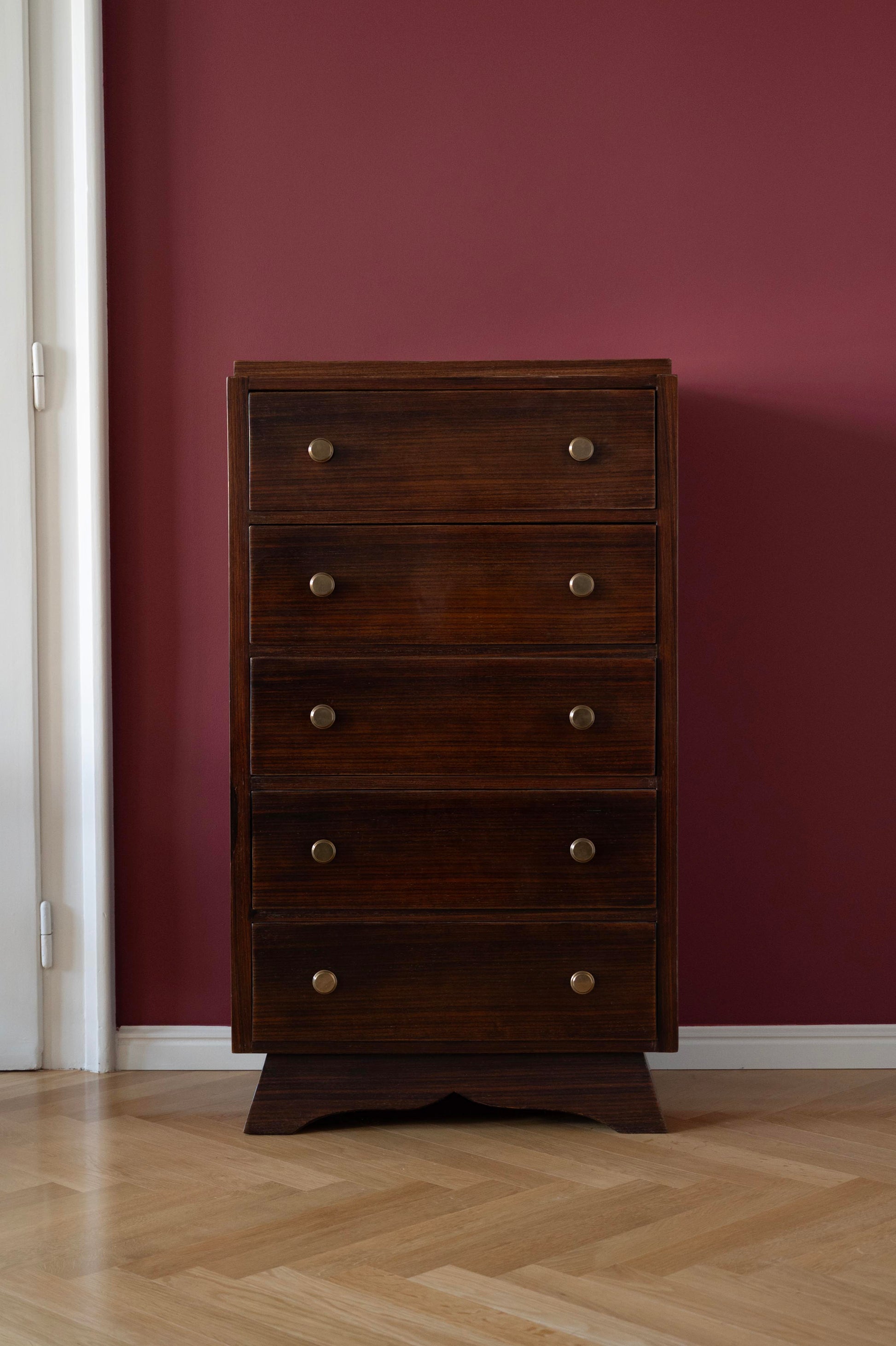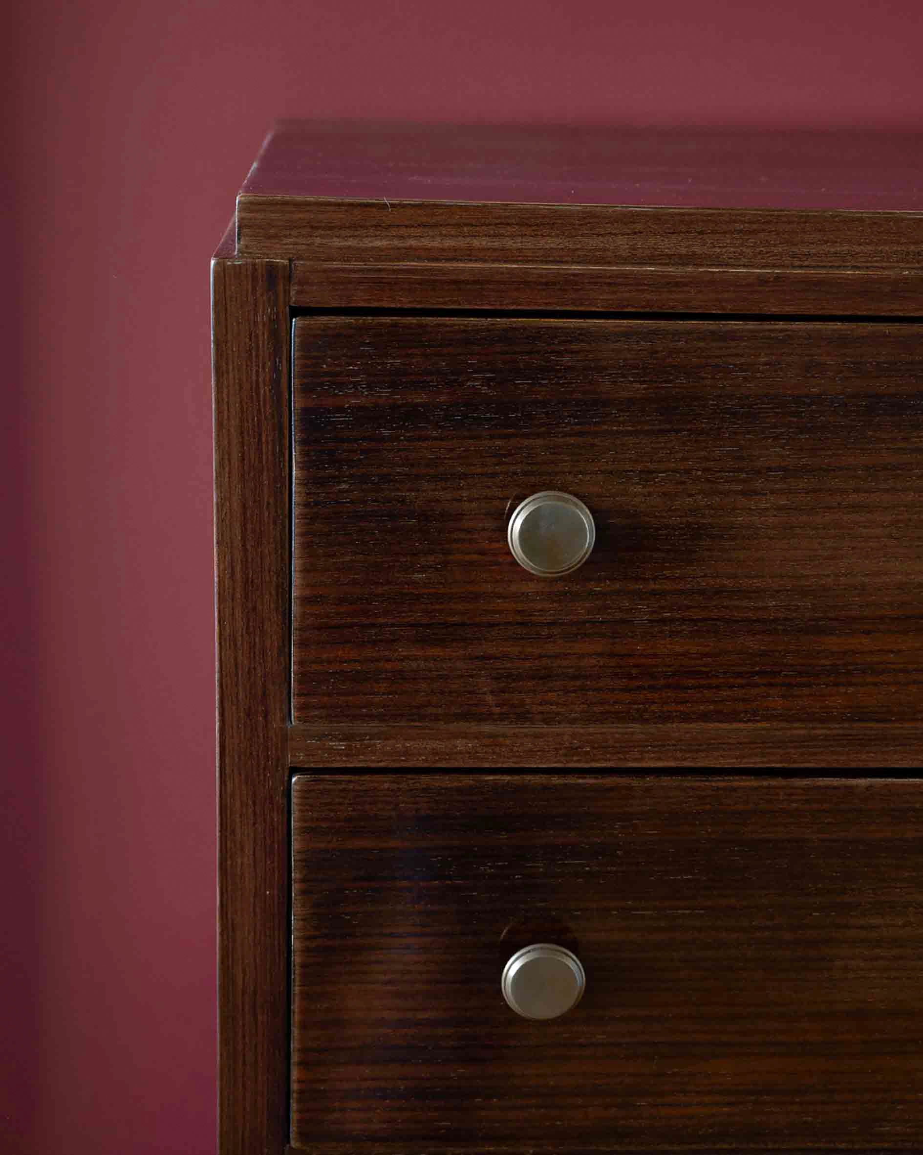 Elegantní art-deco šuplíková komoda z Francie, vyrobená z ušlechtilého palisandrového dřeva. Vizuálně ji dotváří originální mosazné úchyty a nově leštěný povrch, který zvýrazňuje její jedinečný charakter a řemeslnou preciznost.