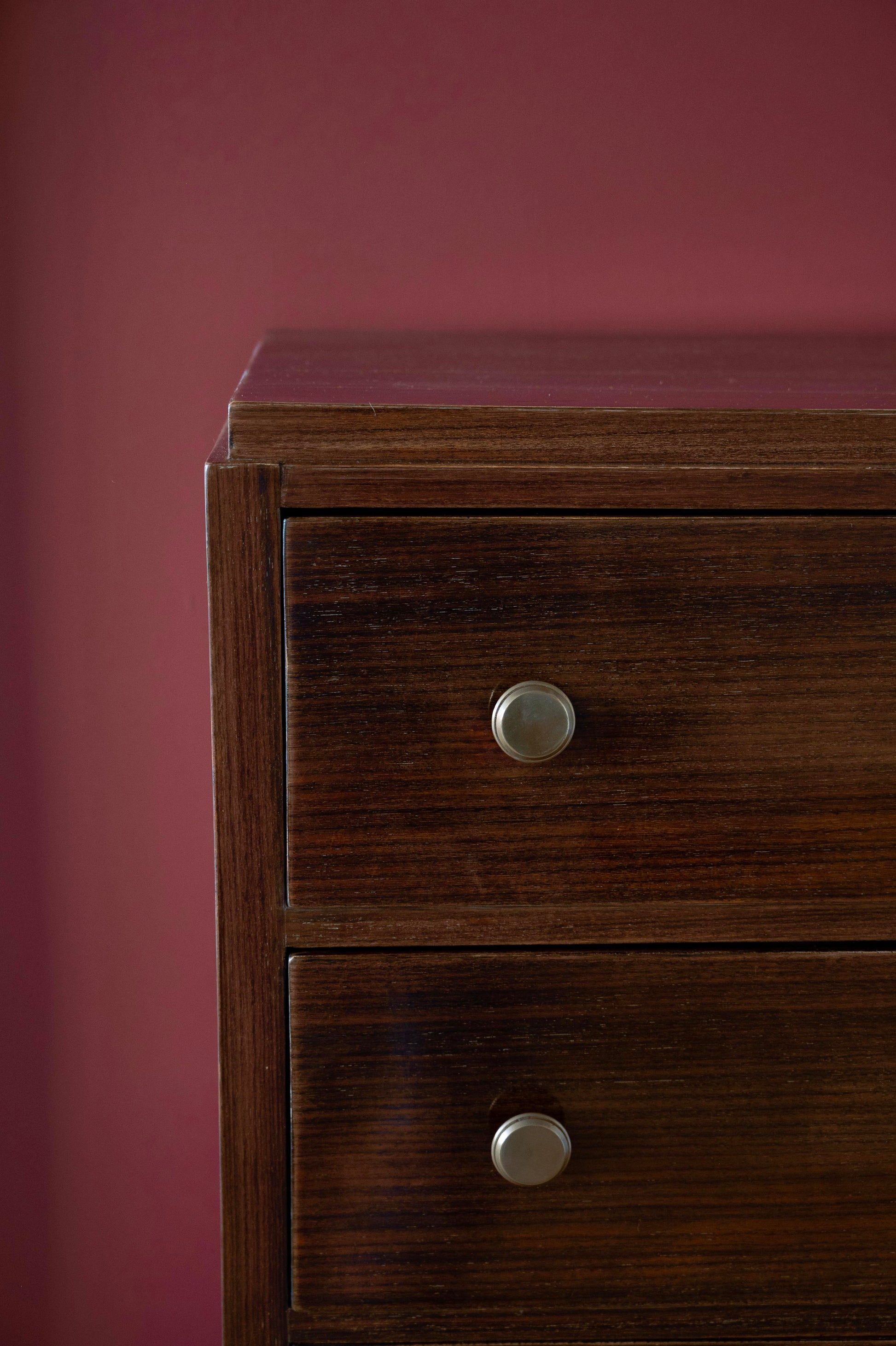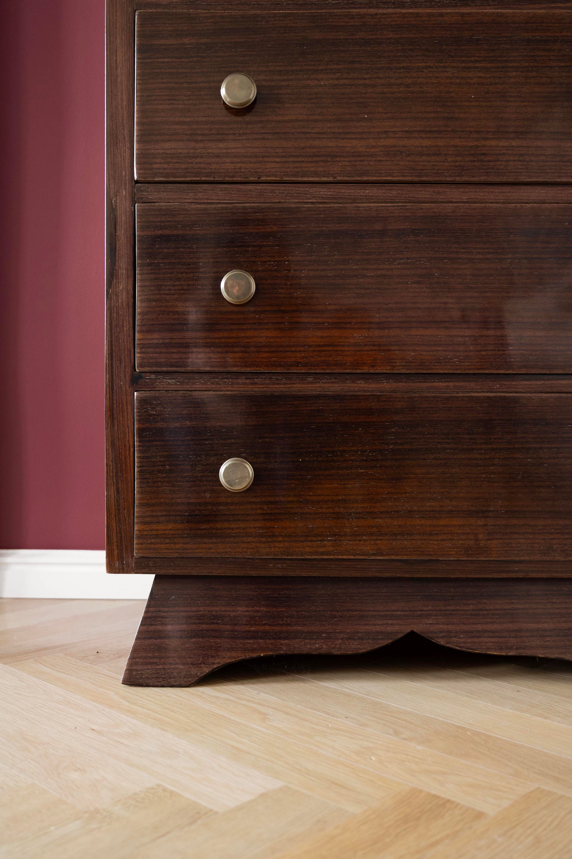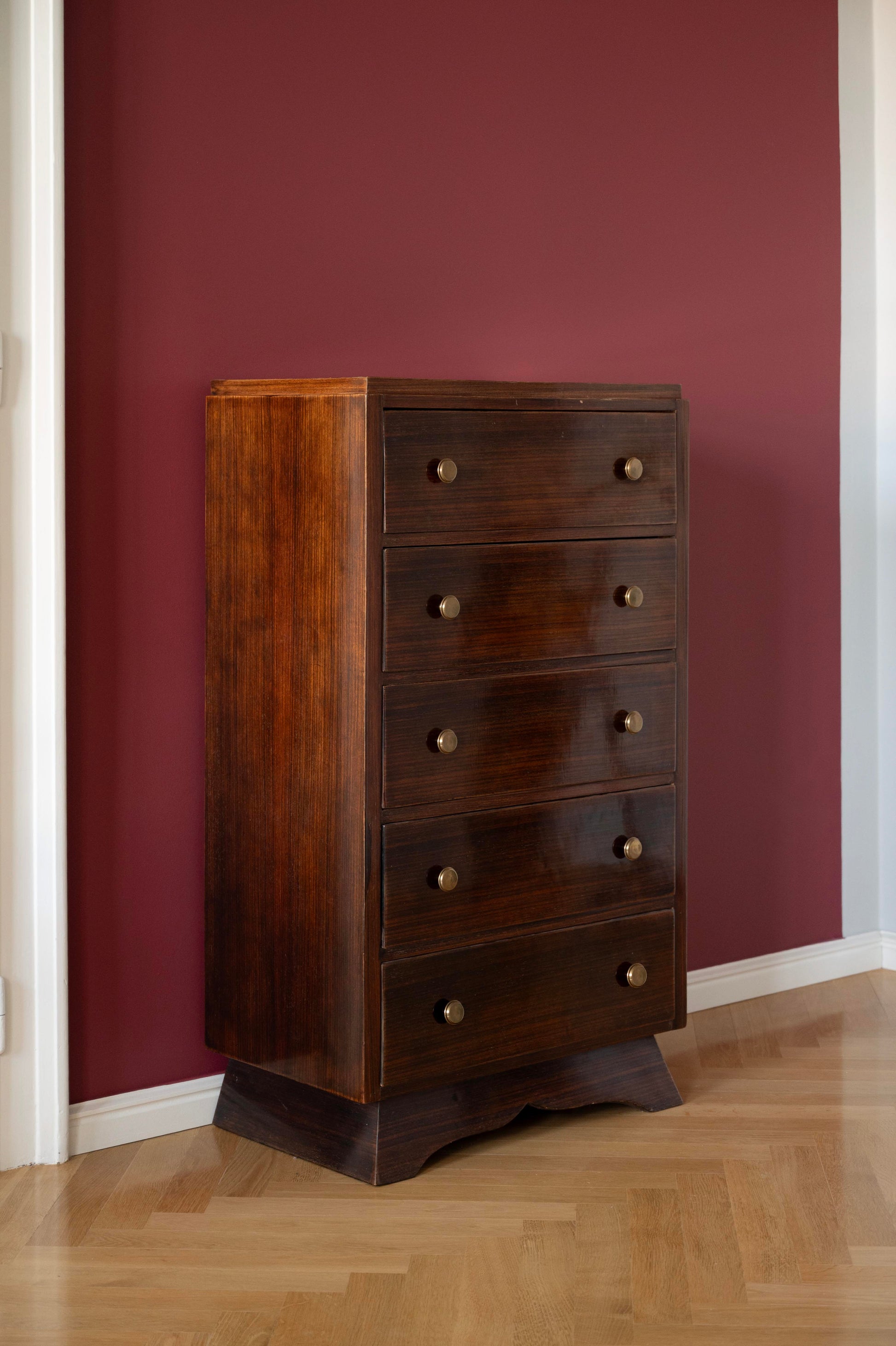 Elegantní art-deco šuplíková komoda z Francie, vyrobená z ušlechtilého palisandrového dřeva. Vizuálně ji dotváří originální mosazné úchyty a nově leštěný povrch, který zvýrazňuje její jedinečný charakter a řemeslnou preciznost.