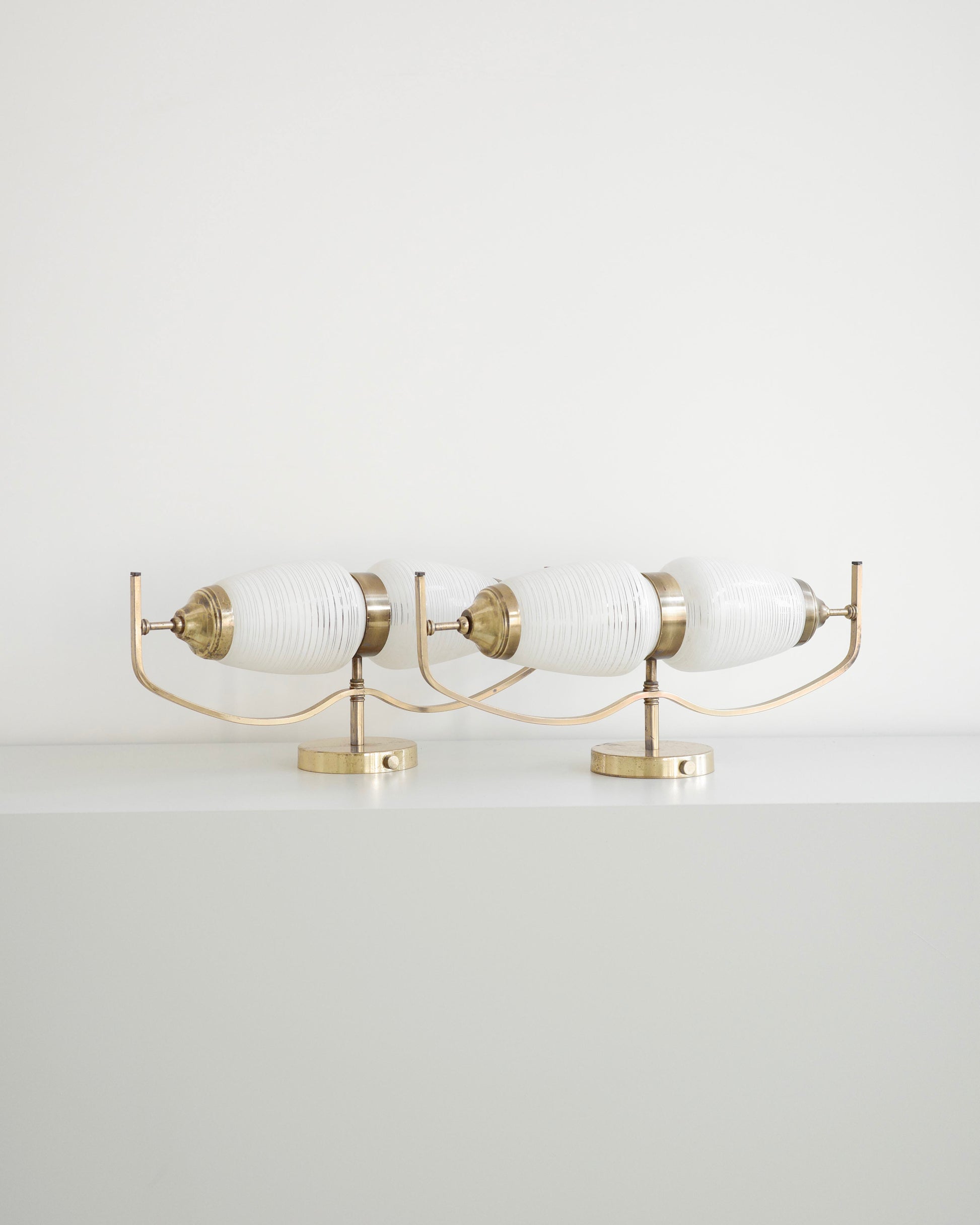Lampy jsme sice dovezli z Itálie, ale jejich původ je francouzský. Konstrukce je vyrobena je mosazi a každá z nich má dvě stínítka v bílé barvě, s jemným páskem. Lampy jsou ve výborném stavu, byly zkontrolovány elektrikářem a jsou plně funkční.