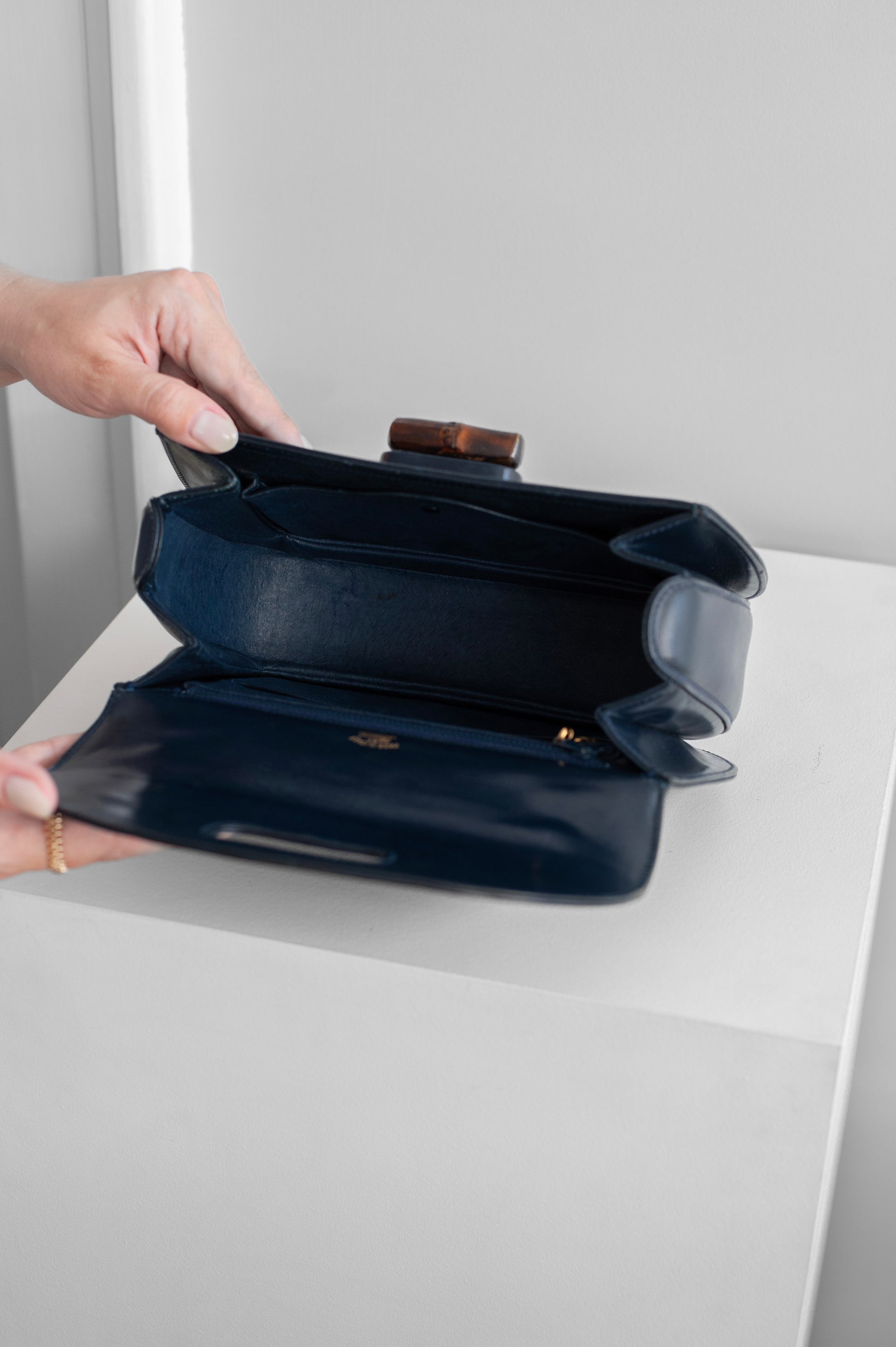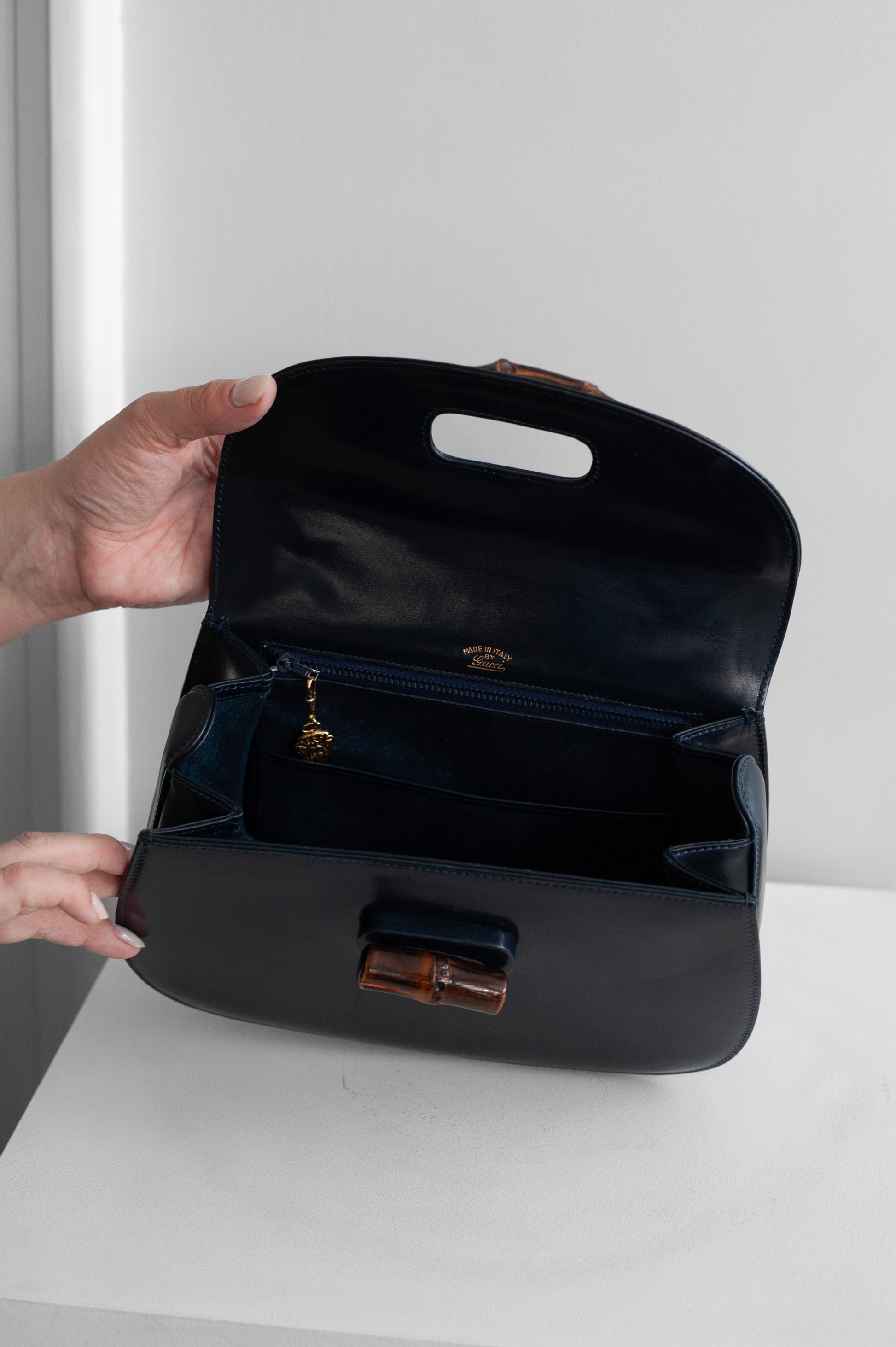 Ikona do vašeho šatníku! Vintage kabelka GUCCI Bamboo v naší nabídce pochází z 80. let a je ve výborném stavu. Barva kůže je tmavě modrá, tzv. „box leather“ v jemně lesklém provedení. Kov je zlatý. Tento model byl navržen ještě v roce 1947. Jelikož po druhé světové válce byl nedostatek kvalitní kůže, rukojeť byla navržena z ohýbaného bambusu. Aktuální kabelka zažívá znovuzrození a jejím ambasadorem je například i Harry Styles. Kabelka je značená ve vnitřní části, dodává se s dustbagem.