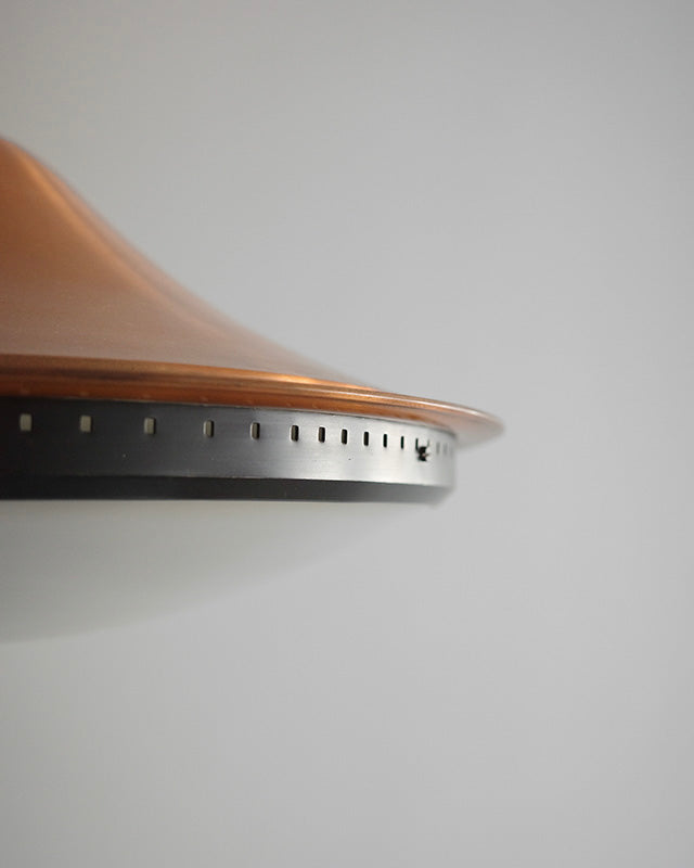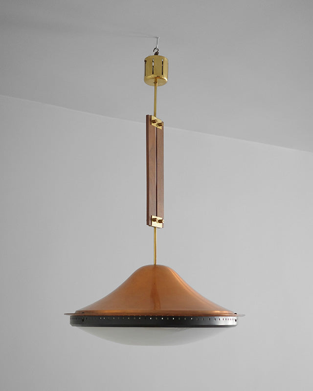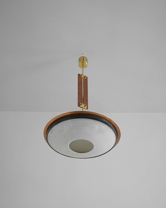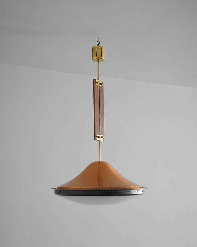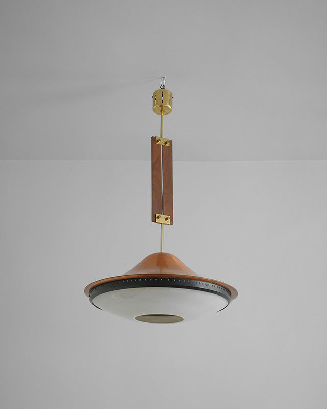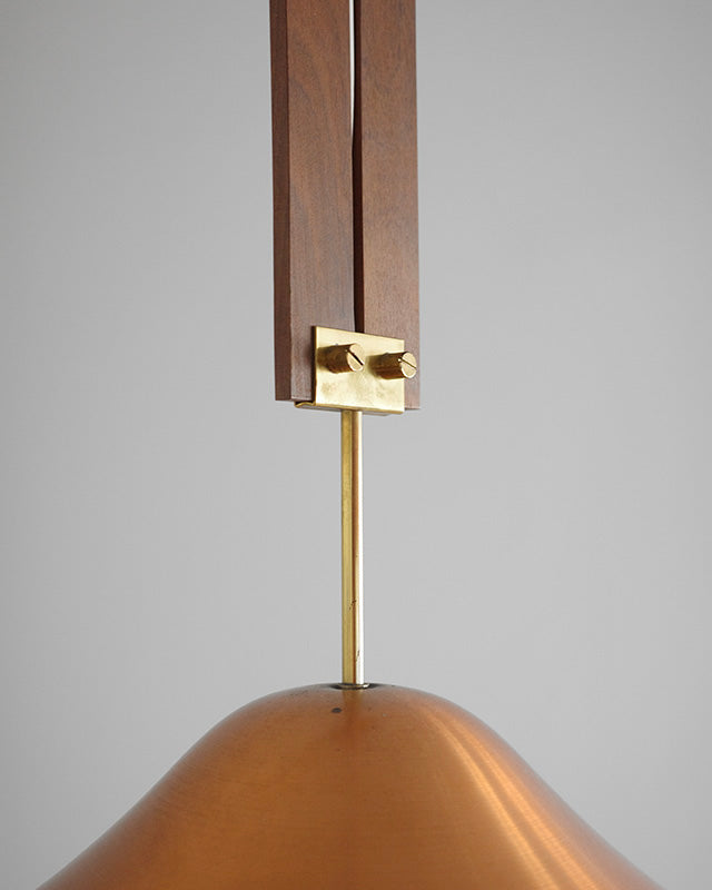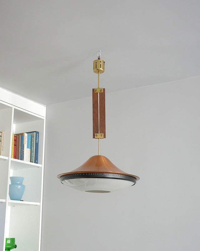 Tento lustr z 60. let je dokonalou ukázkou propojení modernistického designu s kvalitními přírodními materiály. Kombinace bronzově tónovaného hliníku s ušlechtilou mosaznou a dřevěnou konstrukcí vytváří harmonický celek, který působí nadčasově a sofistikovaně. Vynikne nad jídelním stolem, v obýváku či moderním pracovním prostoru.