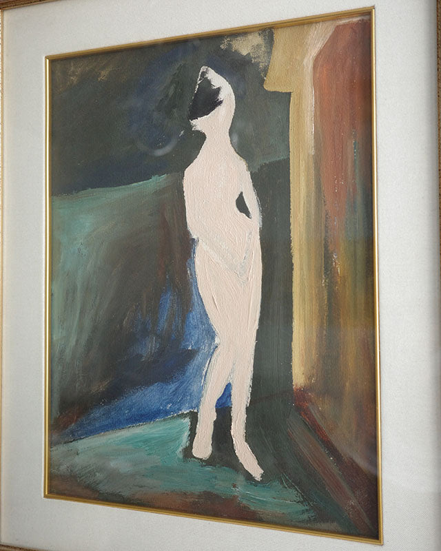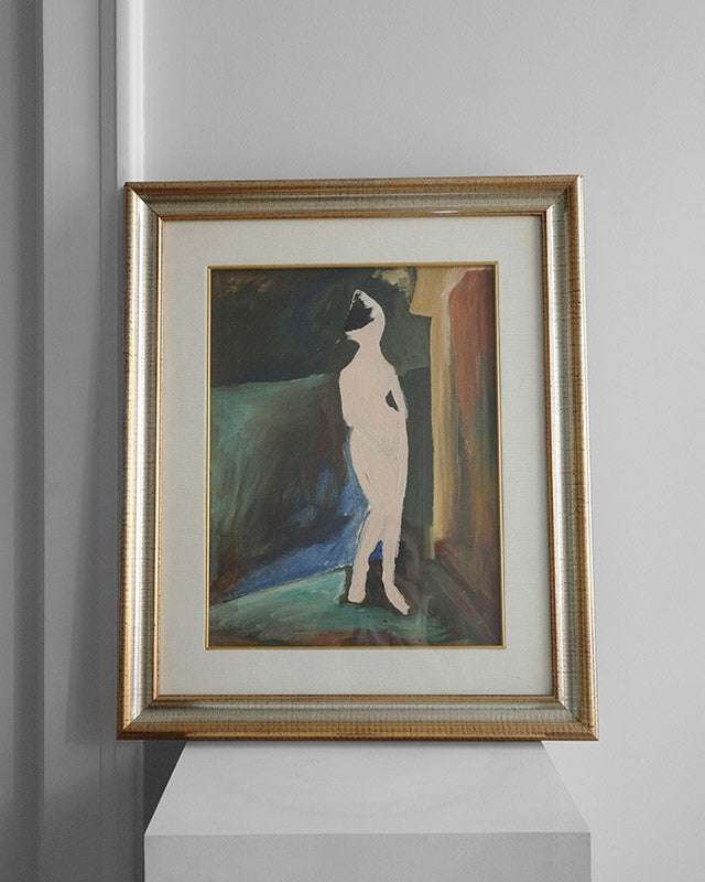Tento originální vintage obraz jsme objevili na italské burze, kde nás zaujal svojí jedinečnou atmosférou. Jemná barevná harmonie v odstínech modré a hnědé spolu s výrazným kontrastem bílé figury činí z díla nadčasový kousek. Obraz je osazen v kvalitním dřevěném rámu s jemnou patinou, který podtrhuje jeho charakter.