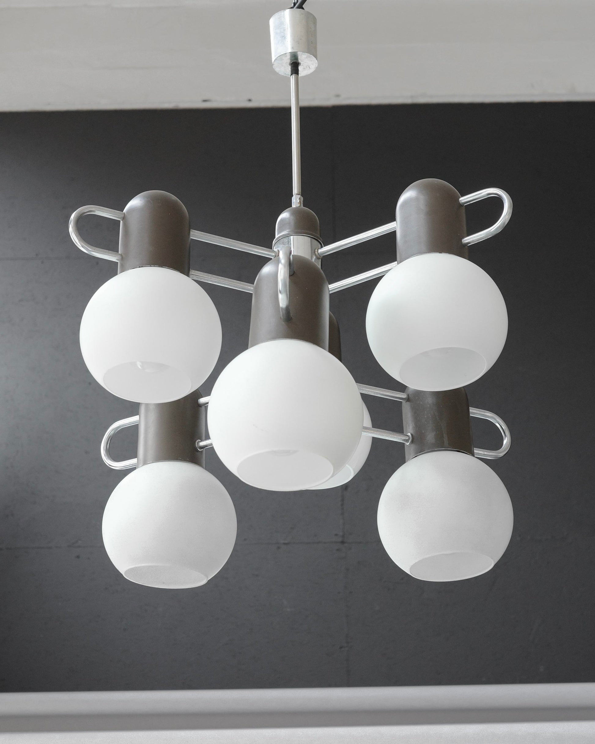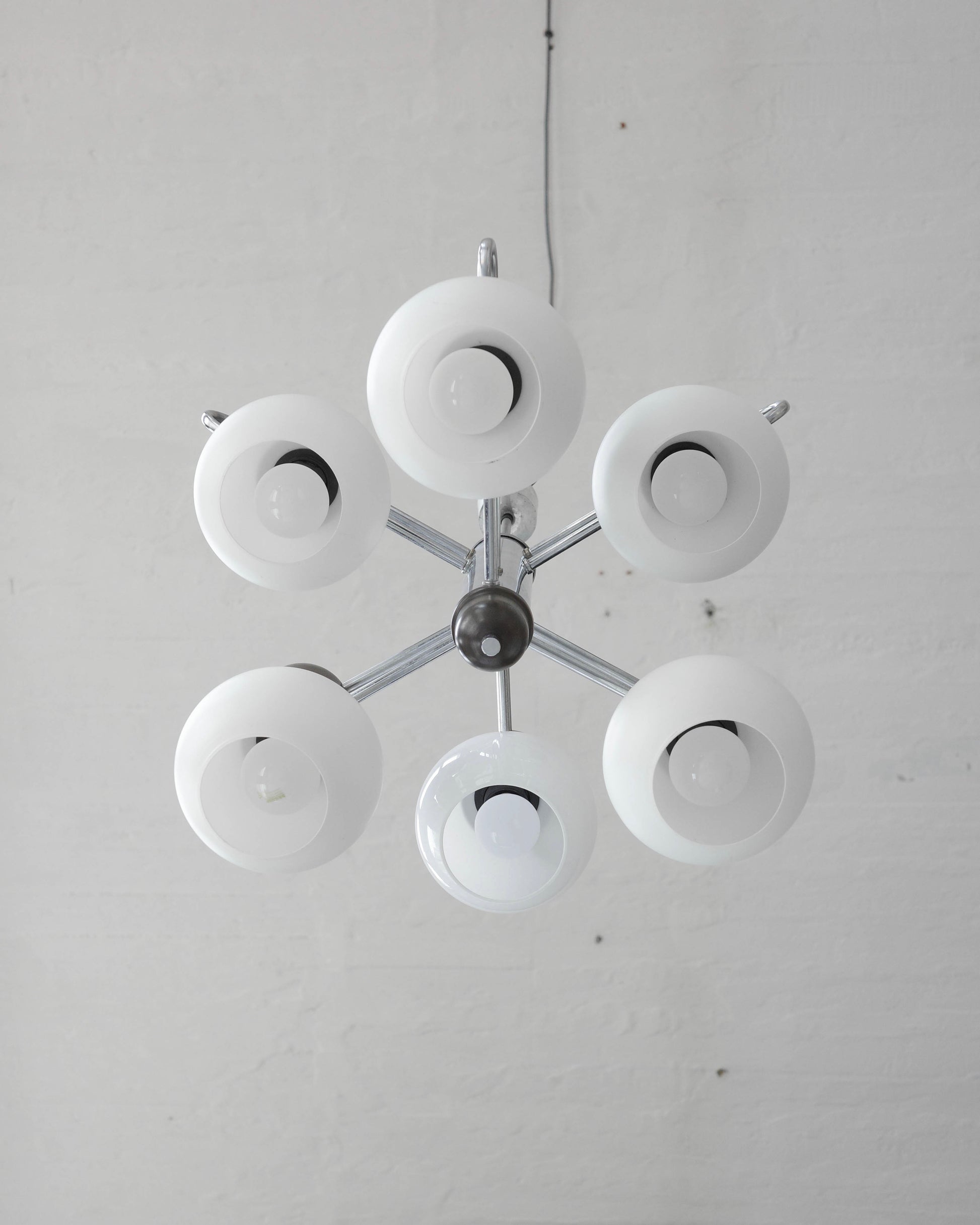 Lustr má kovovou konstukci v kombinaci chrom a černá barva. Má šest ramen, ukončených stínítky z bílého skla. Lustr jsme kompletně překabelovali a je plně funkční. Má šest zdrojů E27.