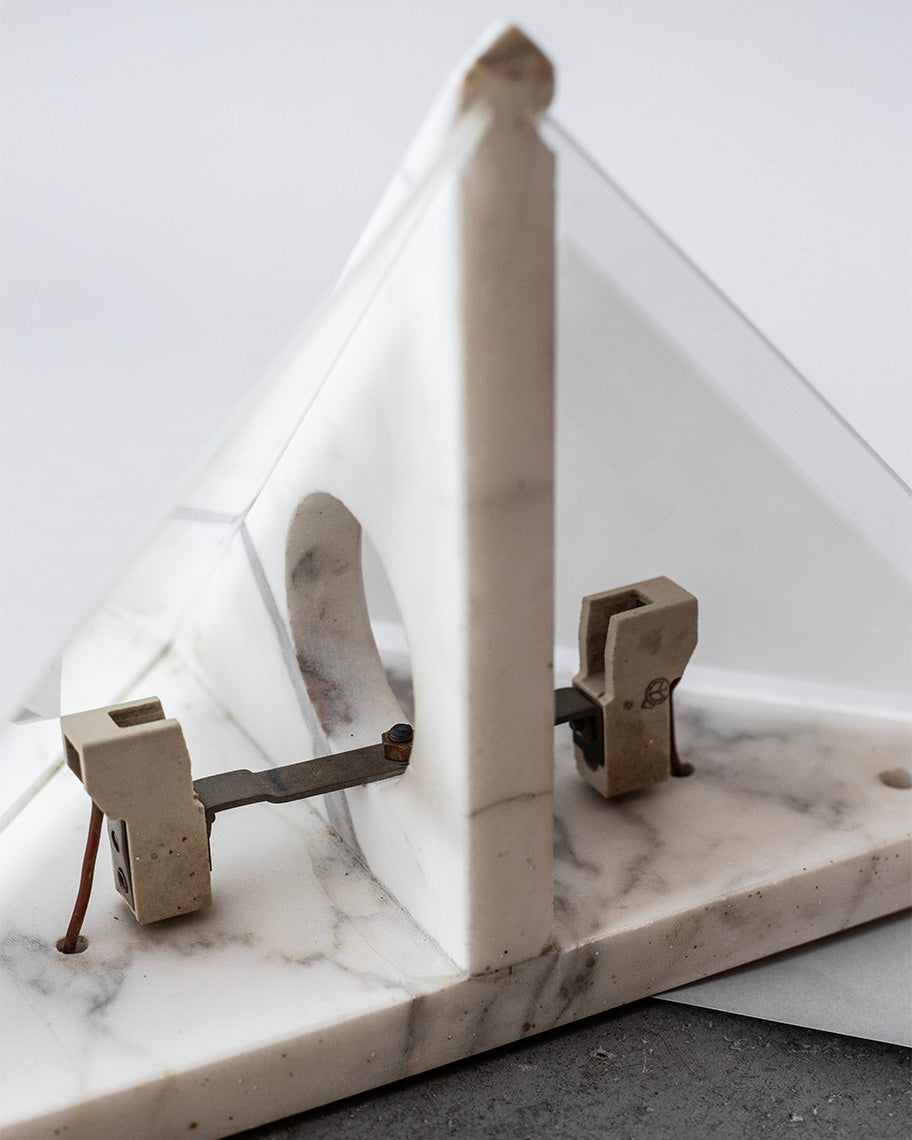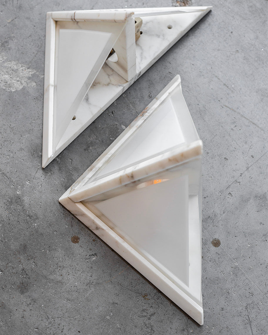 Lampy mají konstrukci z bílého carrara mramoru a skleněné výplně z mléčného skla. Dovezli jsme je z Itálie a odhadujeme, že pocházejí ze 70. let. Jsou určeny k montáži na zeď. Byly zkontrolovány elektrikářem a prodávají se společně s novými LED žárovkami. Uvedená cena je za pár.