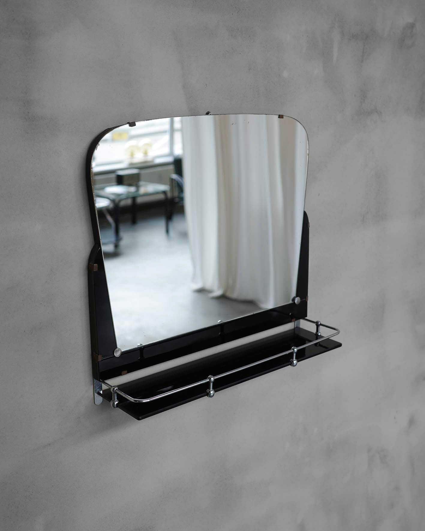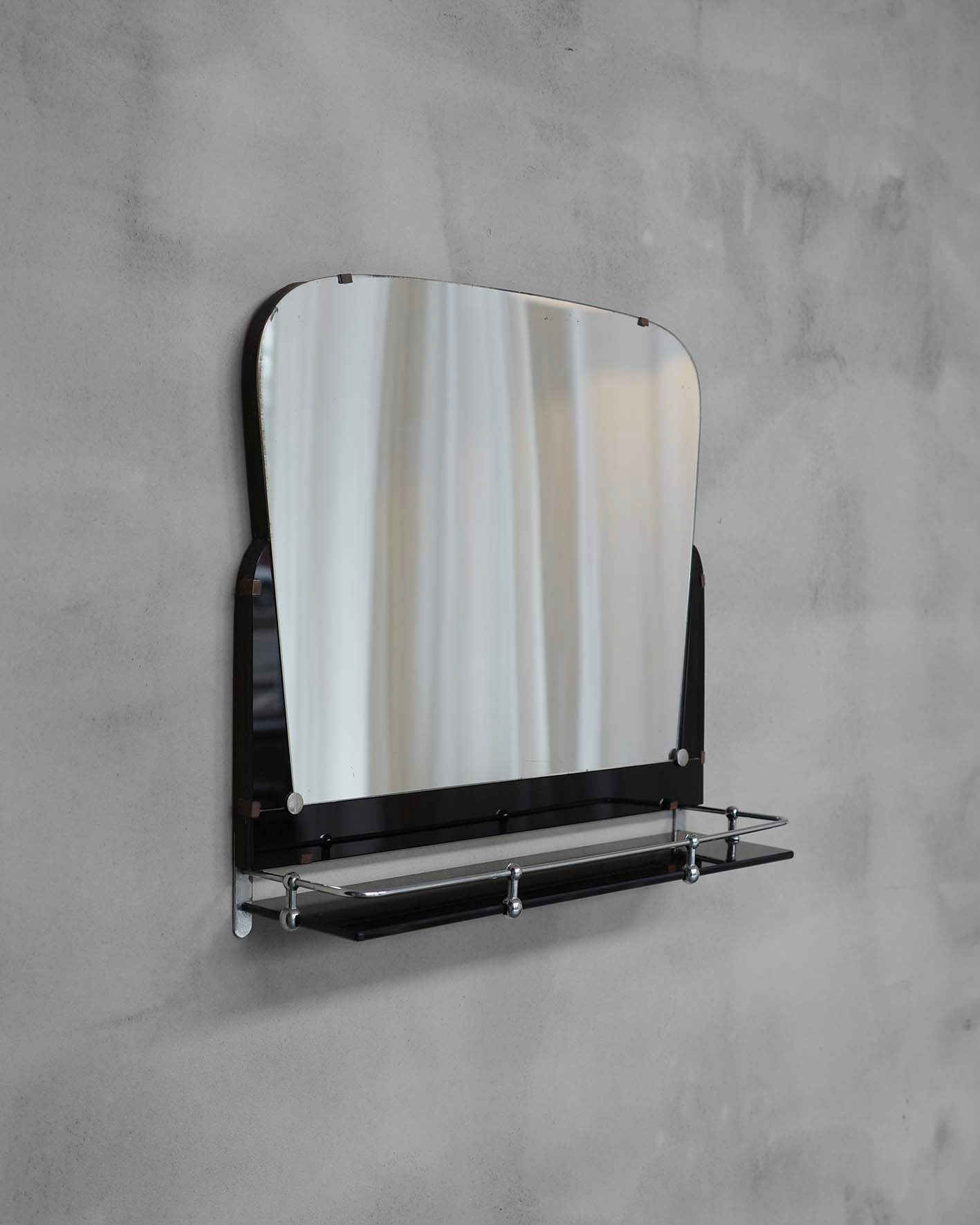 Nástěnné zrcadlo s poličkou z opaxitu. Minimalistický tvar, kovové detaily a praktická polička odrážejí estetiku modernismu 50. a 60. let. Jeho vzhled jej předurčuje k využití v předsíni nebo koupelně.