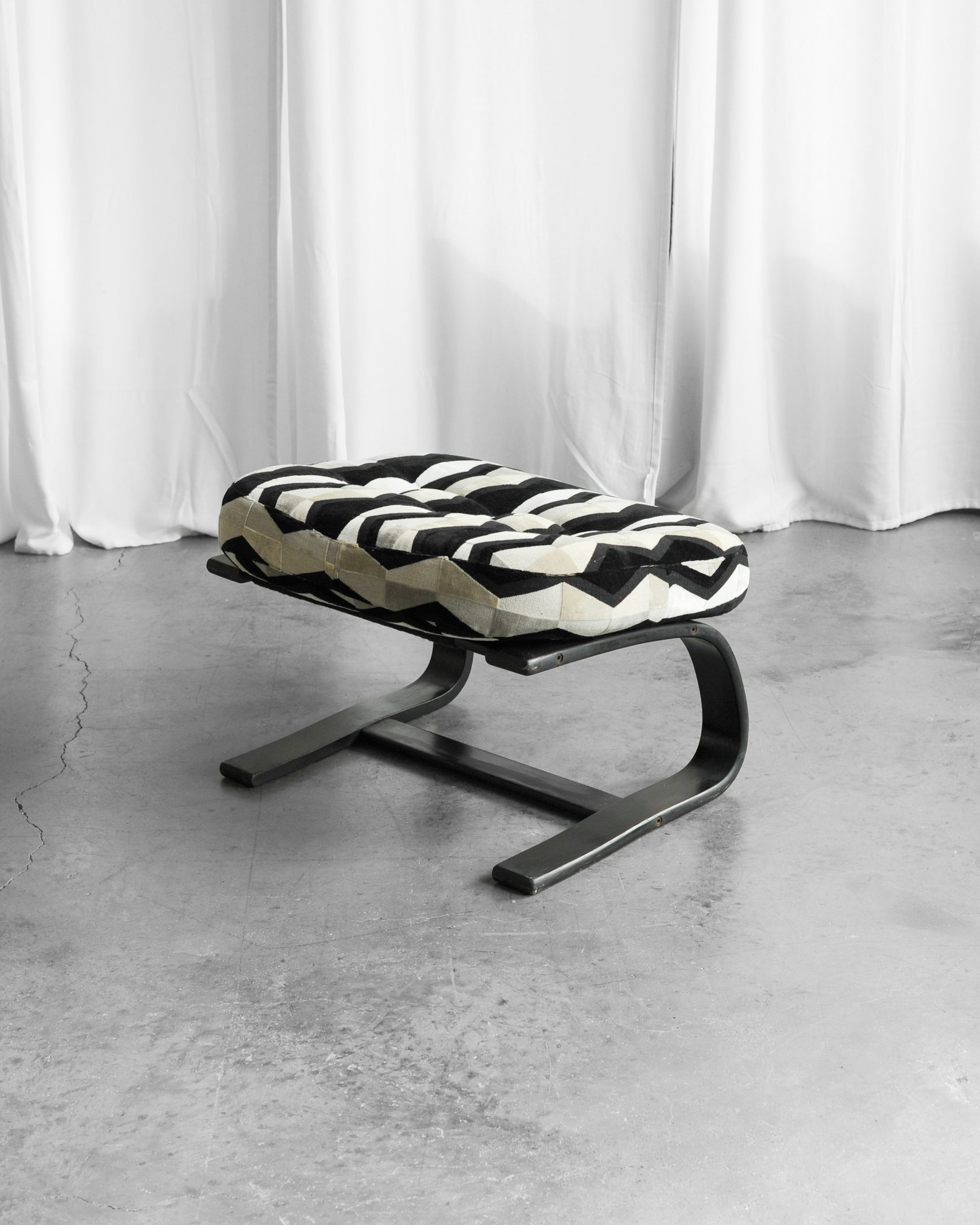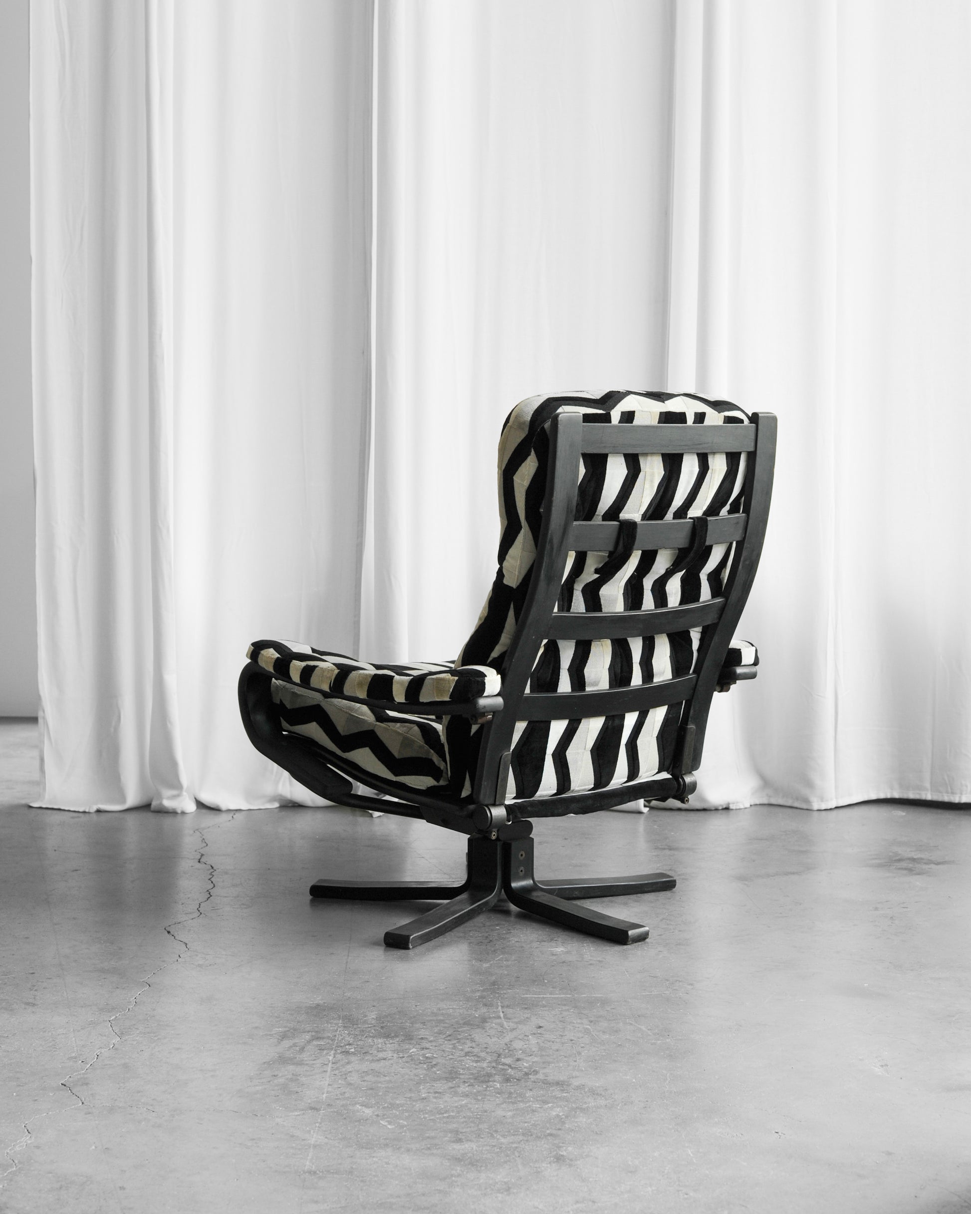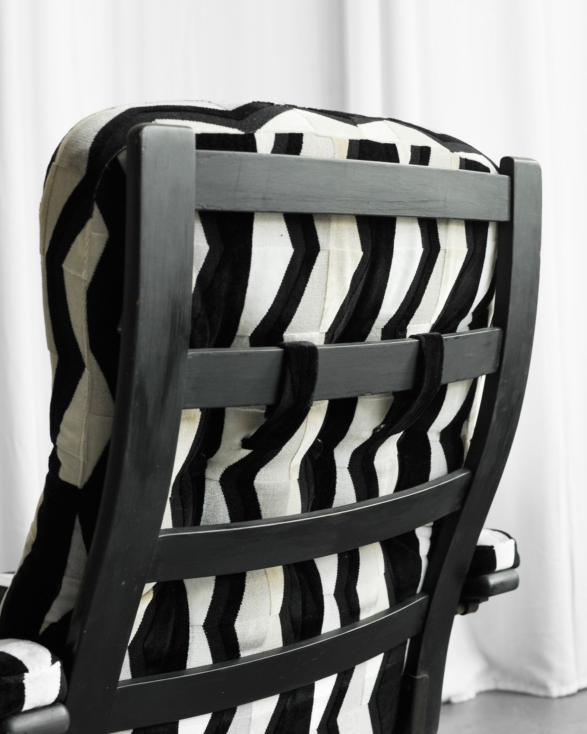 Křeslo s podnožkou jsme dovezli z Itálie a pochází ze 60. let. Dřevěná konstrukce má černou barvu a matné provedení. Je přečalouněno do kvalitní strukturované látky zn. JAB. Opěradlo lze polohovat a proto je křeslo velmi pohodlné, ideální pro relax, čtení nebo i odpolední „nap“.