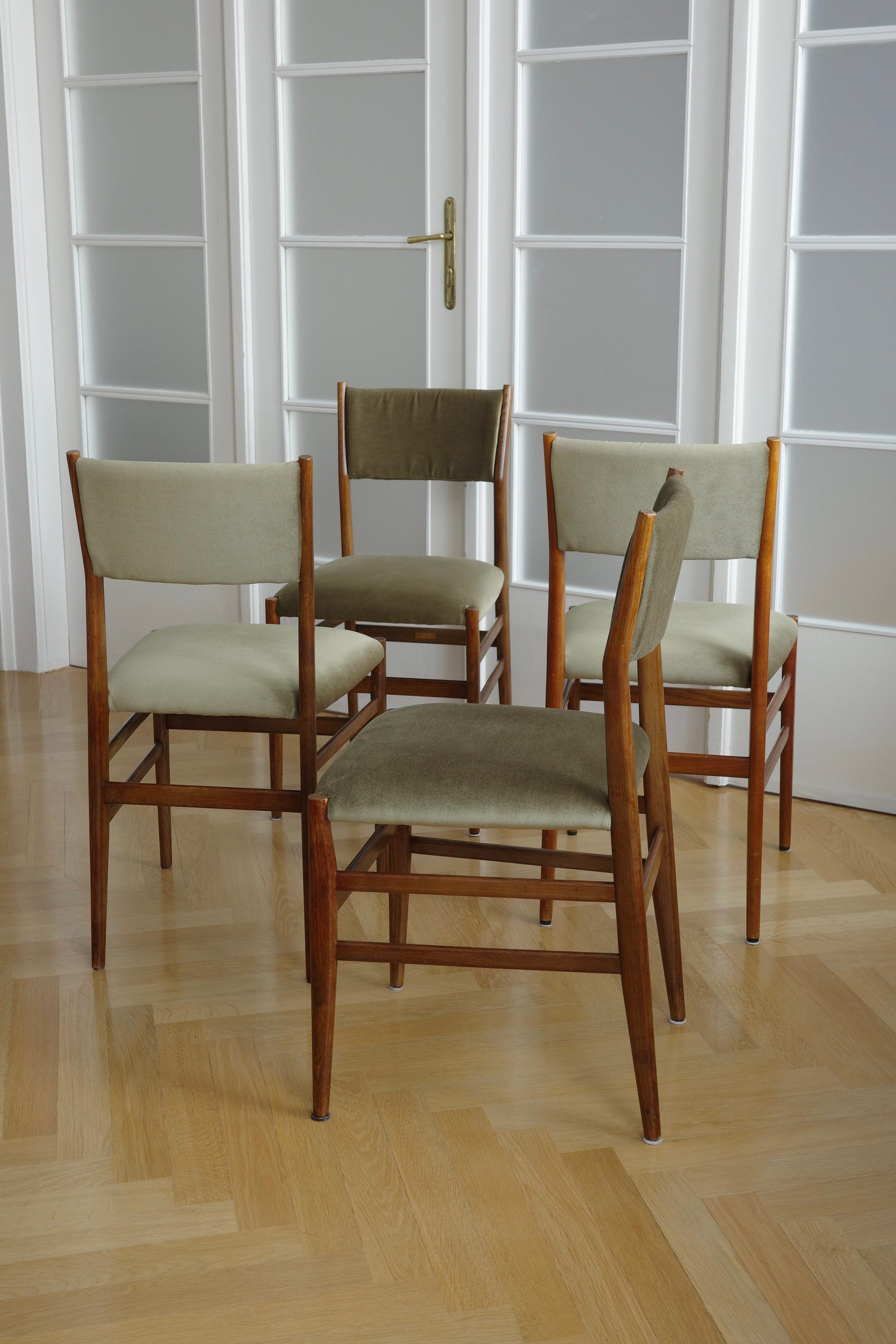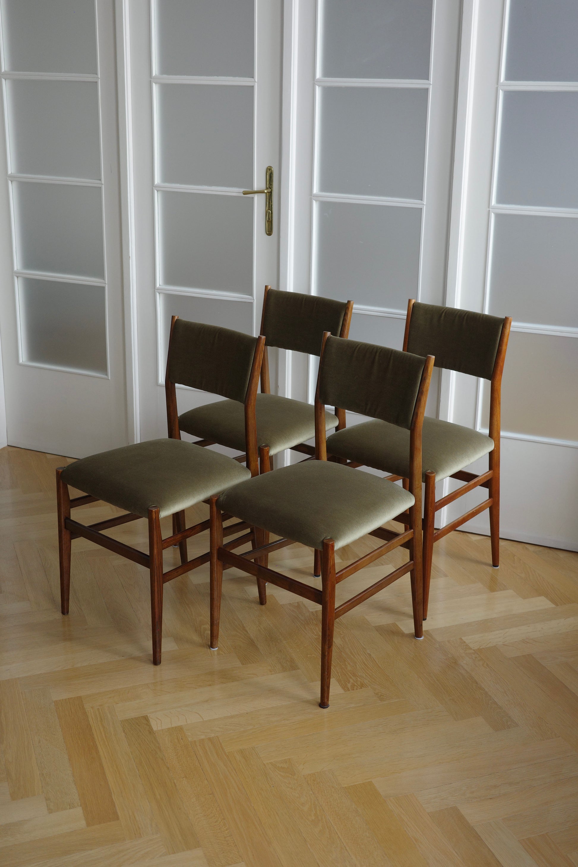 Sada čtyř ikonických židlí modelu LEGGERA, navržených legendárním designérem Giom Pontim a vyráběných renomovanou značkou Cassina od roku 1950. Židle vynikají svojí lehkou, ale pevnou konstrukcí z dubového dřeva, která odráží čistotu italského designu a řemesla. Na spodní straně se nacházejí původní štítky „Figli di Amedeo Cassina“, potvrzující autenticitu a původ těchto výjimečných kusů. Jedná se o vzácný sběratelský artefakt s nadčasovou elegancí.