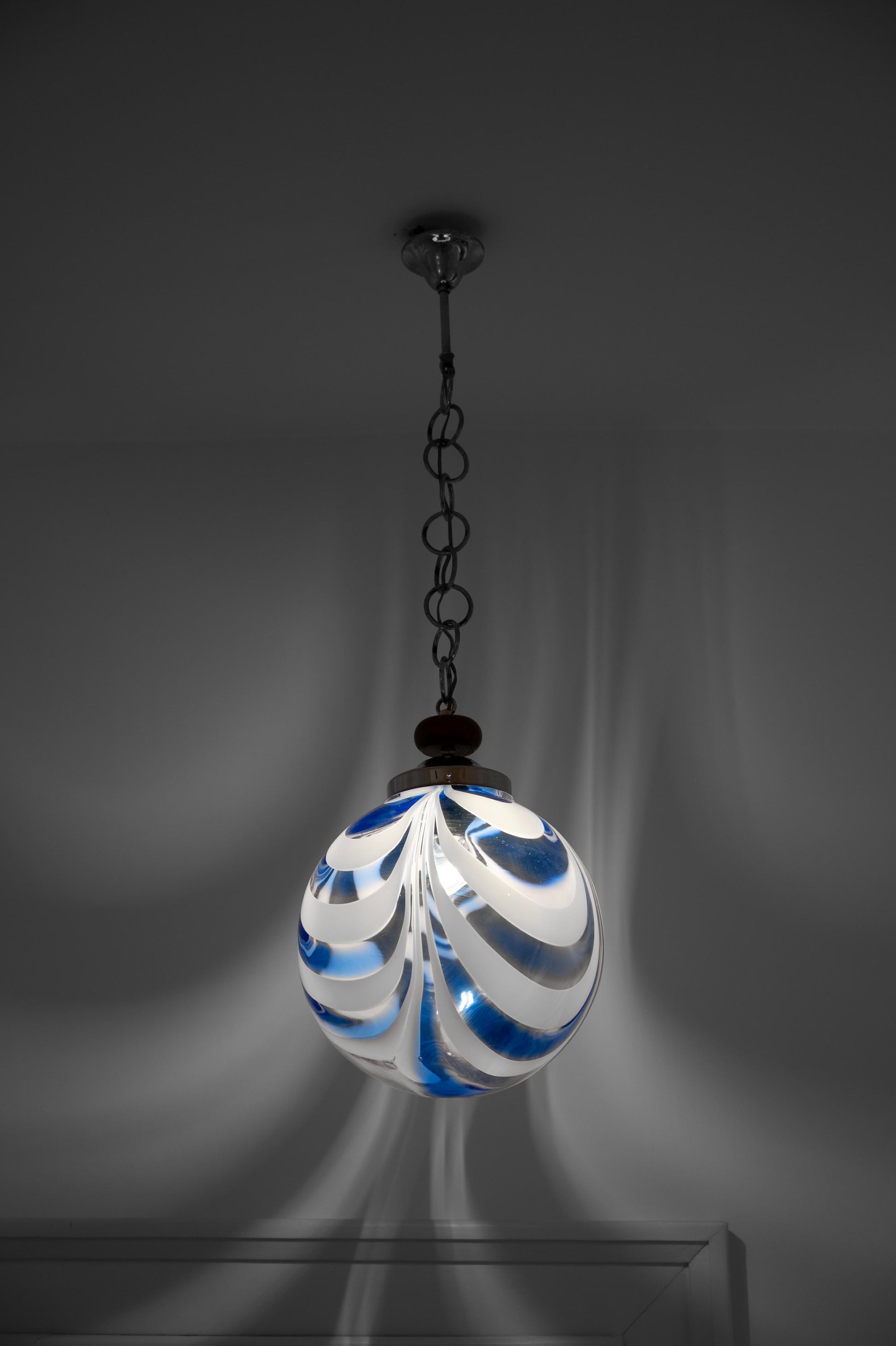 Lustr ve stylu Space Age z ručně foukaného muránského skla s jemným přelivem bílé, modré a čiré barvy. Připisuje se italské sklářské značce Mazzega, přibližně ze 70. let.