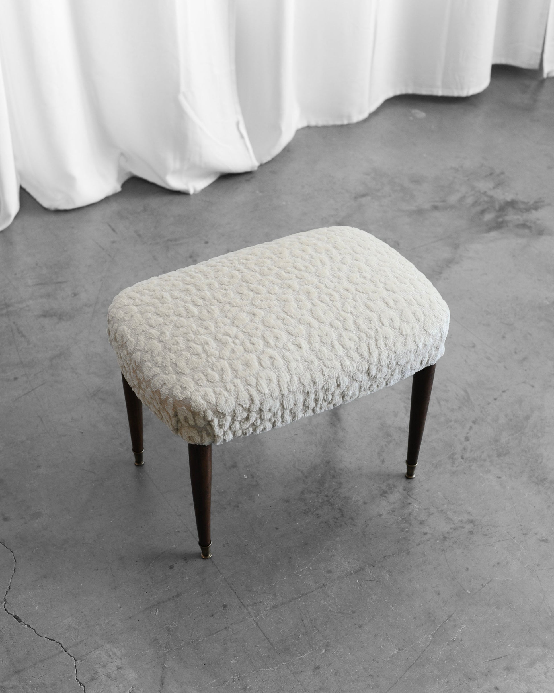 Taburetka je po kompletní renovaci, nohy jsme namořili na barvu ořechu a vyleštili mosazné koncovky. Kvalitní látka má leopardí vzor ve smetanové barvě.