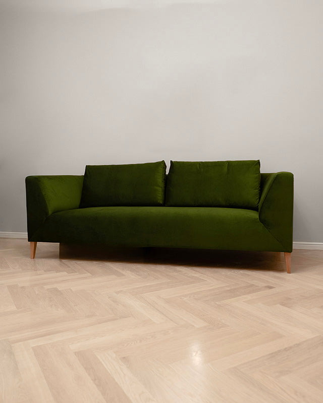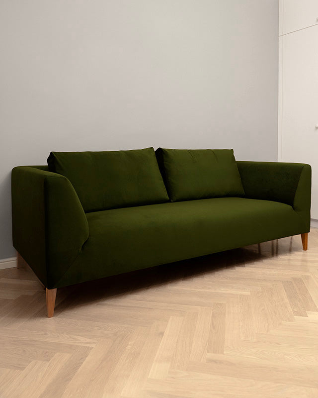 Sedačku jsme přečalounili do krásného zeleného sametu. Elegantní a nadčasová barvou i tvarem. Polštáře jsou plněné kachním peřím a dají se odložit, čímž se vytvoří velká plocha k sezení nebo pro příležitostné spaní pro jednoho člověka.