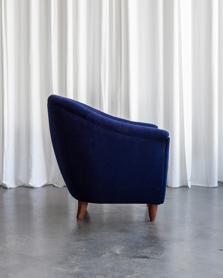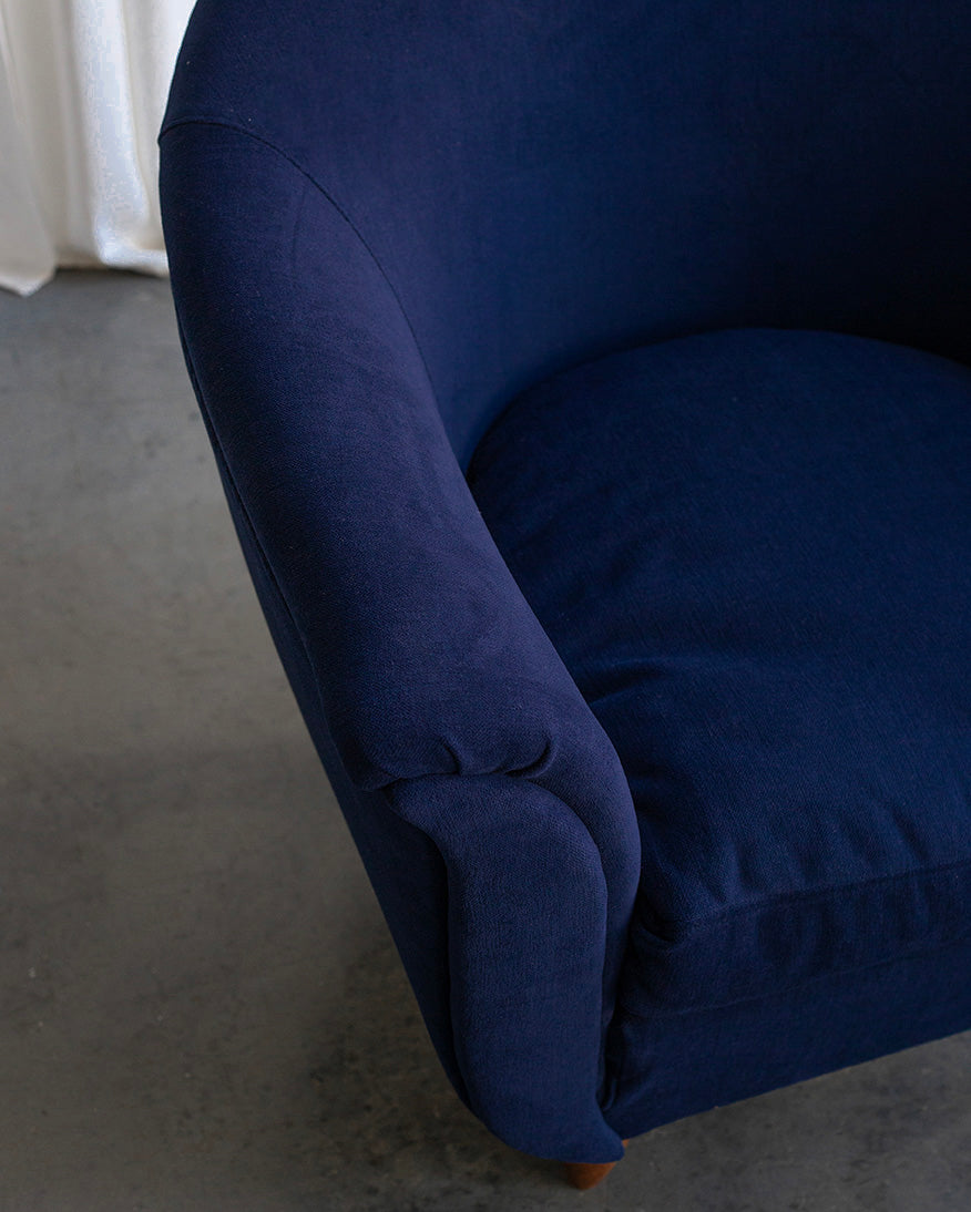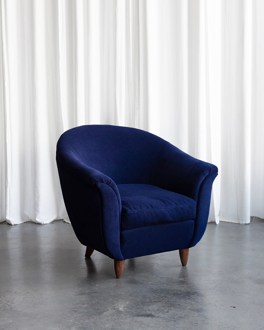 We have reupholstered the Italian armchairs in a dark blue high-quality fabric. They come from the 1940s and their shape of a blooming tulip is typical of the Art Deco period. The cushions in the seat are filled with duck feathers. They have a built-in zipper. They are also available separately.