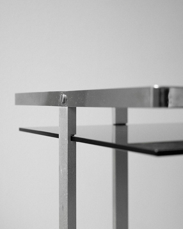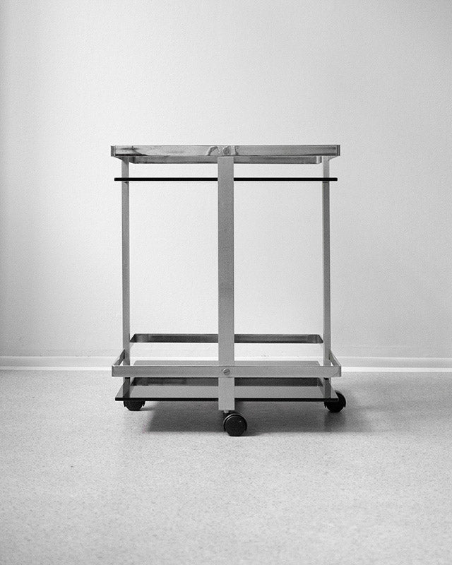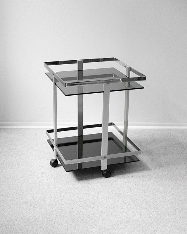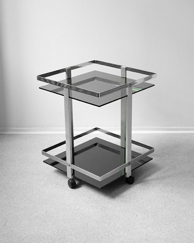 A minimalist serving trolley from the 80s with smoked glass and an elegant chrome structure. Its graphic square silhouette and delicate wheels make it a practical yet stylish accessory. It is perfect as a bar table or a striking solitaire.