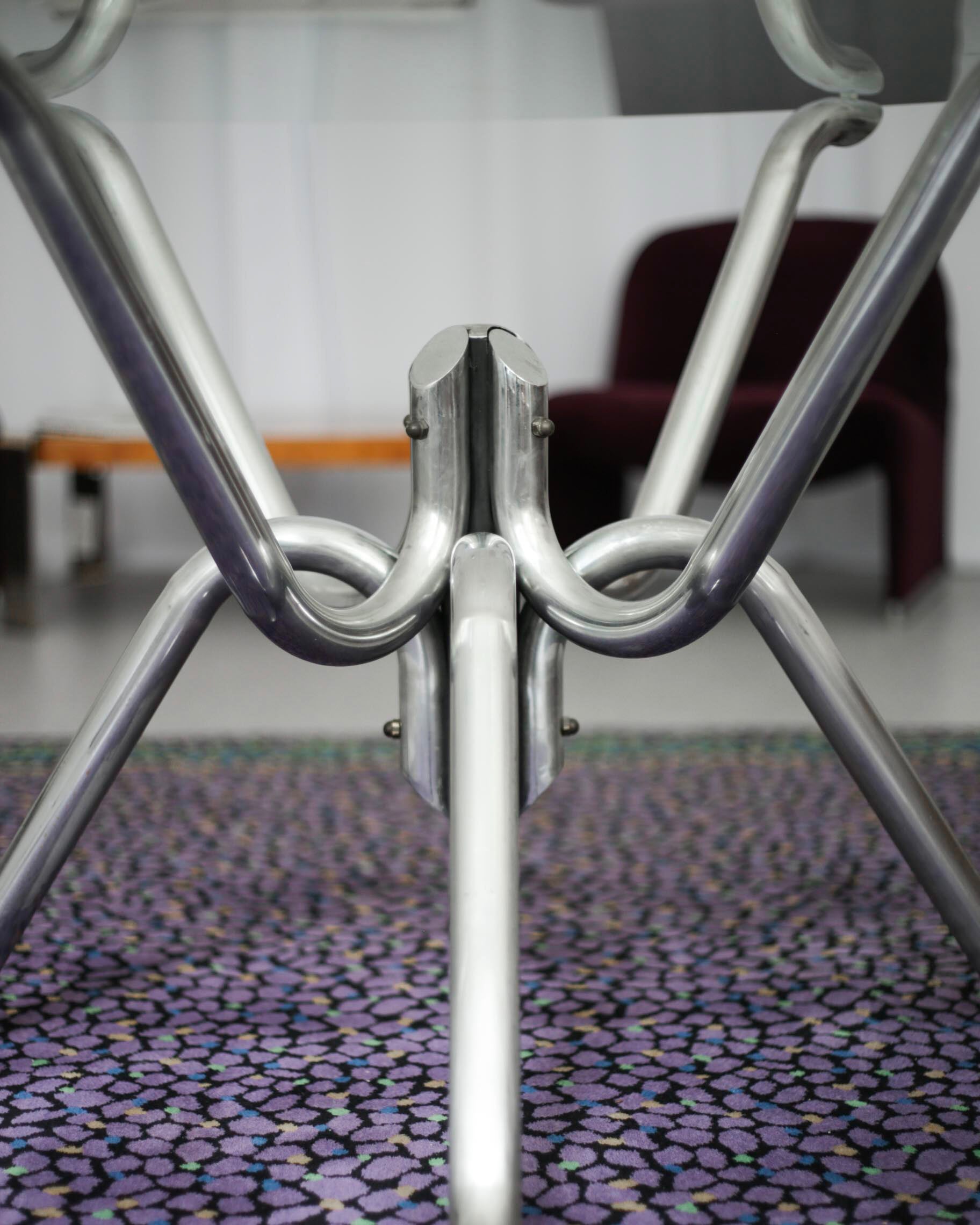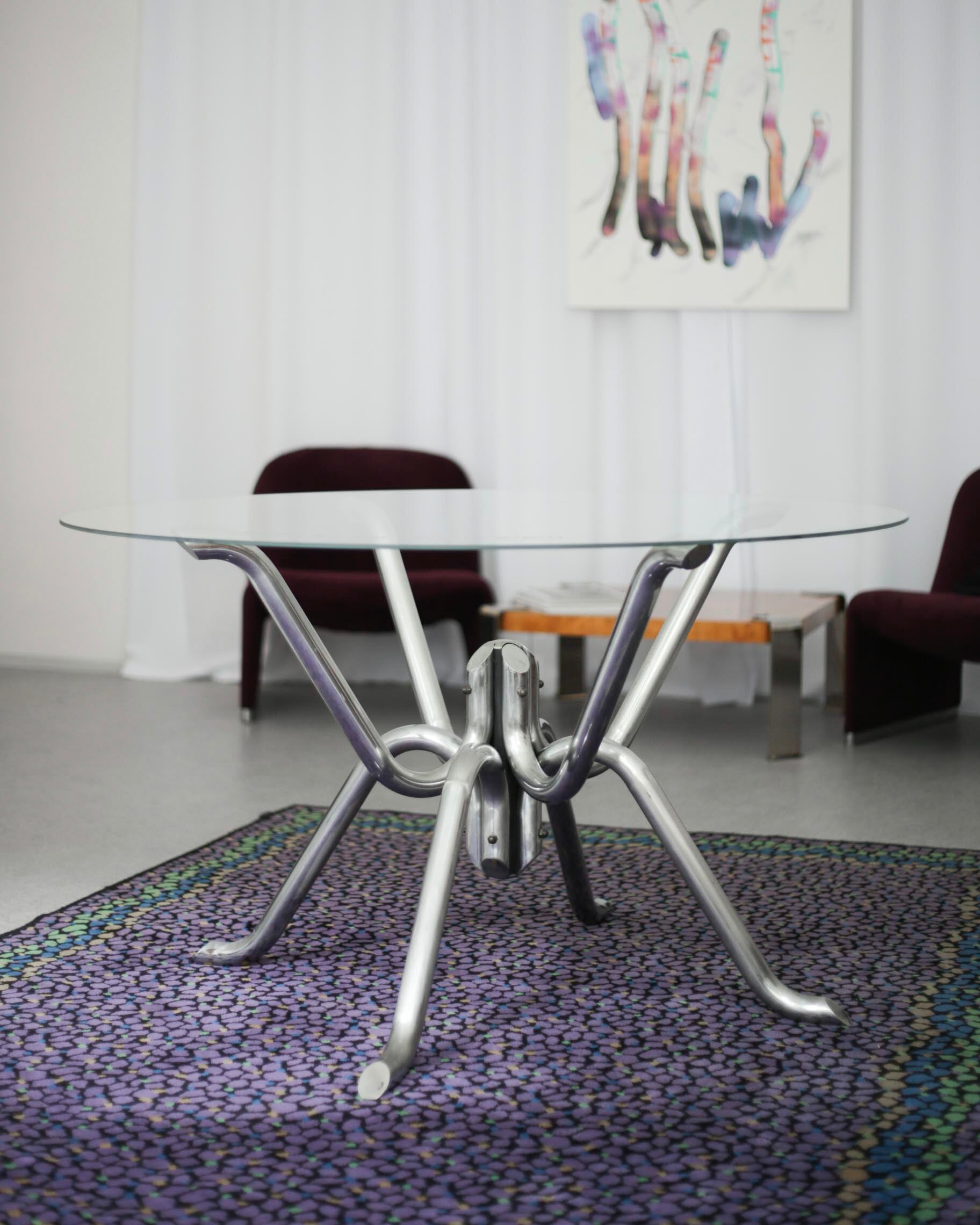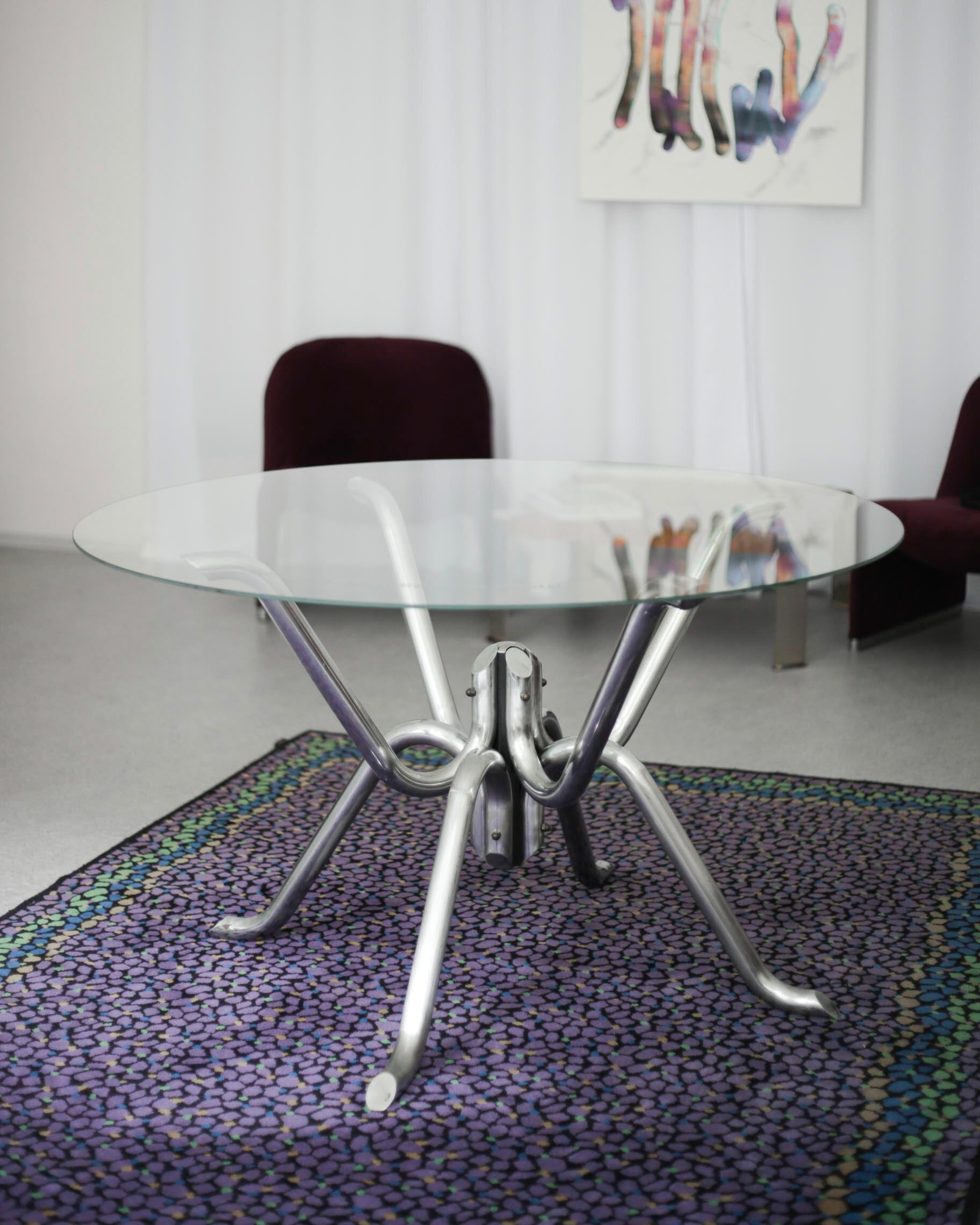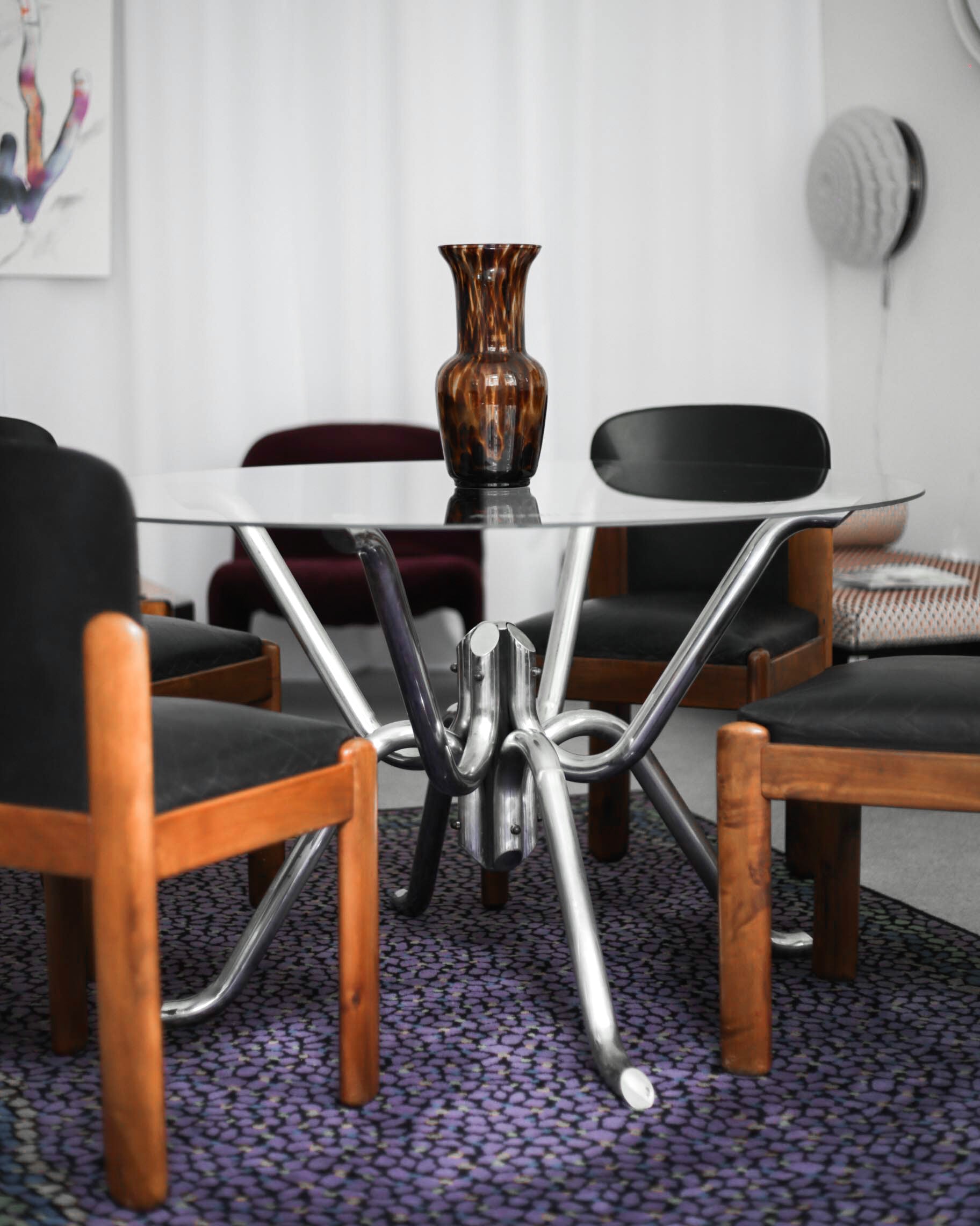 The dining table has a chrome structure and comes from Belgium. The top glass has a new cut with a diameter of 120 cm. Tables with this type of base are called “spider”.