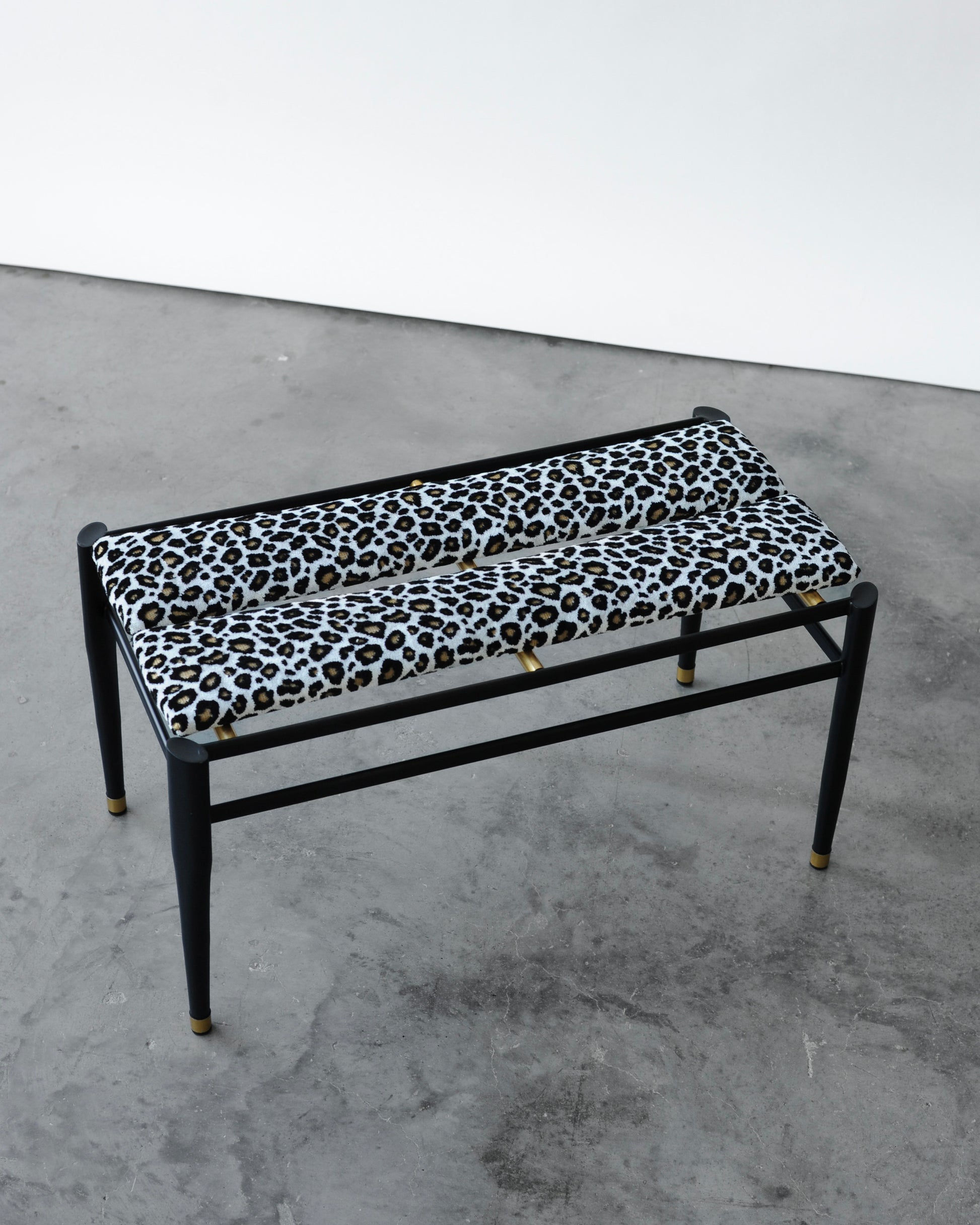 The Italian bench has undergone a complete overhaul. The metal structure has a new coating in matte black. We have reupholstered the seats in a beautiful high-quality fabric with a leopard pattern. It has gold details in the seat.