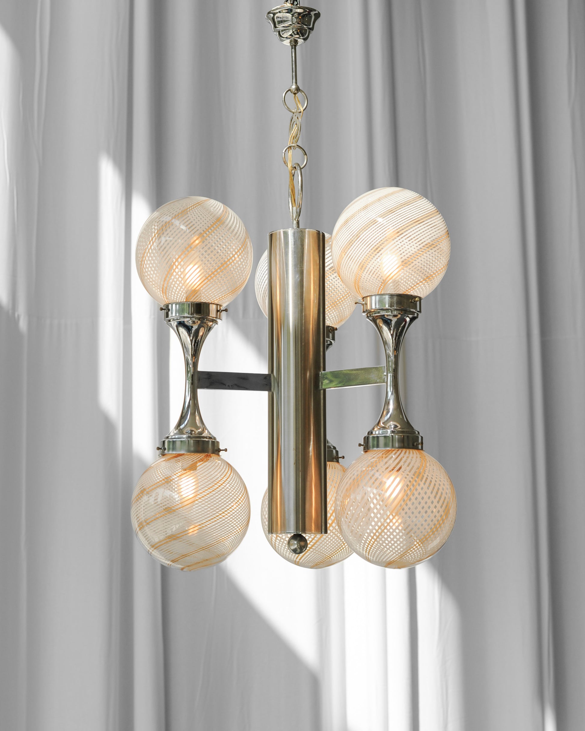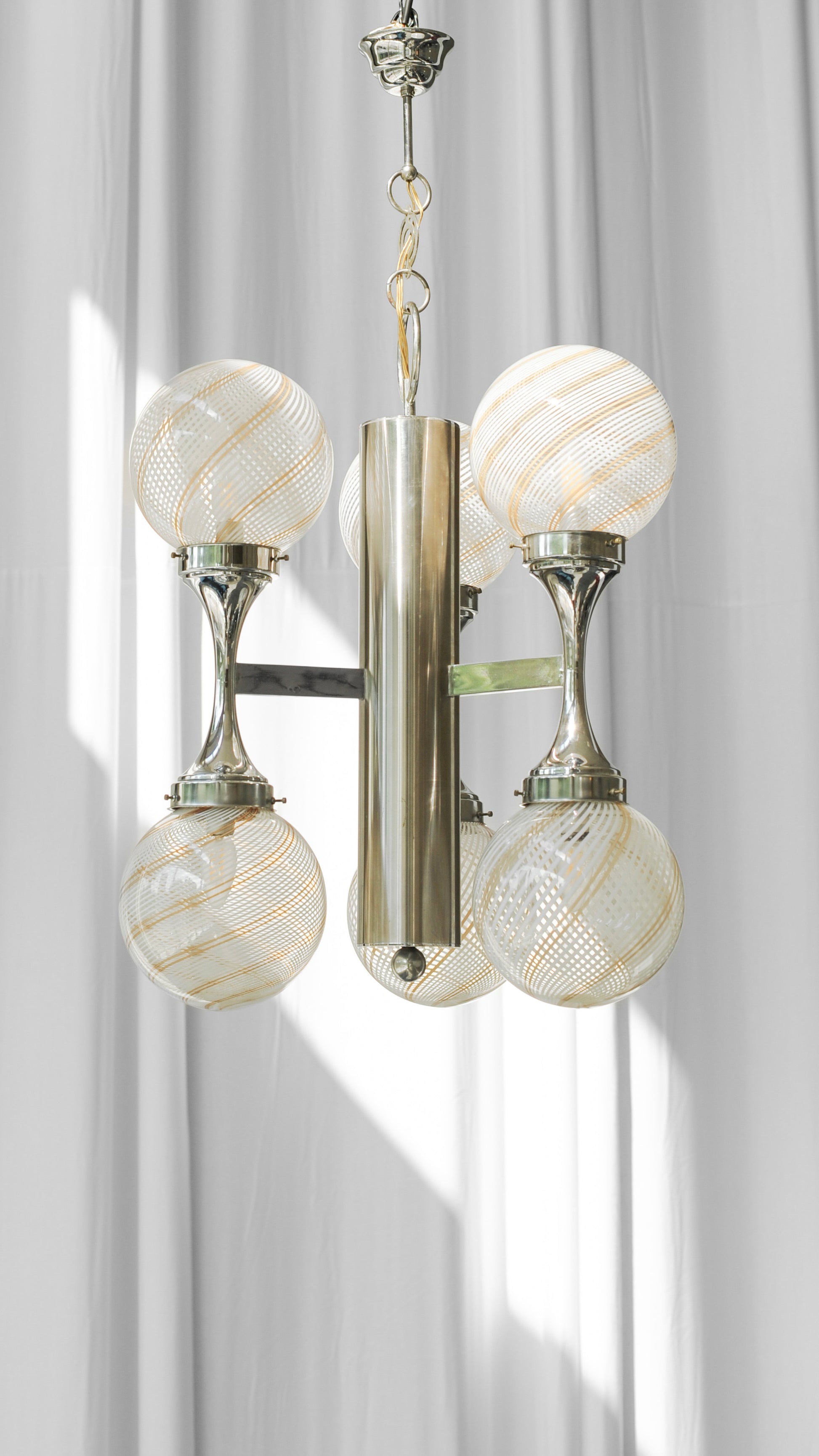 We imported the chrome chandelier from Italy. It has 6 lampshades made of Murano glass. The glass is transparent and has fine stripes of white and beige. Its design was inspired by space and is representative of the so-called space age design. The chandelier was checked by an electrician and is fully functional.