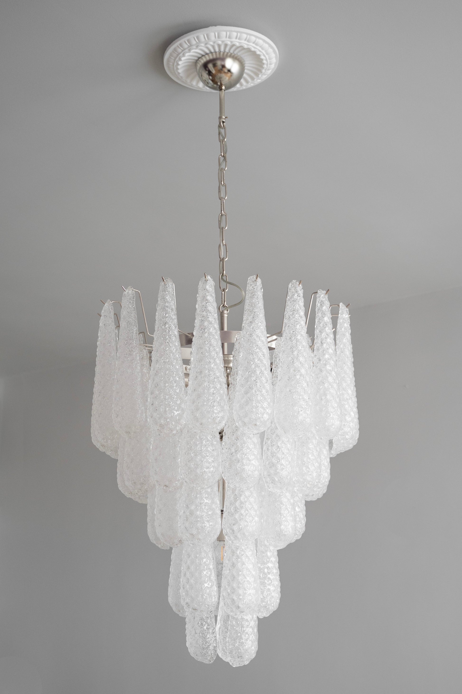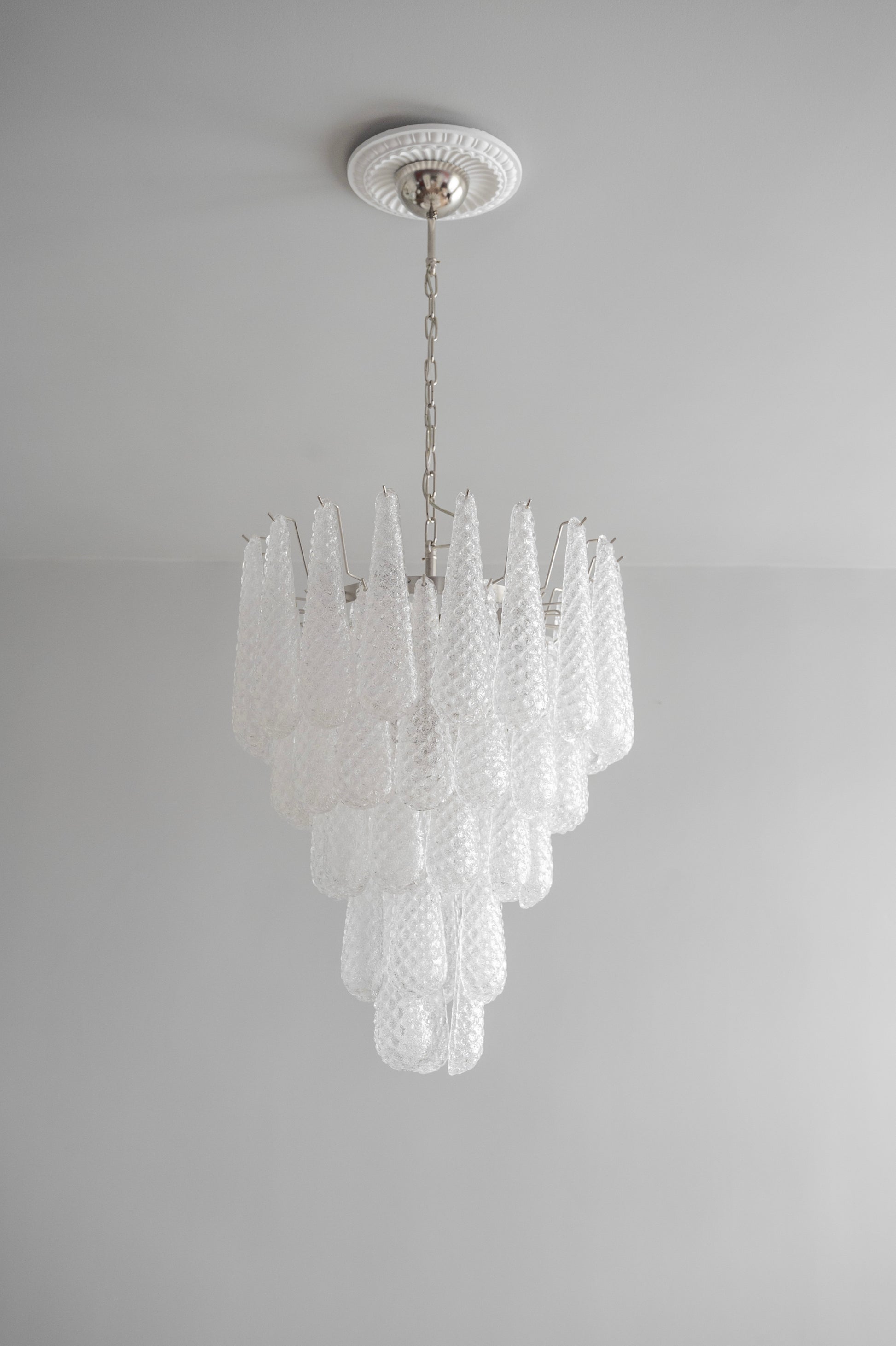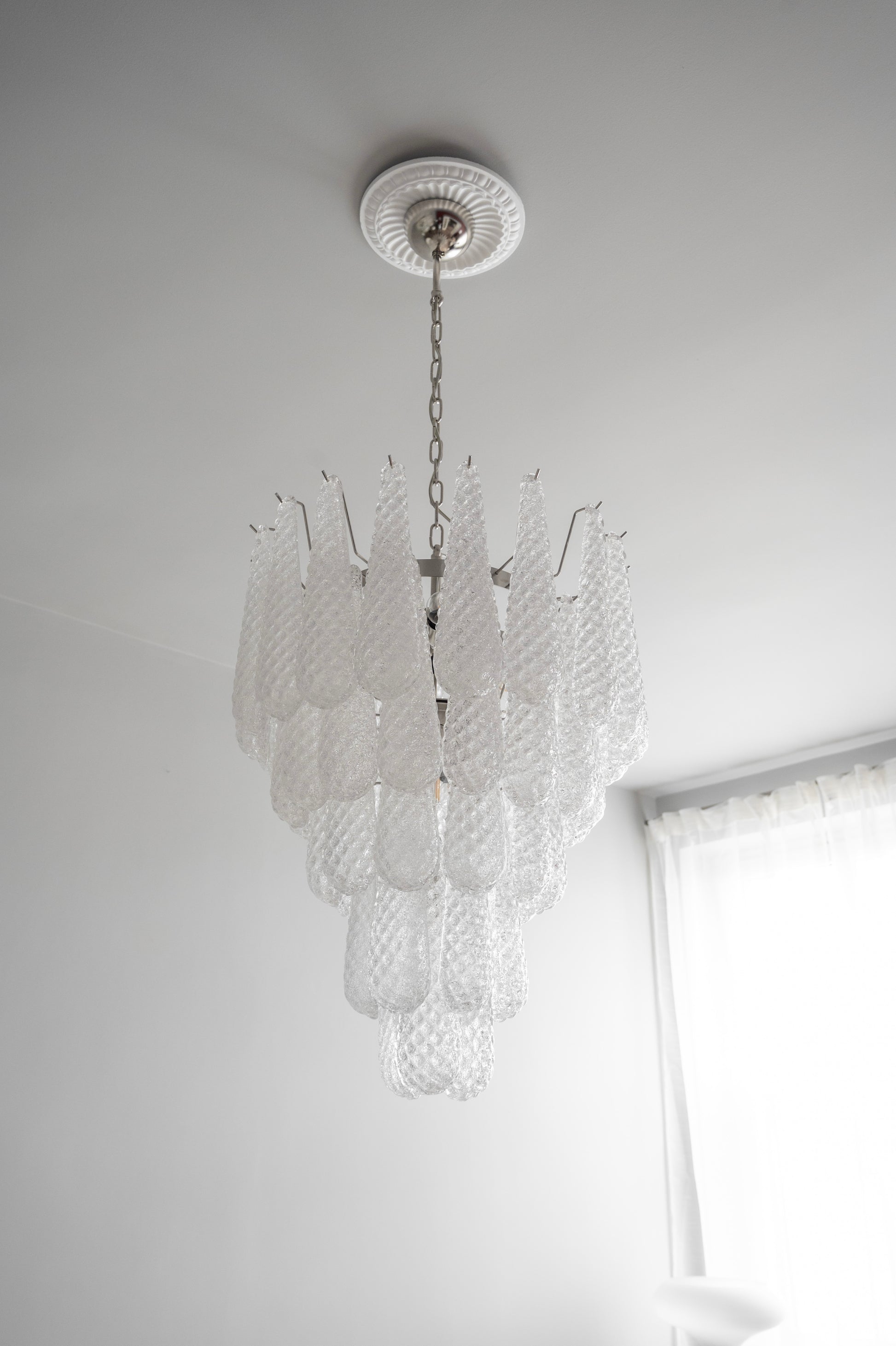 The chandelier has a new metal structure and wiring, on which petals made of Murano glass are suspended. The petals are made of transparent glass in the shape of drops. They have a structure on the surface, which is why the chandelier is white.