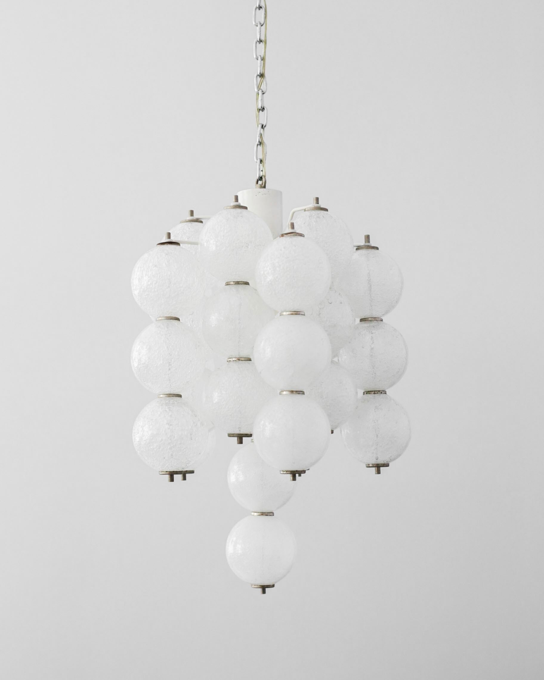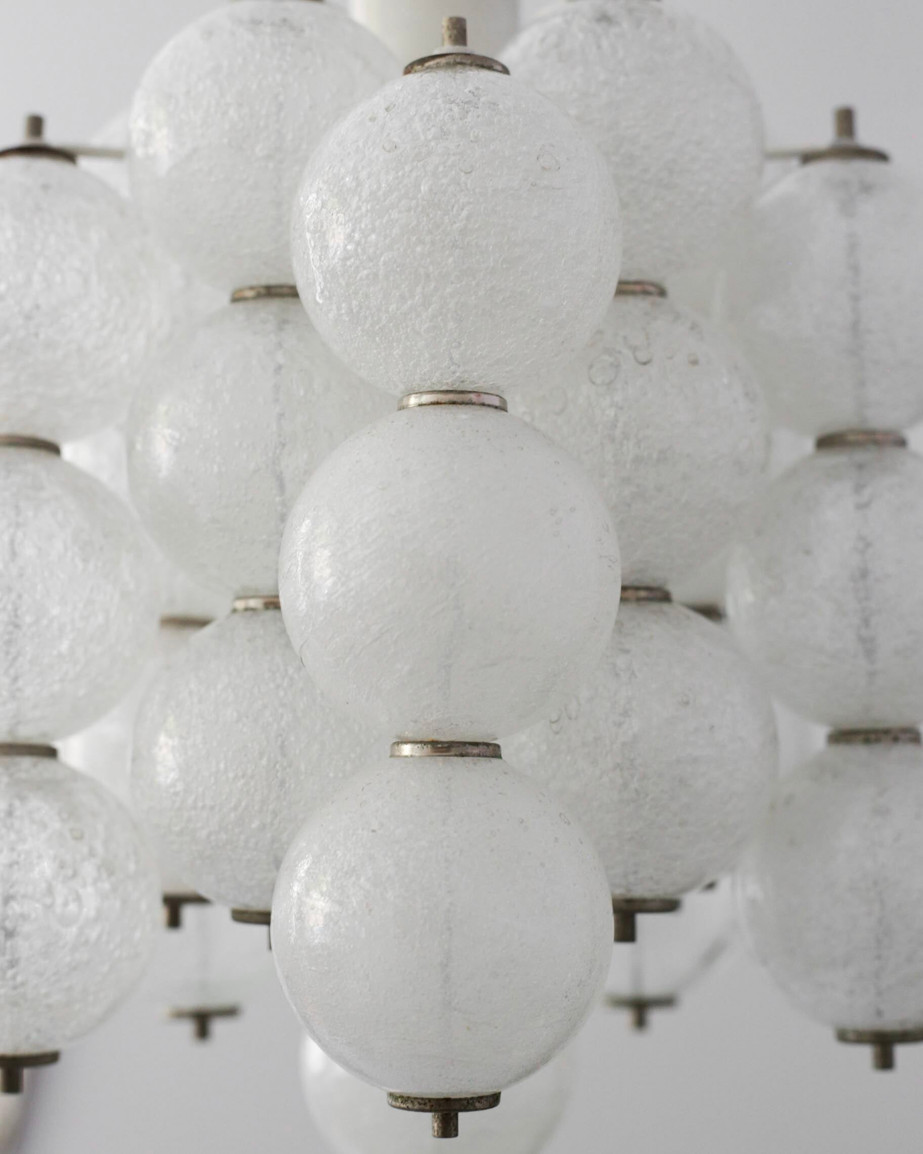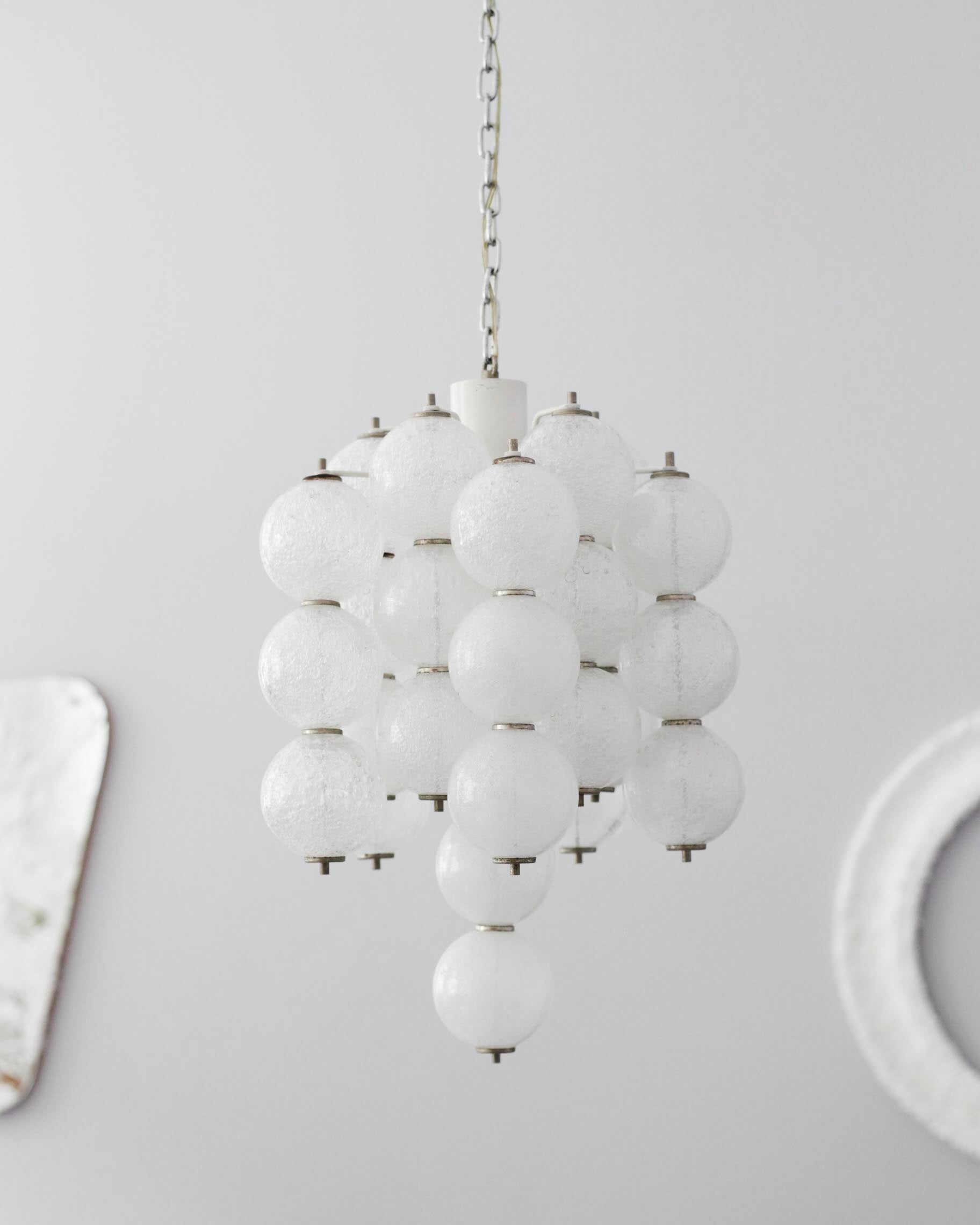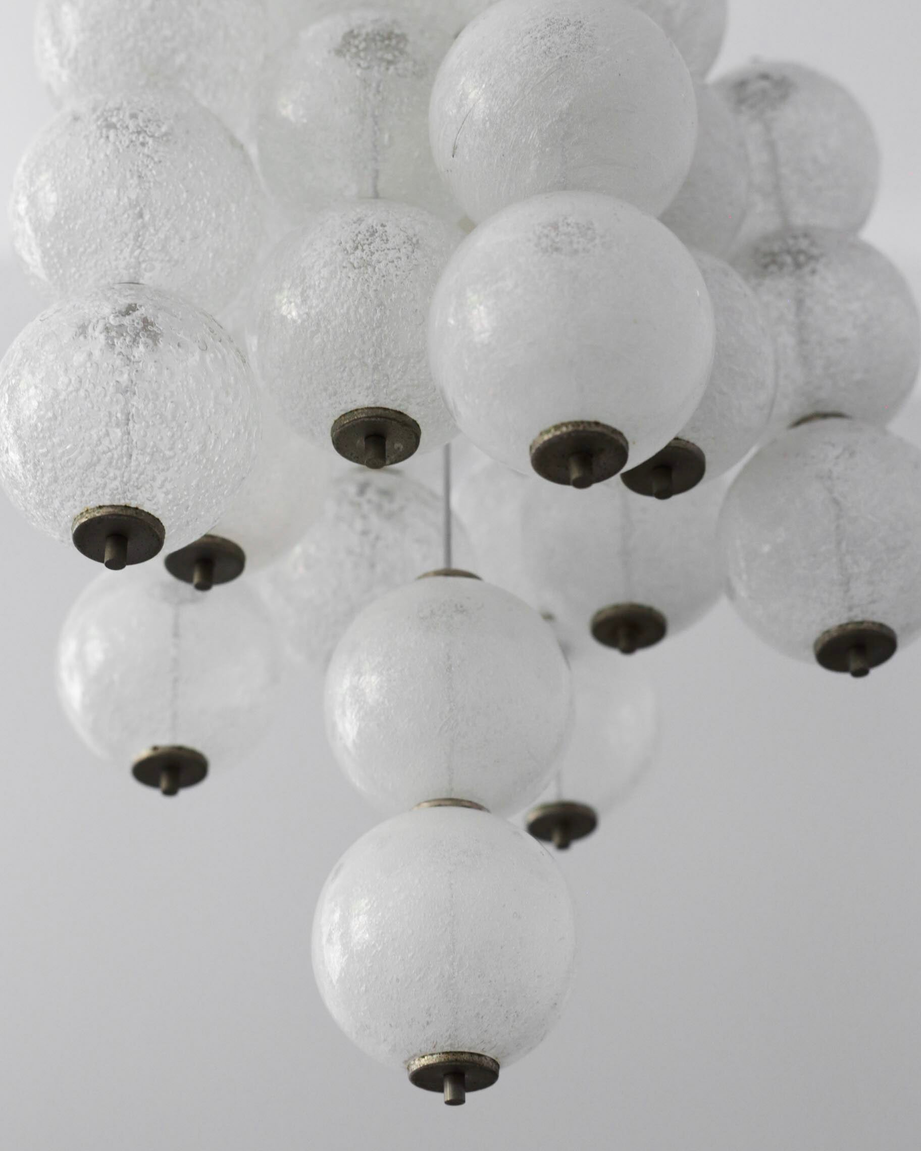The chandelier comes from the workshop of the famous Italian brand Mazzega. The glass balls are hand-blown from Murano glass and are mounted on a metal structure. We replaced the chain on which the chandelier hangs and it passed inspection. It has one E27 light source.