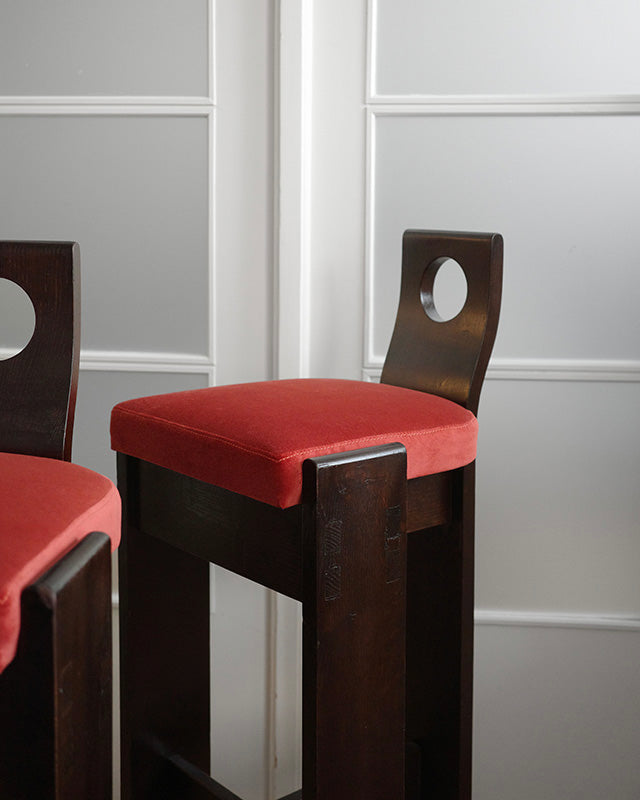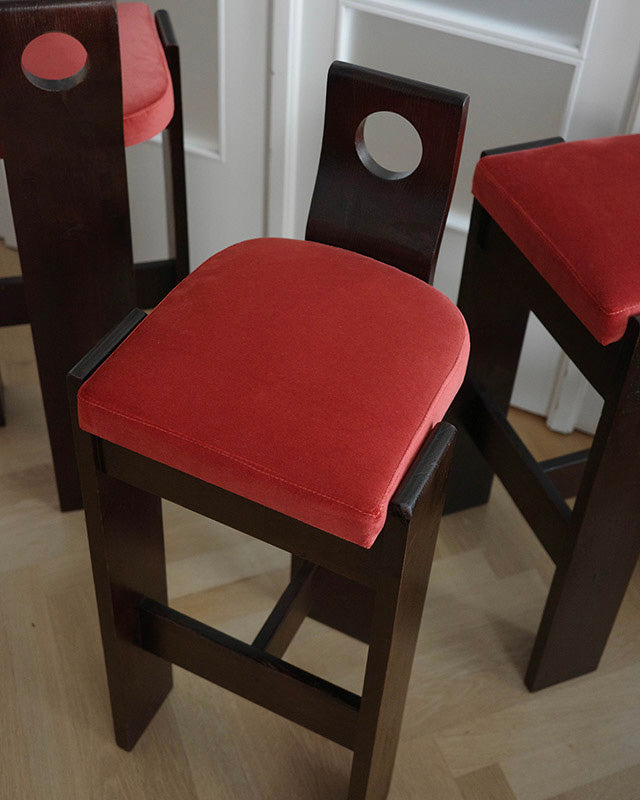 Set of 3 original Mid century bar stools with a sturdy dark wooden frame are complemented by newly reupholstered seats in a beautiful velvet fabric. The backrest with a circular hole serves not only as an interesting design element, but also as a practical handle for easy handling and underlines their brutalist character. The chairs have been restored and are ready to shine - whether at the kitchen island, in a stylish bar or in the lobby of your hotel or restaurant.