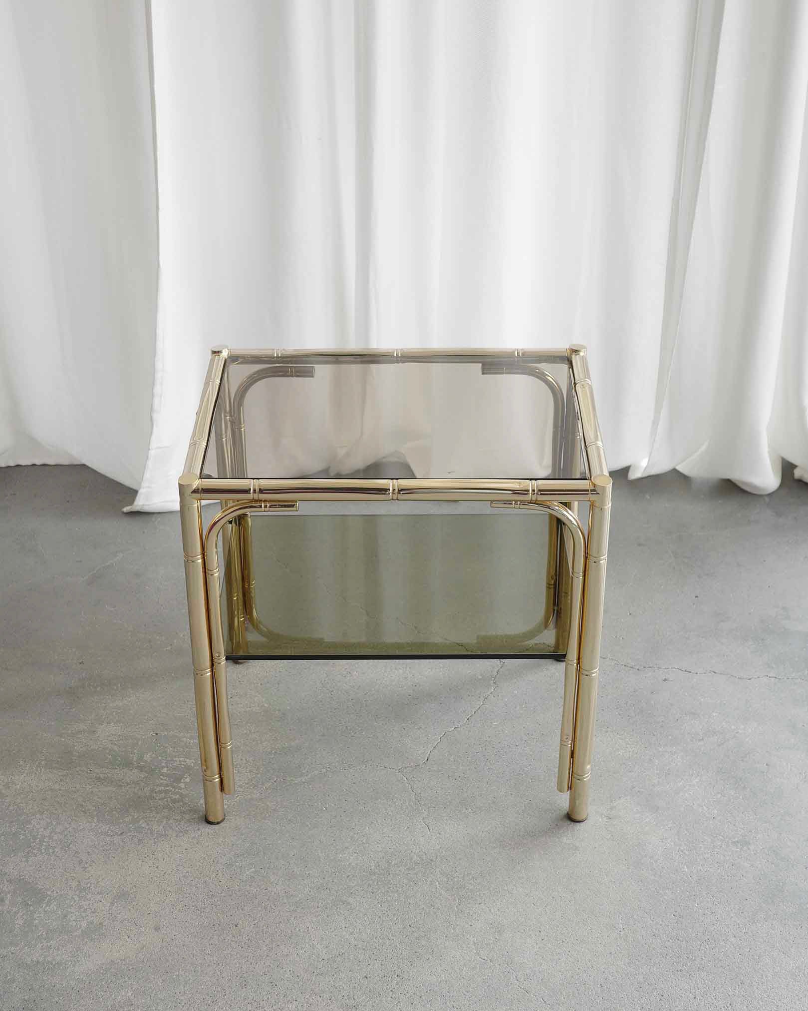French brass side table made of bamboo-like material. The table has two shelves made of smoked glass.