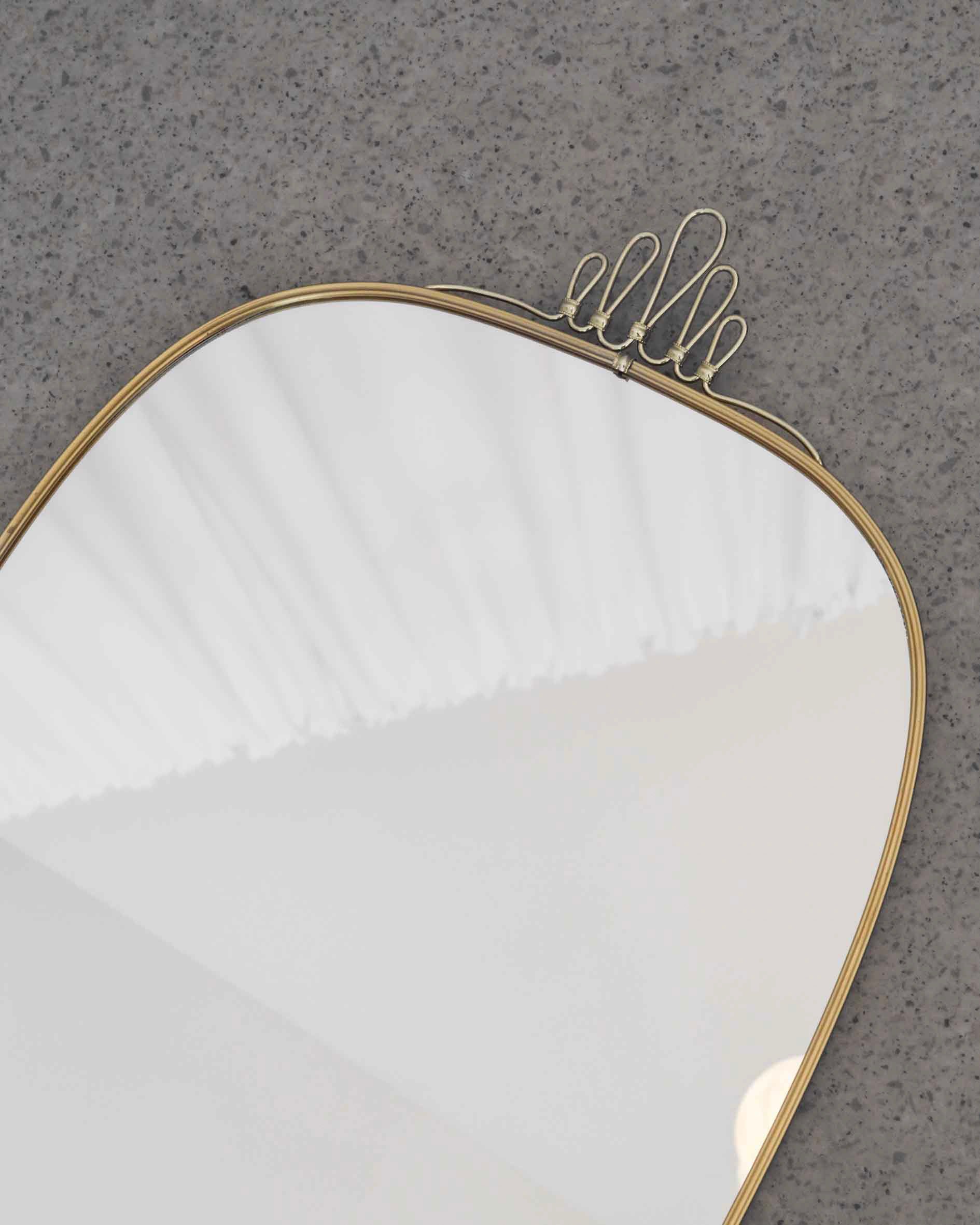 Elegant wall mirror from Italy from the 1950s with brass details and a wooden back. A piece with an Italian modernist atmosphere, inspired by the work of Gio Ponti.