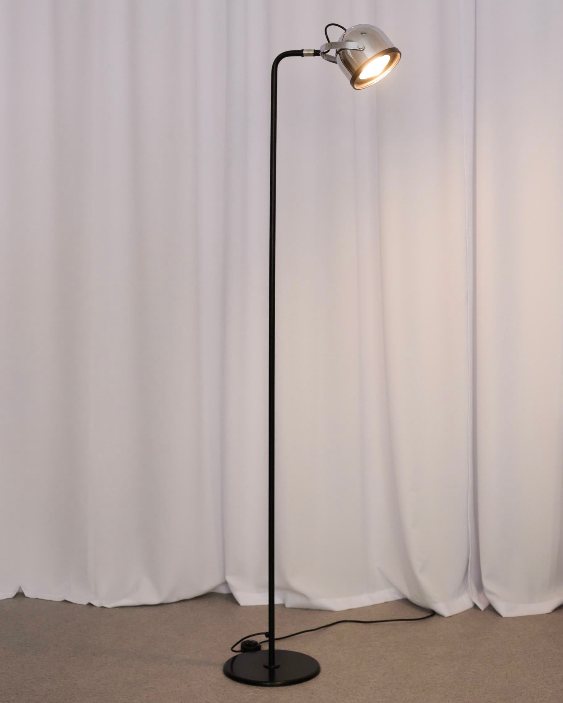 The lamp of the famous Italian brand Stilnovo comes from the 70s. It is made of metal - it has a black matte body and a chrome shade, the position of which can be adjusted. Marked on the metal. It has a foot switch, is fully functional and in excellent condition. One E27 source.