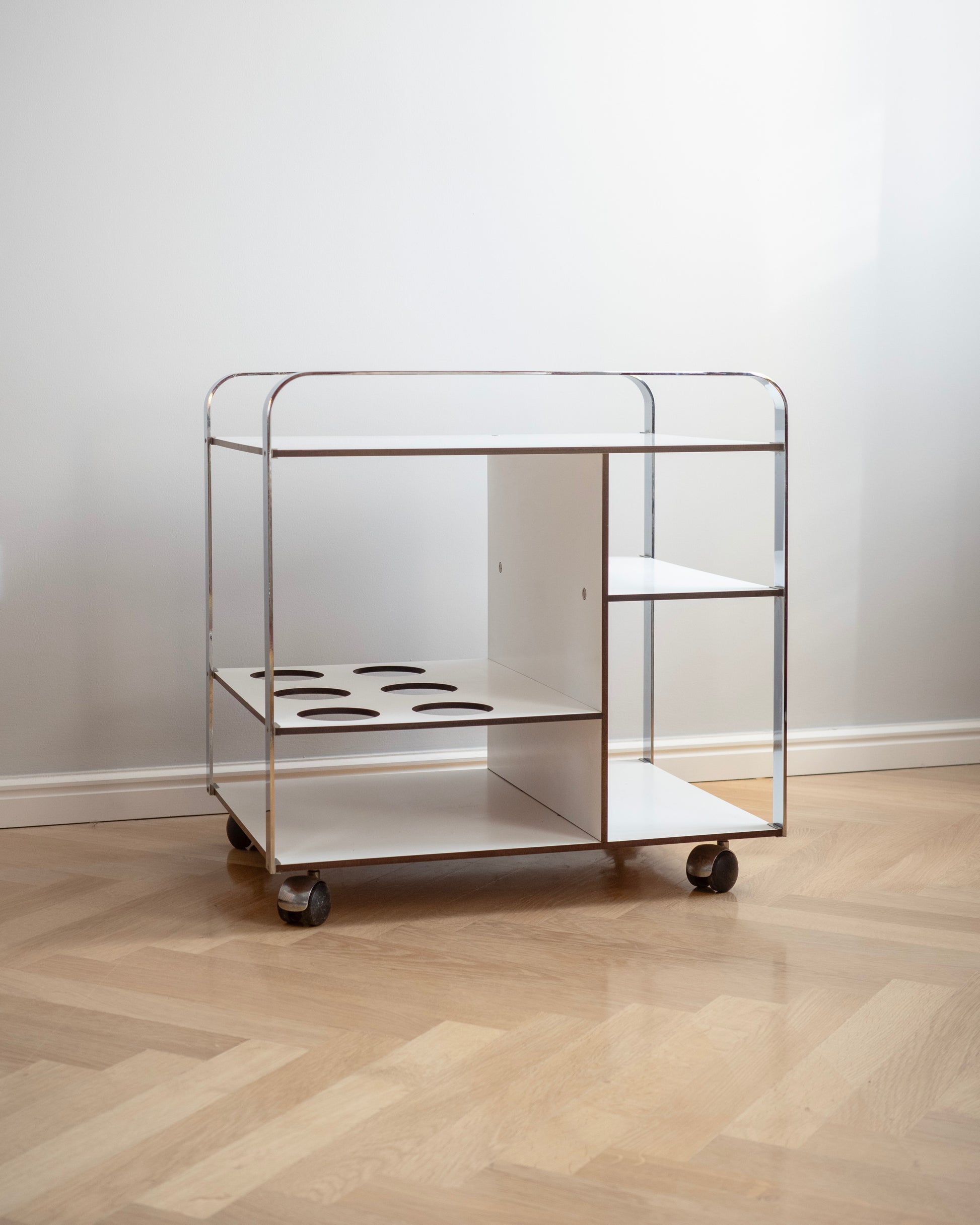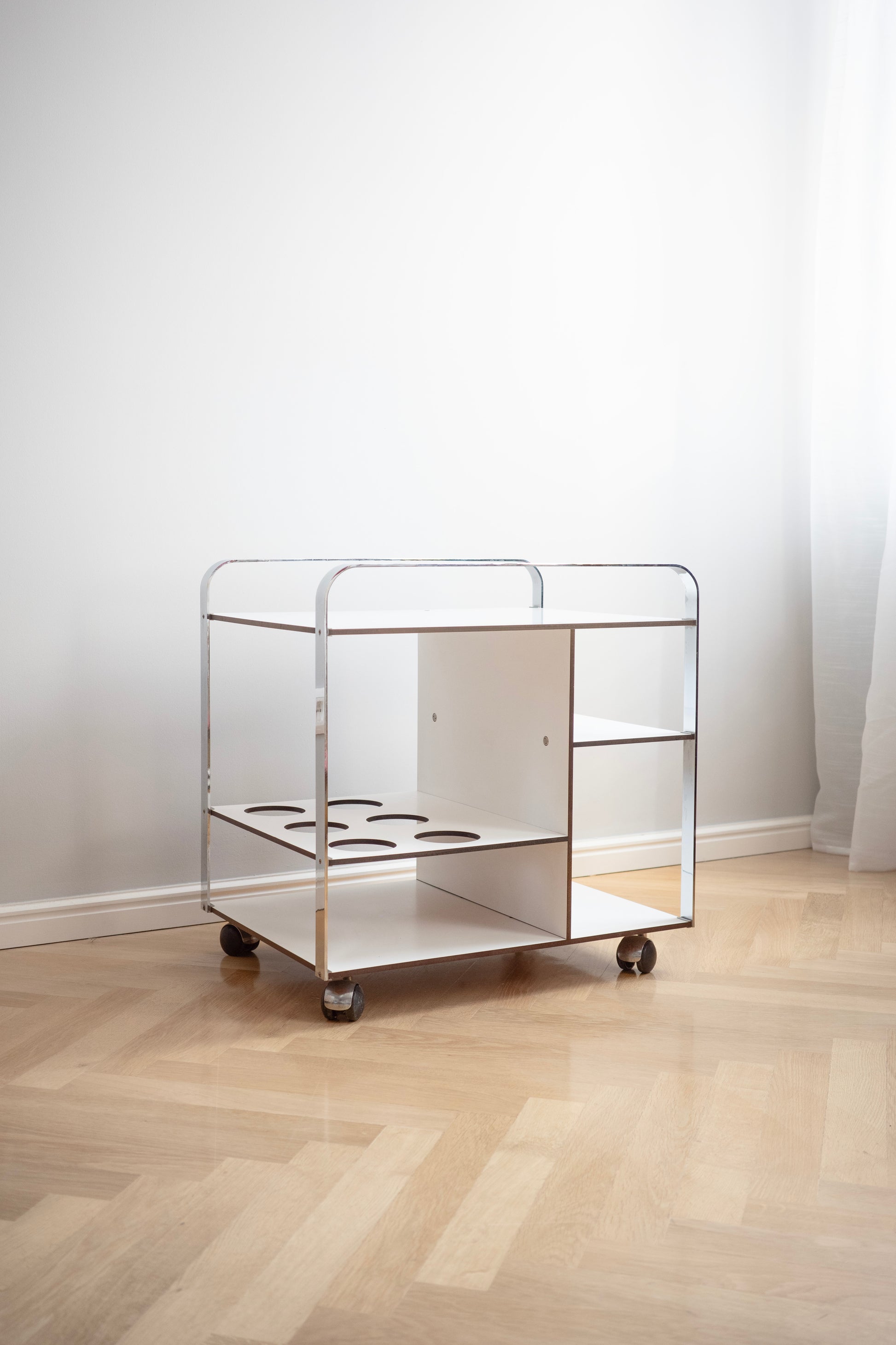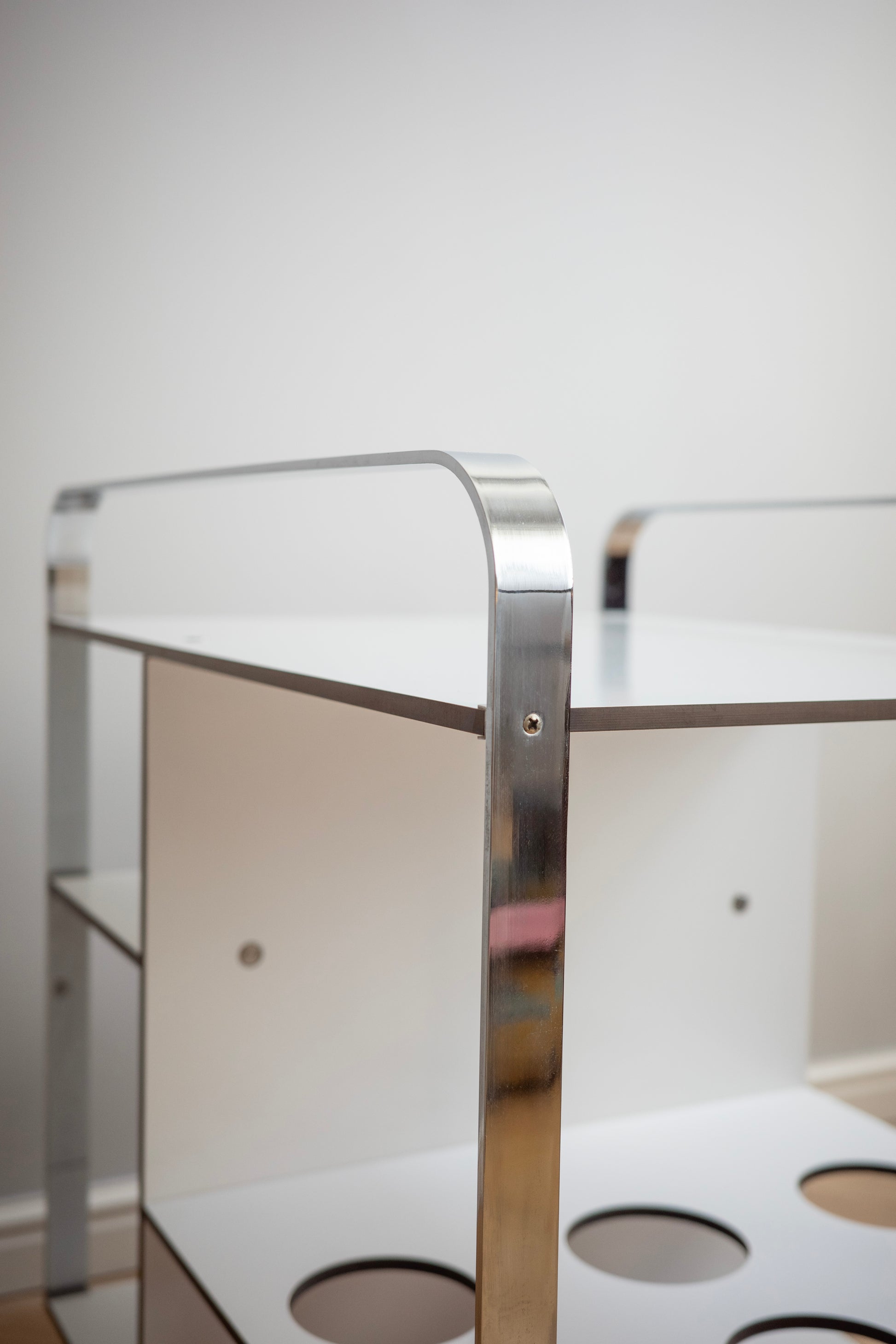 An architectural serving trolley from the 1980s with a chrome frame and white shelves. It has unusual compartments and a bottle holder that are reminiscent of Italian postmodern style. The trolley is on wheels, ideal as a mobile bar or a practical accessory.