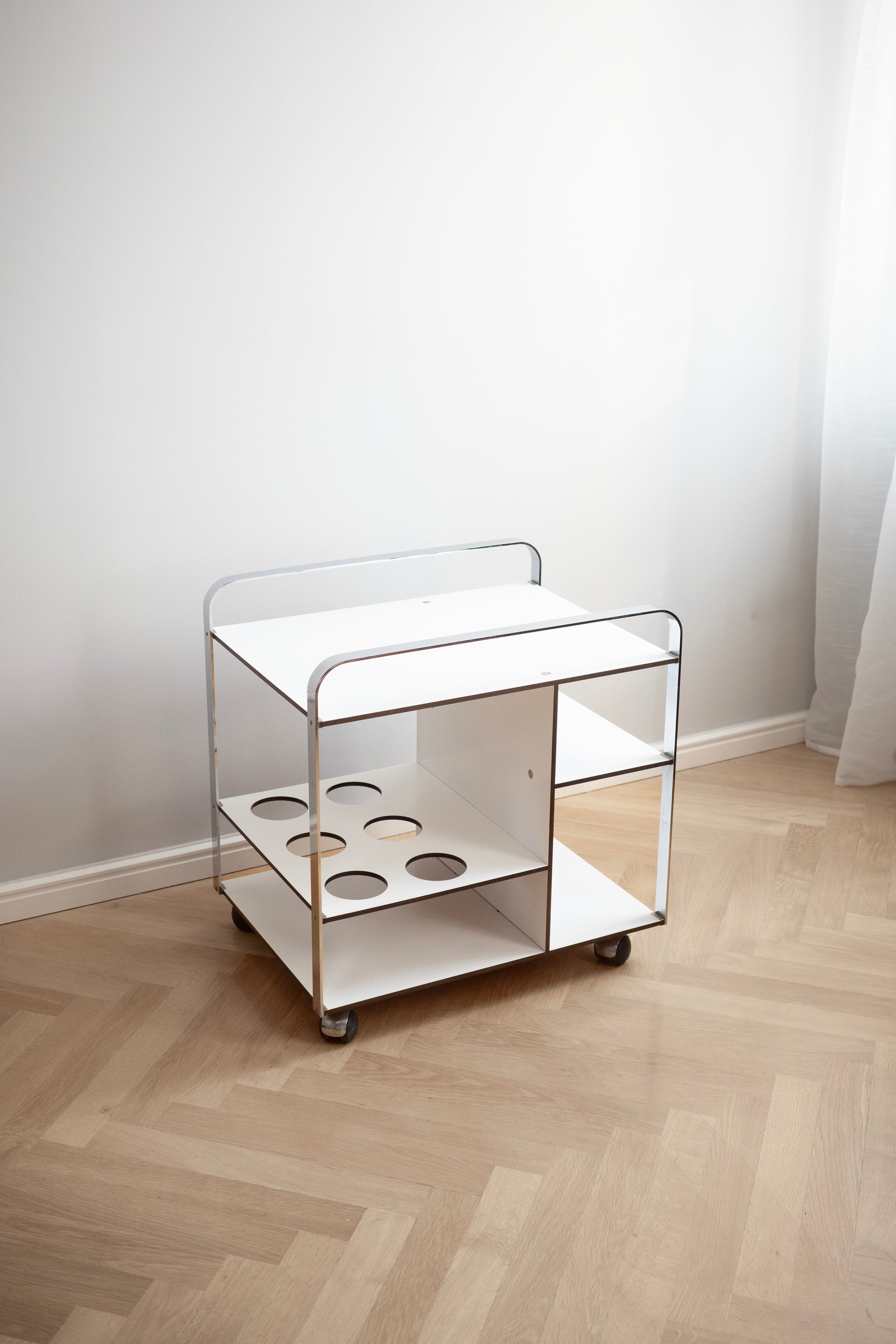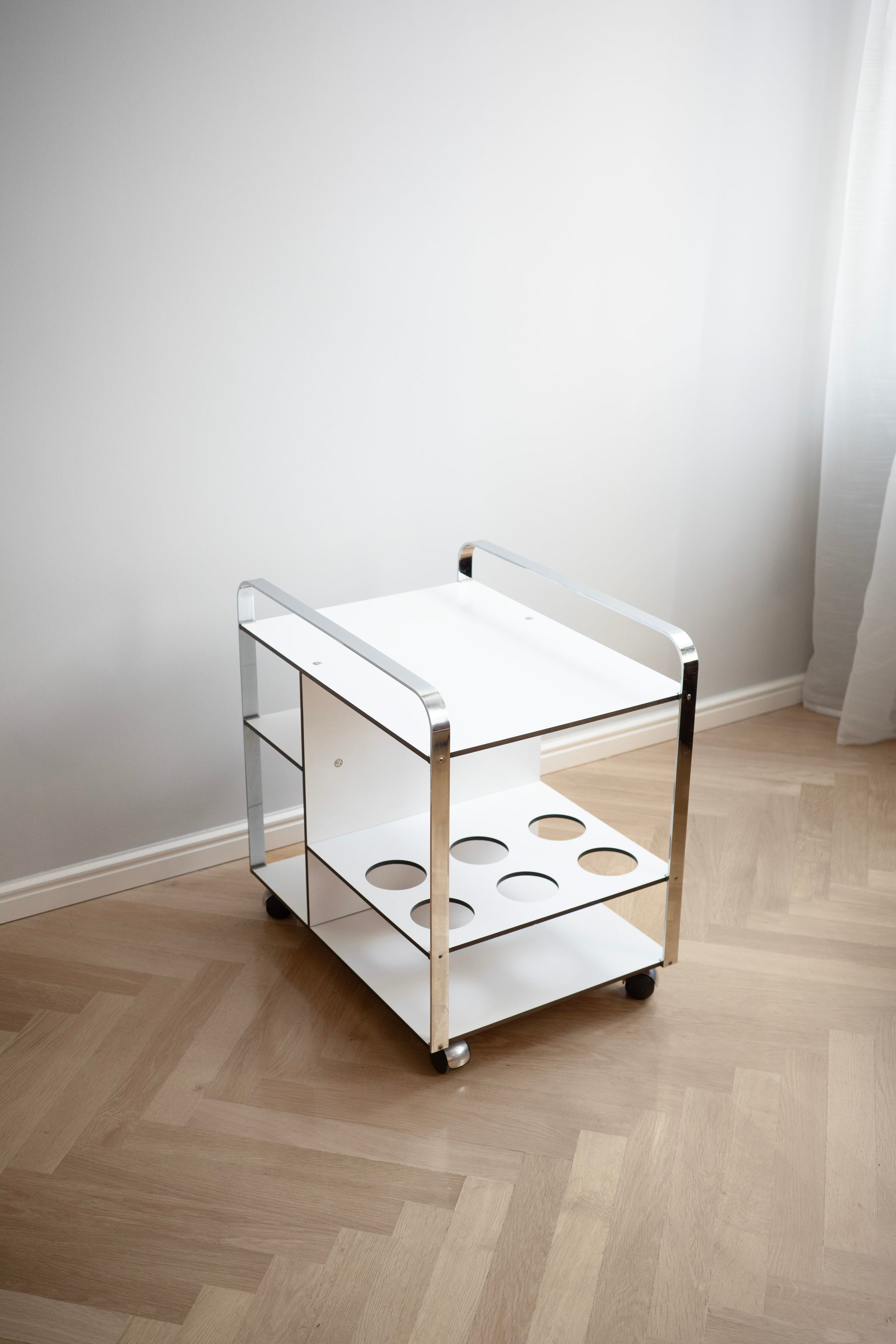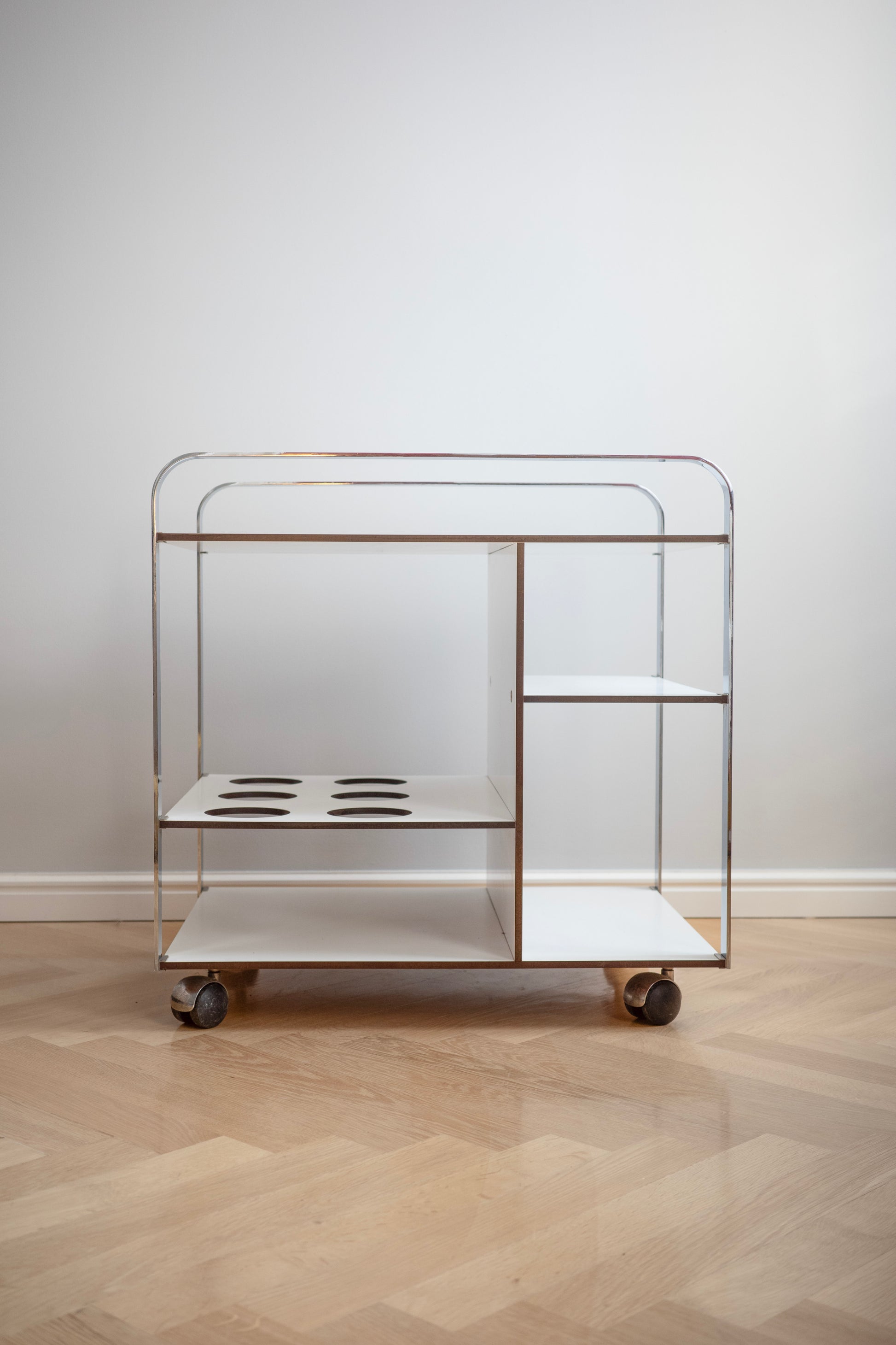 An architectural serving trolley from the 1980s with a chrome frame and white shelves. It has unusual compartments and a bottle holder that are reminiscent of Italian postmodern style. The trolley is on wheels, ideal as a mobile bar or a practical accessory.