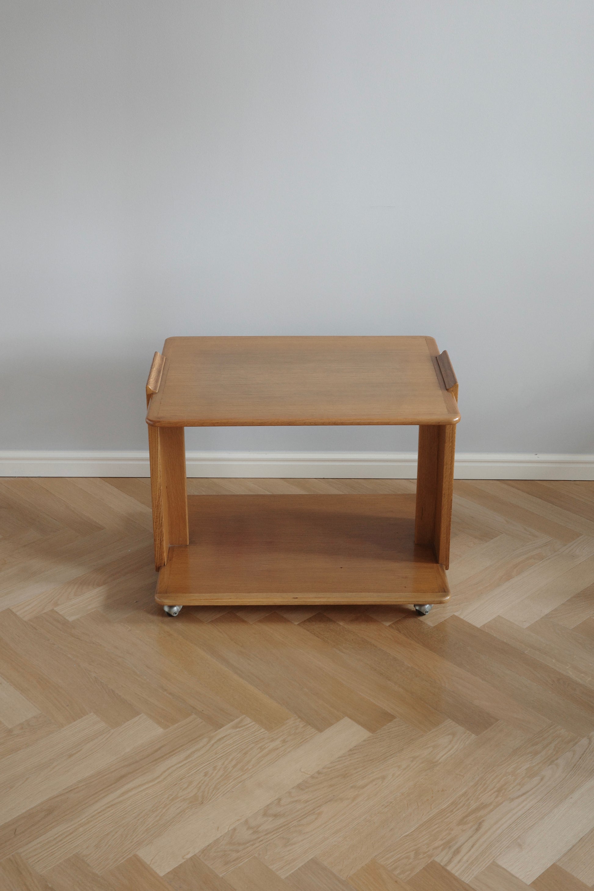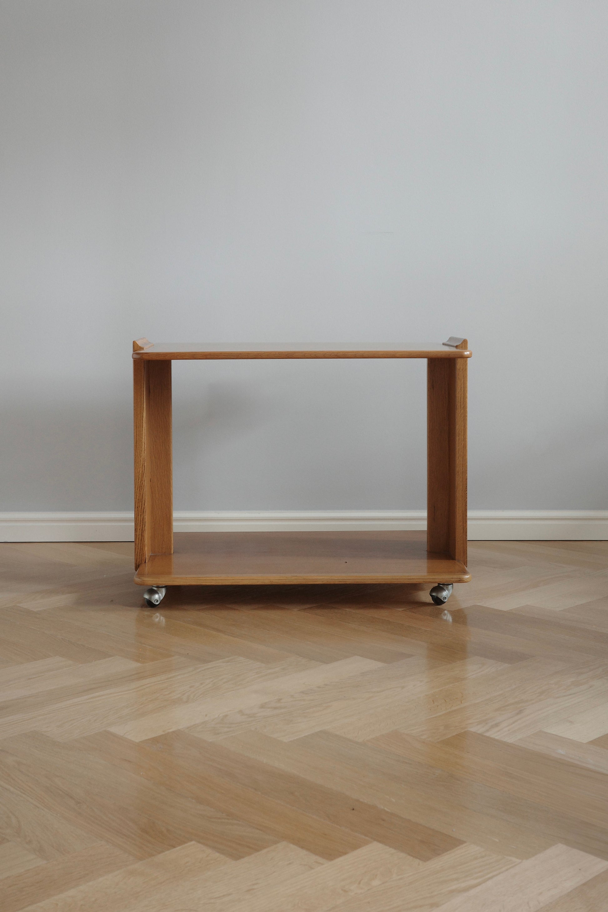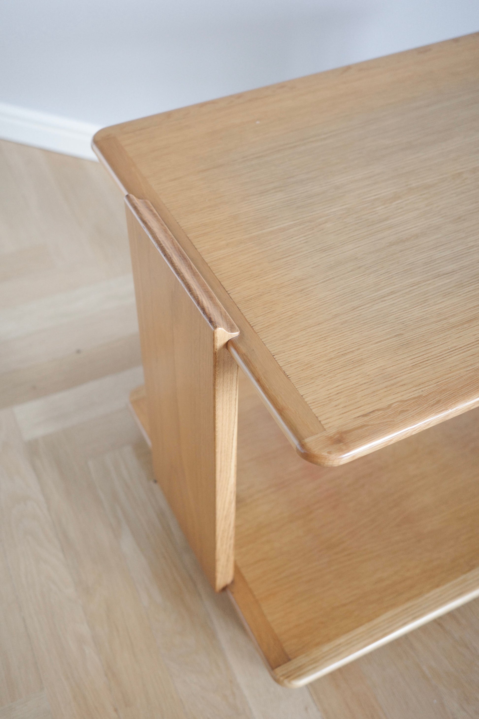 A low vintage oak table with clean lines and versatile uses. It has a compact design with two rectangular shelves connected by vertical panels.