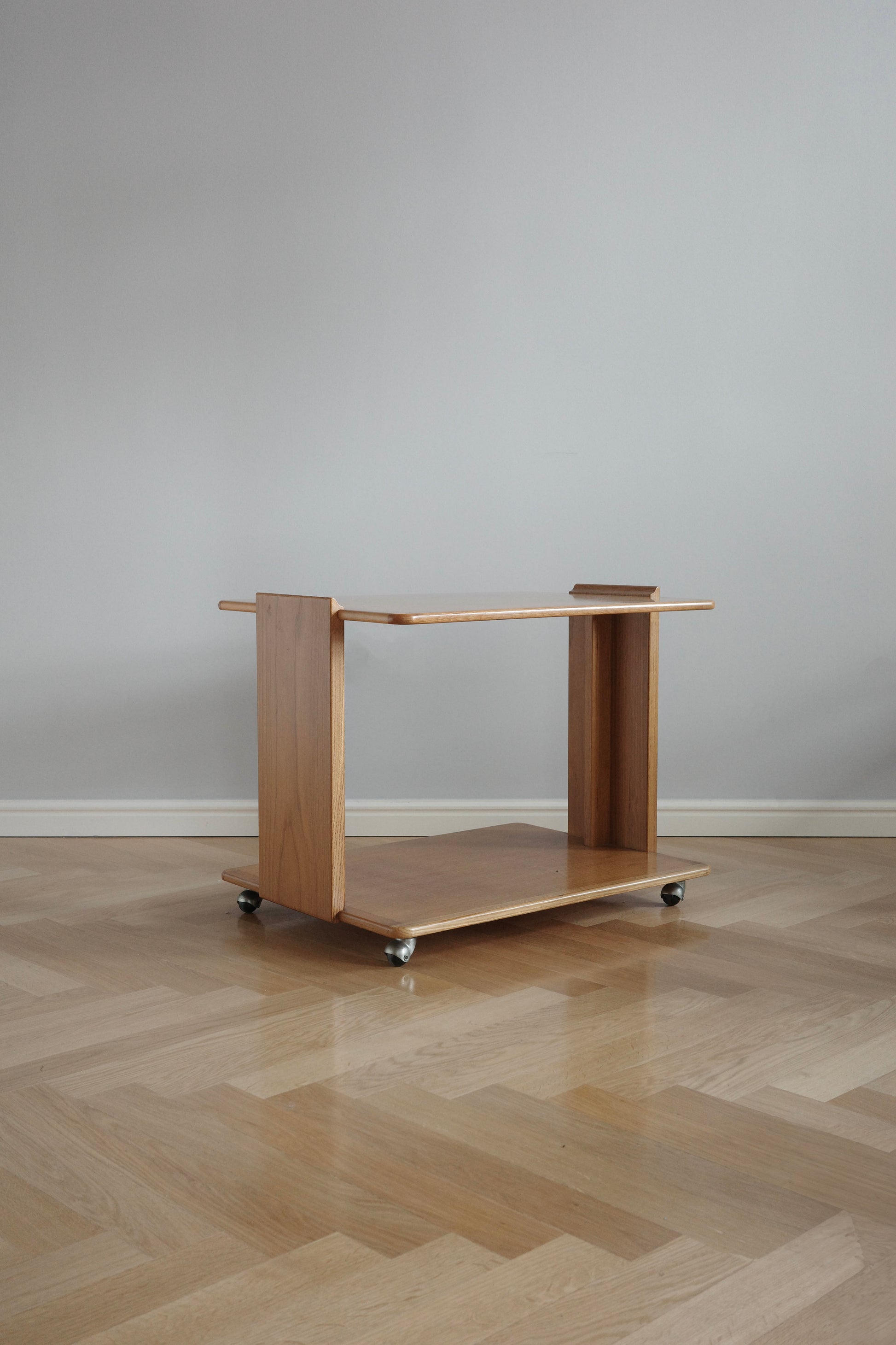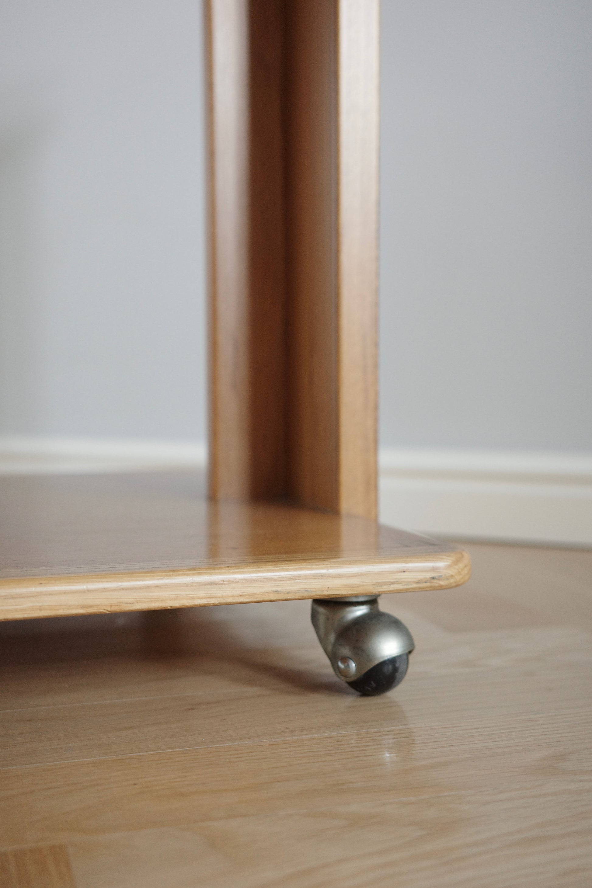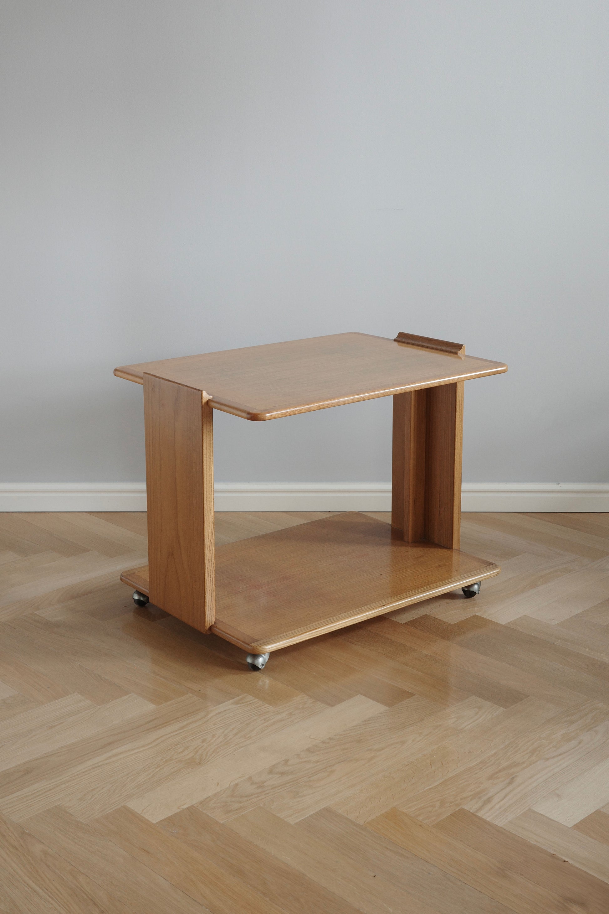 A low vintage oak table with clean lines and versatile uses. It has a compact design with two rectangular shelves connected by vertical panels.