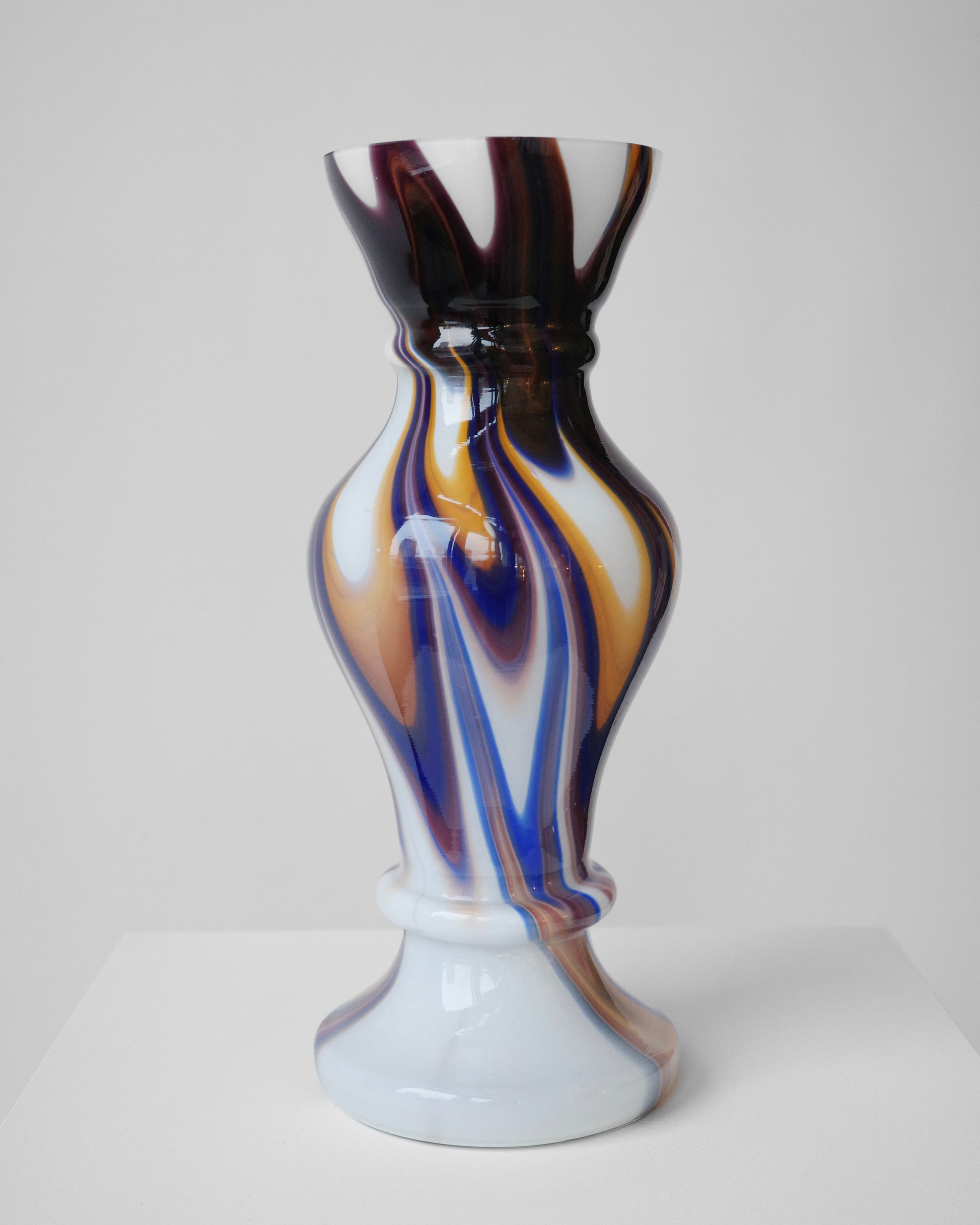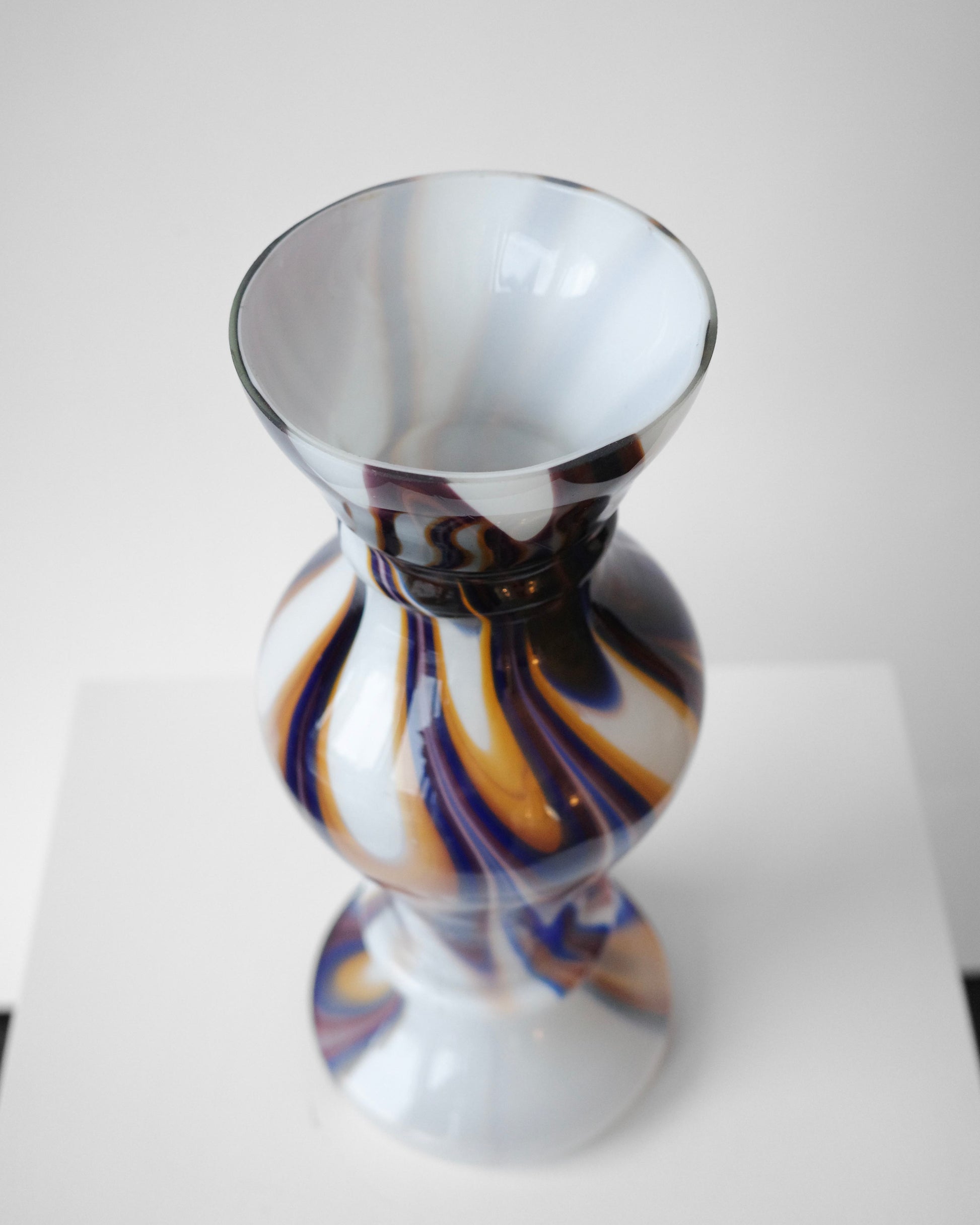 Colorful mid-century vase with sculptural shape and quality workmanship. In excellent condition.