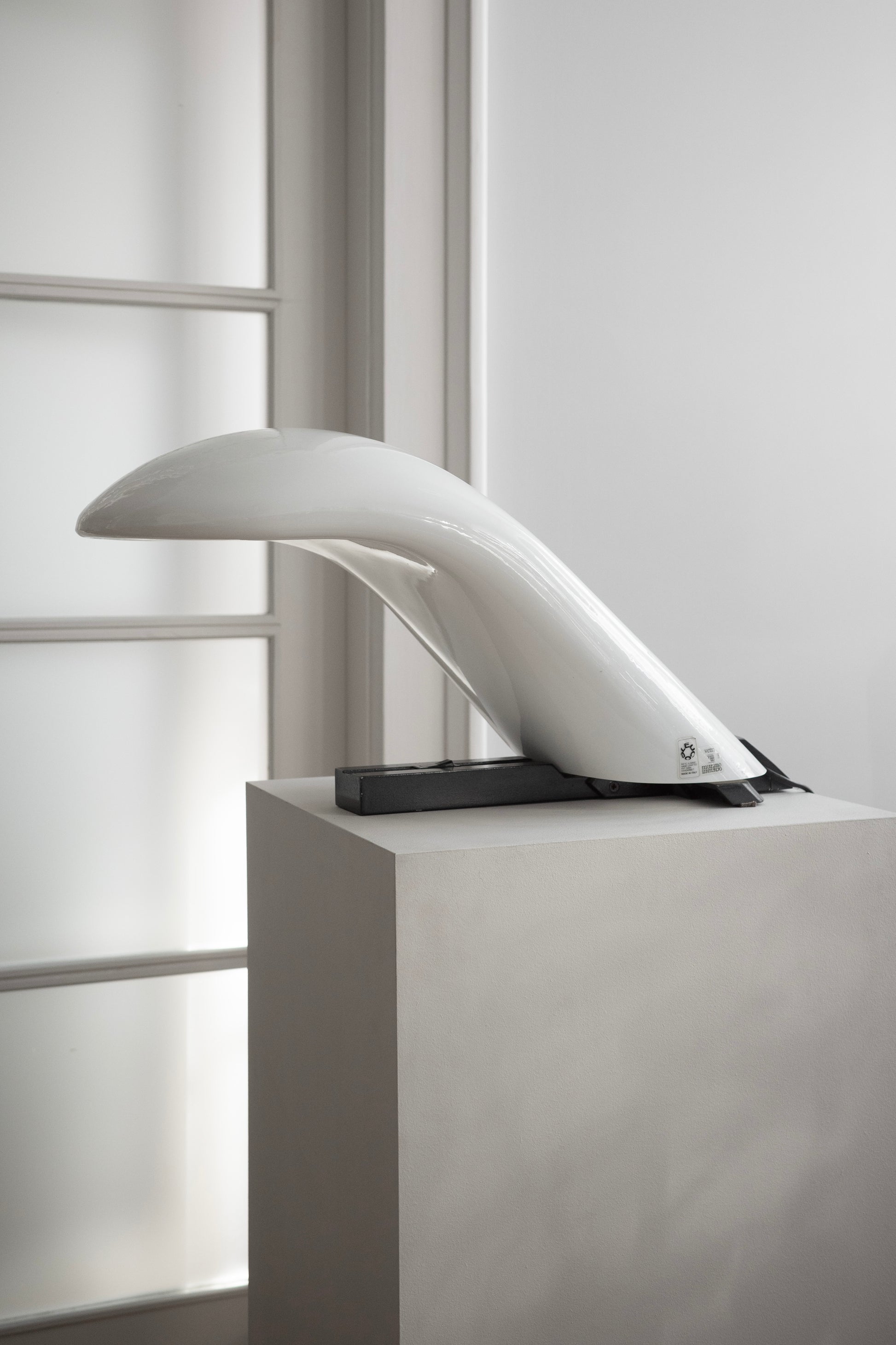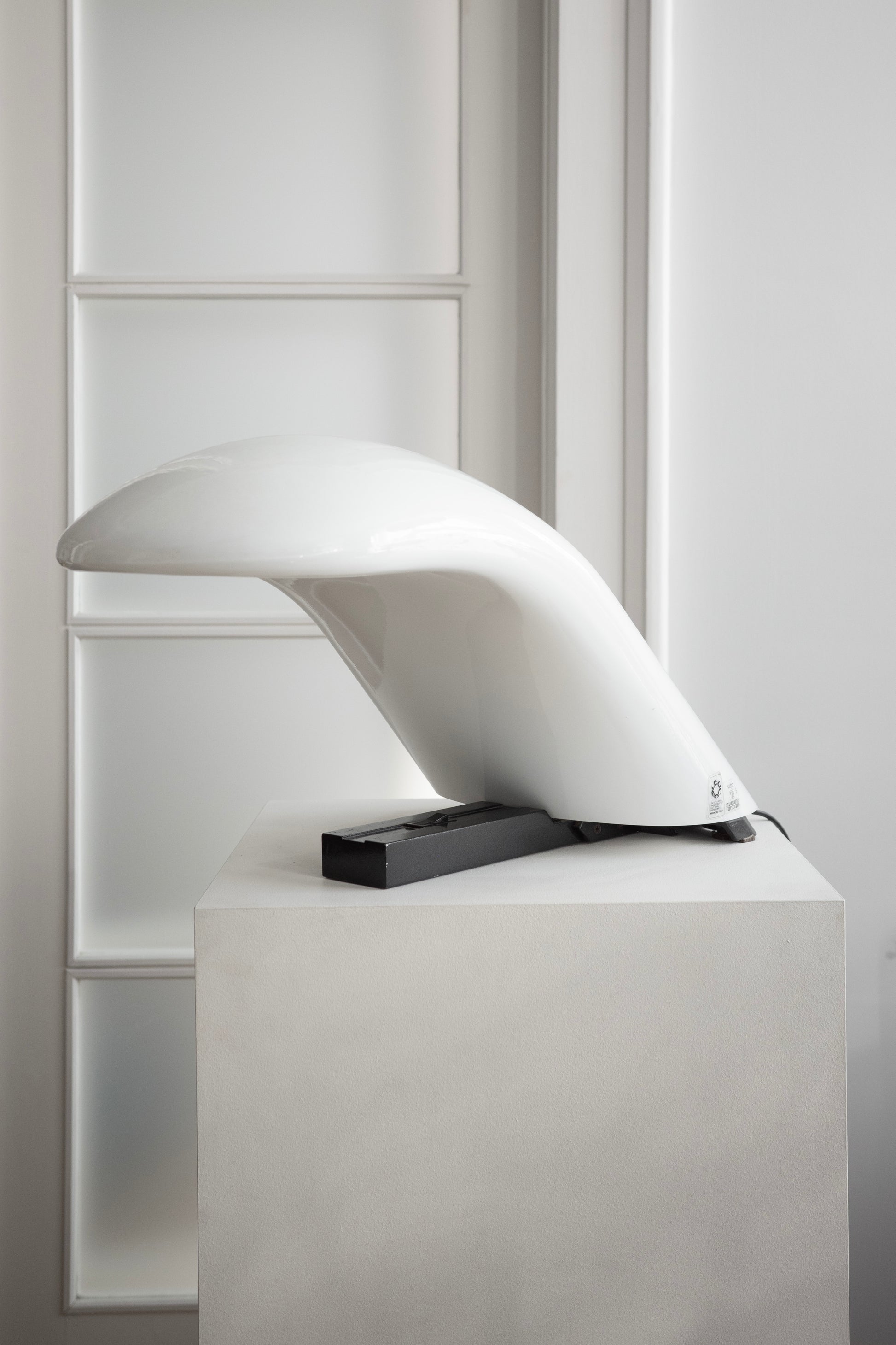 A beautiful table lamp in an arc shape from Italian lighting specialist Leucos. Its base is made of black steel metal. The bulb itself is placed in an aerodynamically shaped Murano glass that appears to balance delicately on the base. The result is a light object that is also an elegant sculpture.
