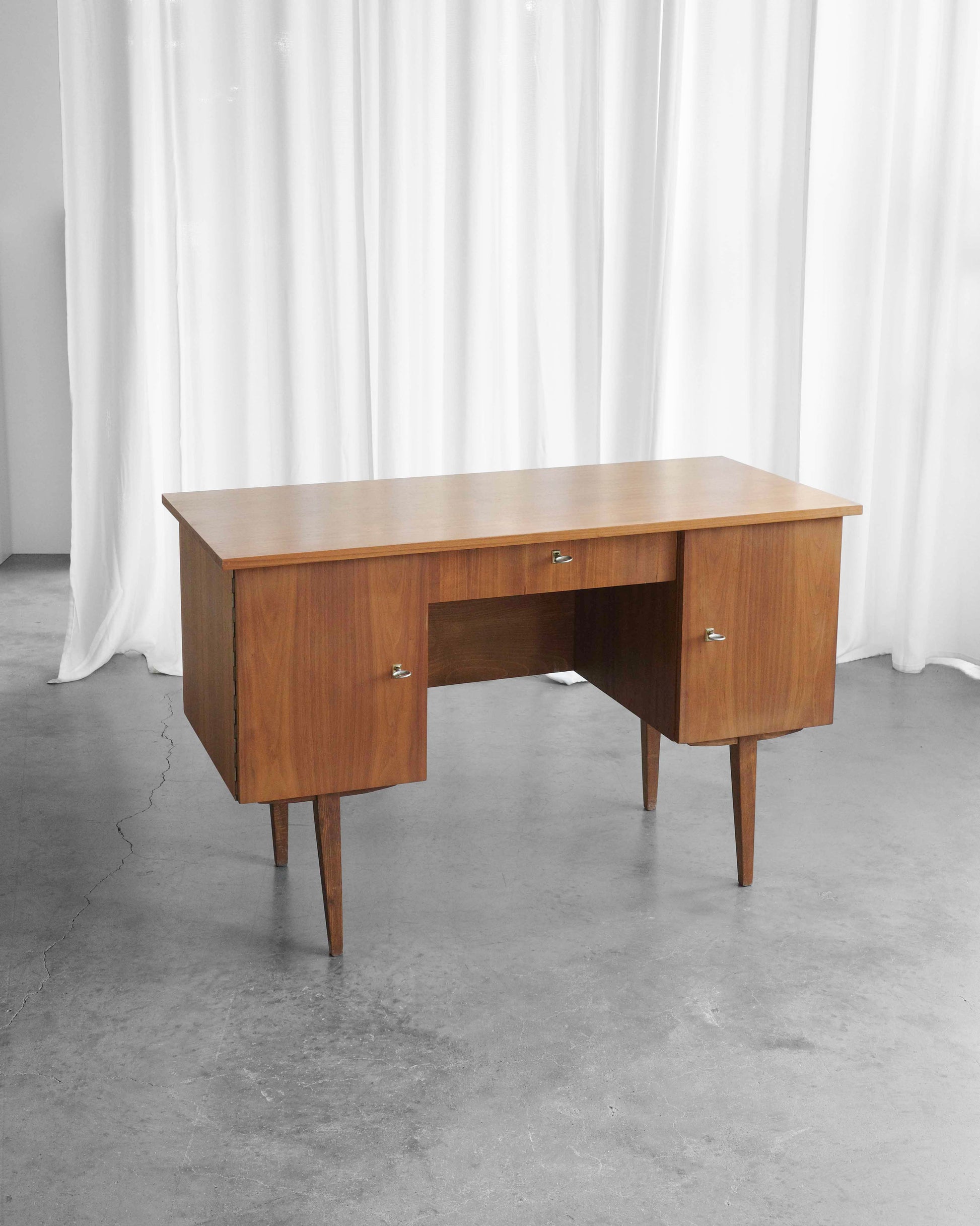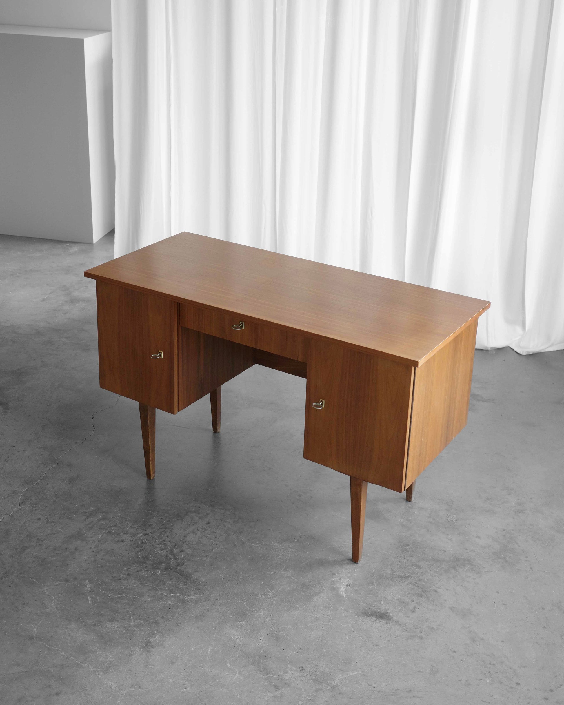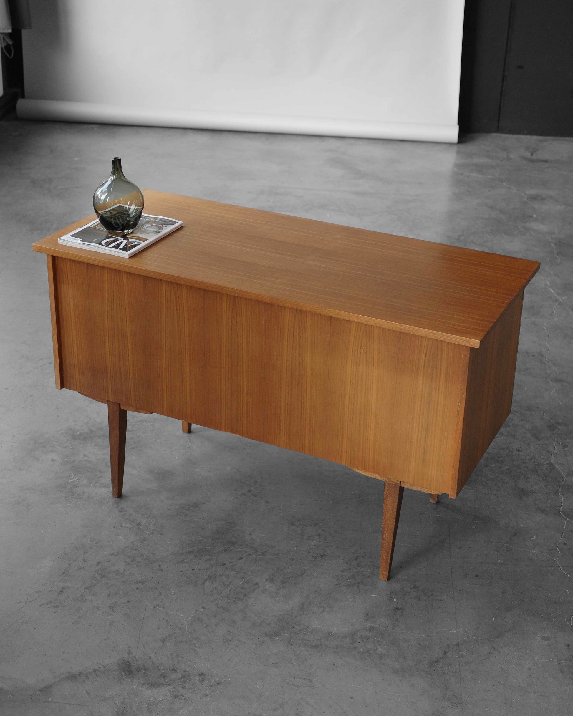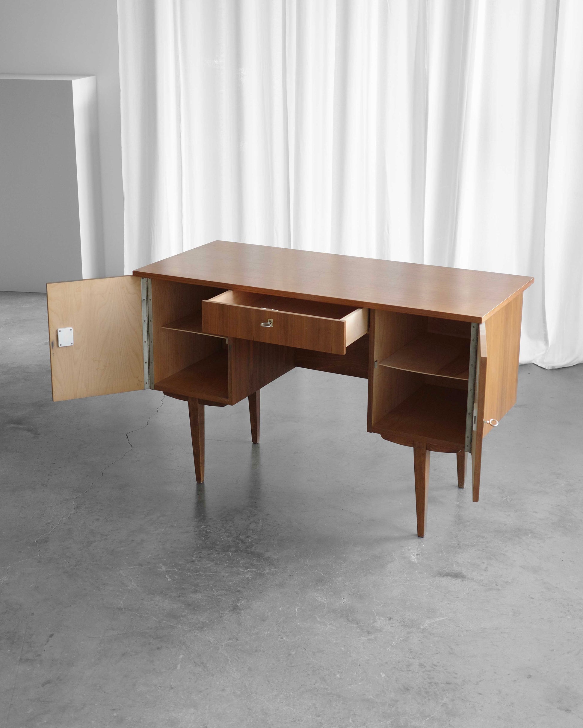 The desk comes from Denmark. It is made of teak wood and is therefore easy to handle. It stands on elegant slender legs, looks airy and at the same time has plenty of storage space. It has one drawer in the middle with a lock and cabinets on the sides, which can also be locked. It is in original, but very good condition.
