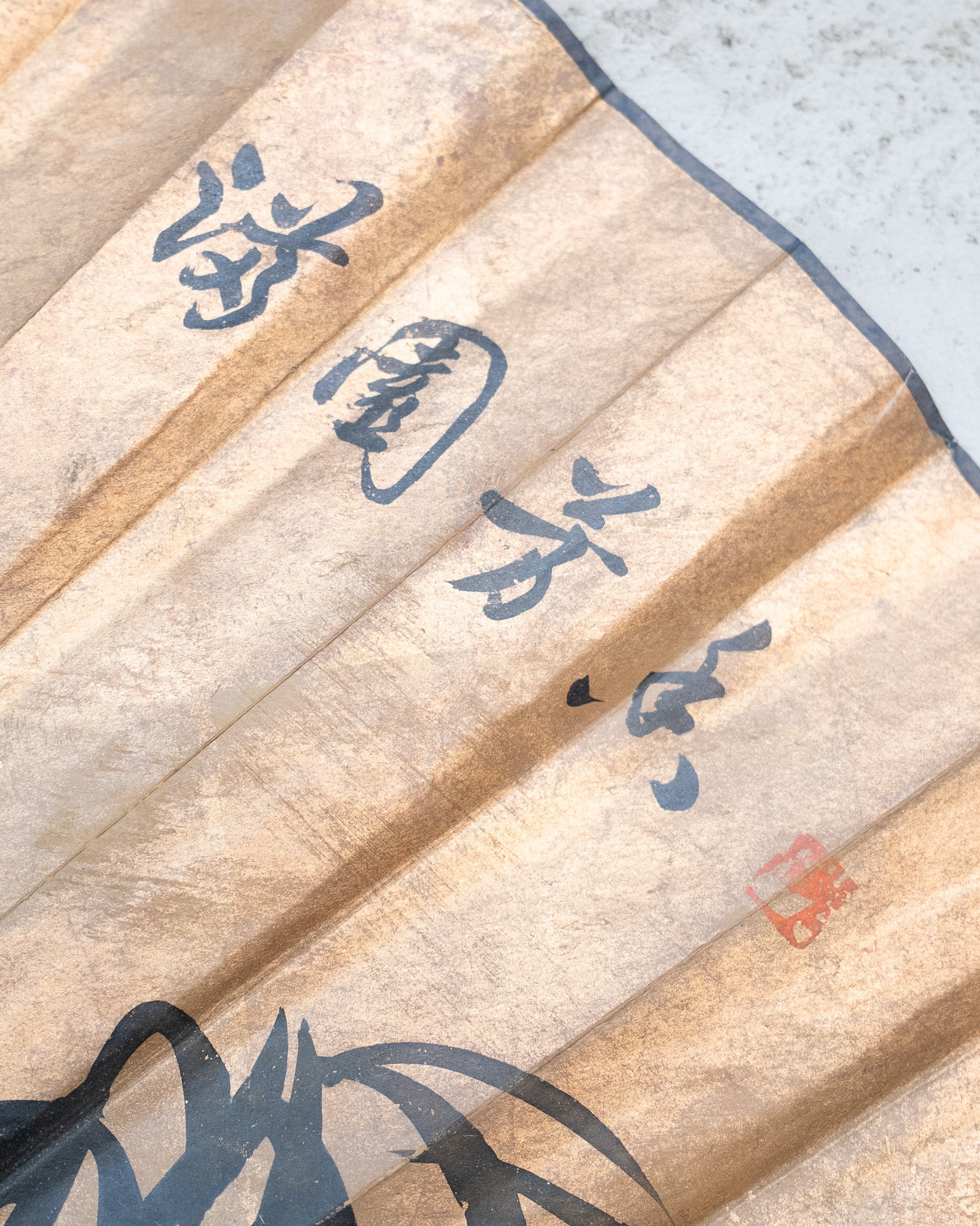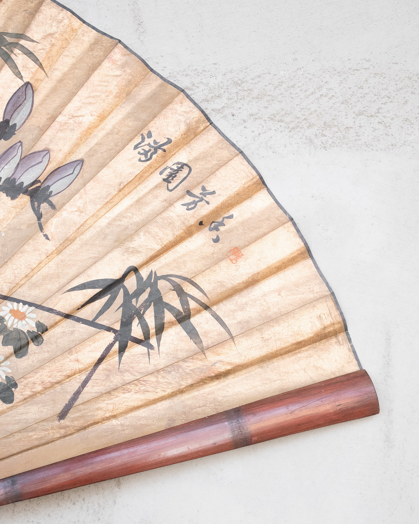 The fan is suitable as a wall decoration. It is hand-painted and comes from around the 1950s. It has a bamboo construction.