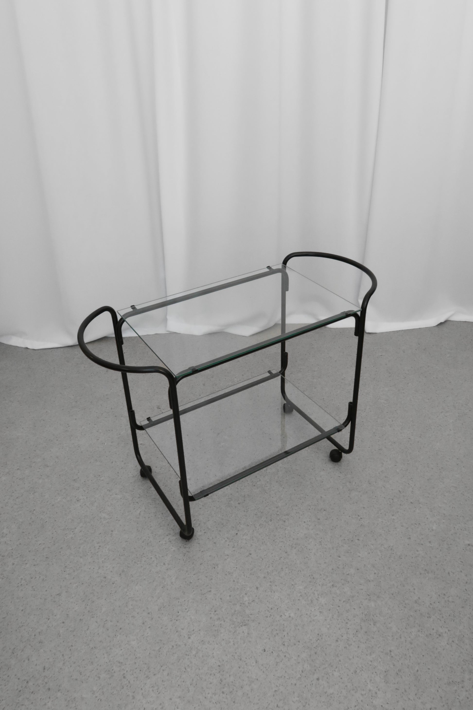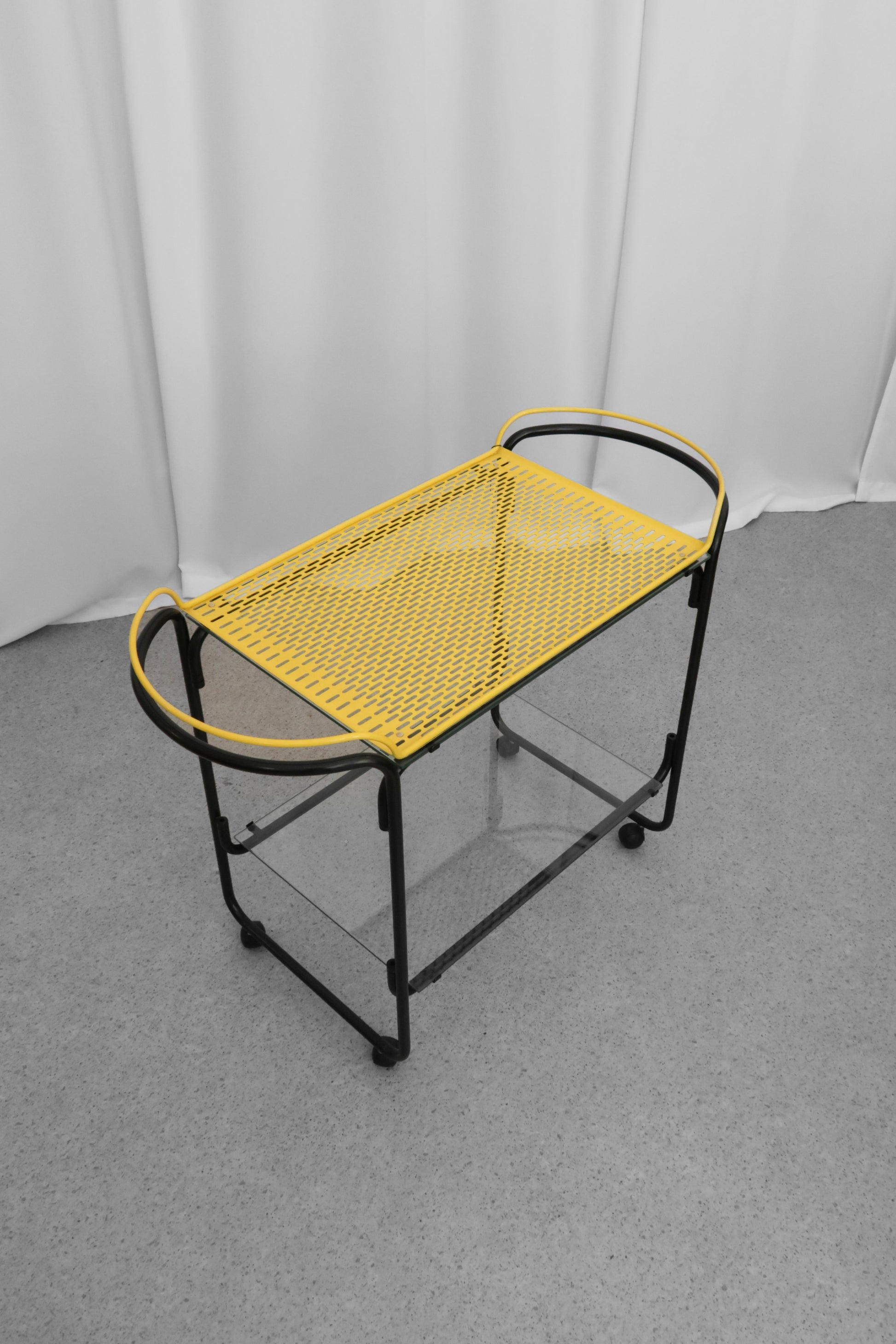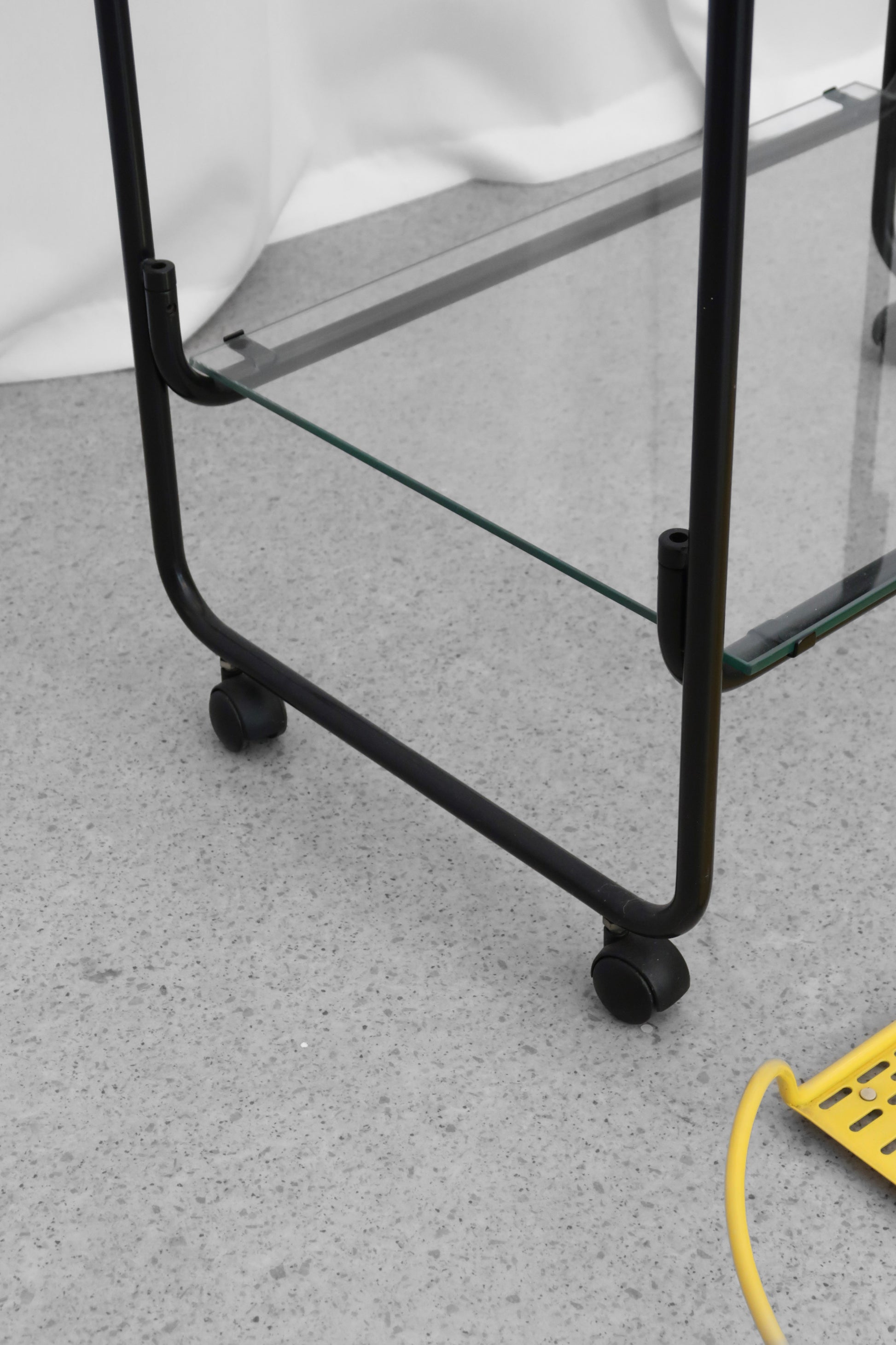 A 1980s Italian serving cart on wheels with a black metal frame, glass top and removable yellow tray. A playfully practical piece that can be used as a mobile bar and side table.