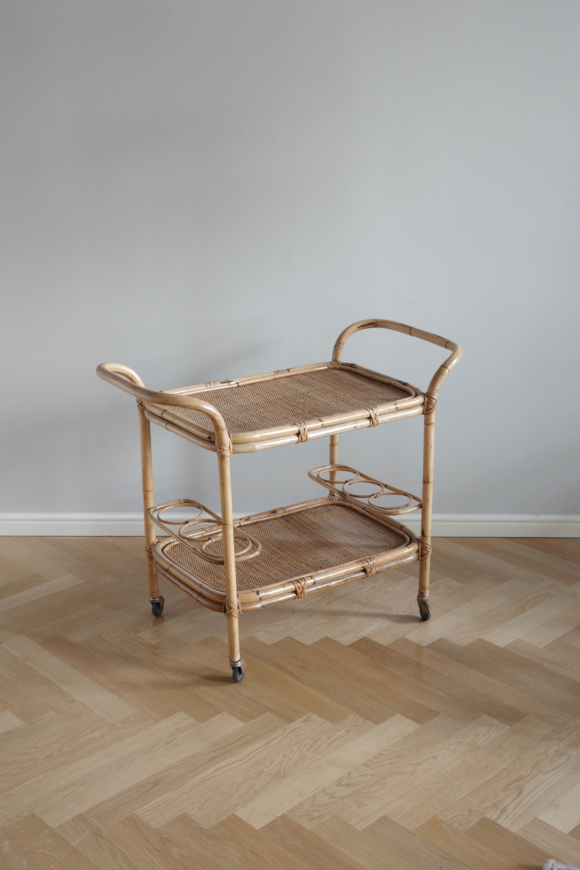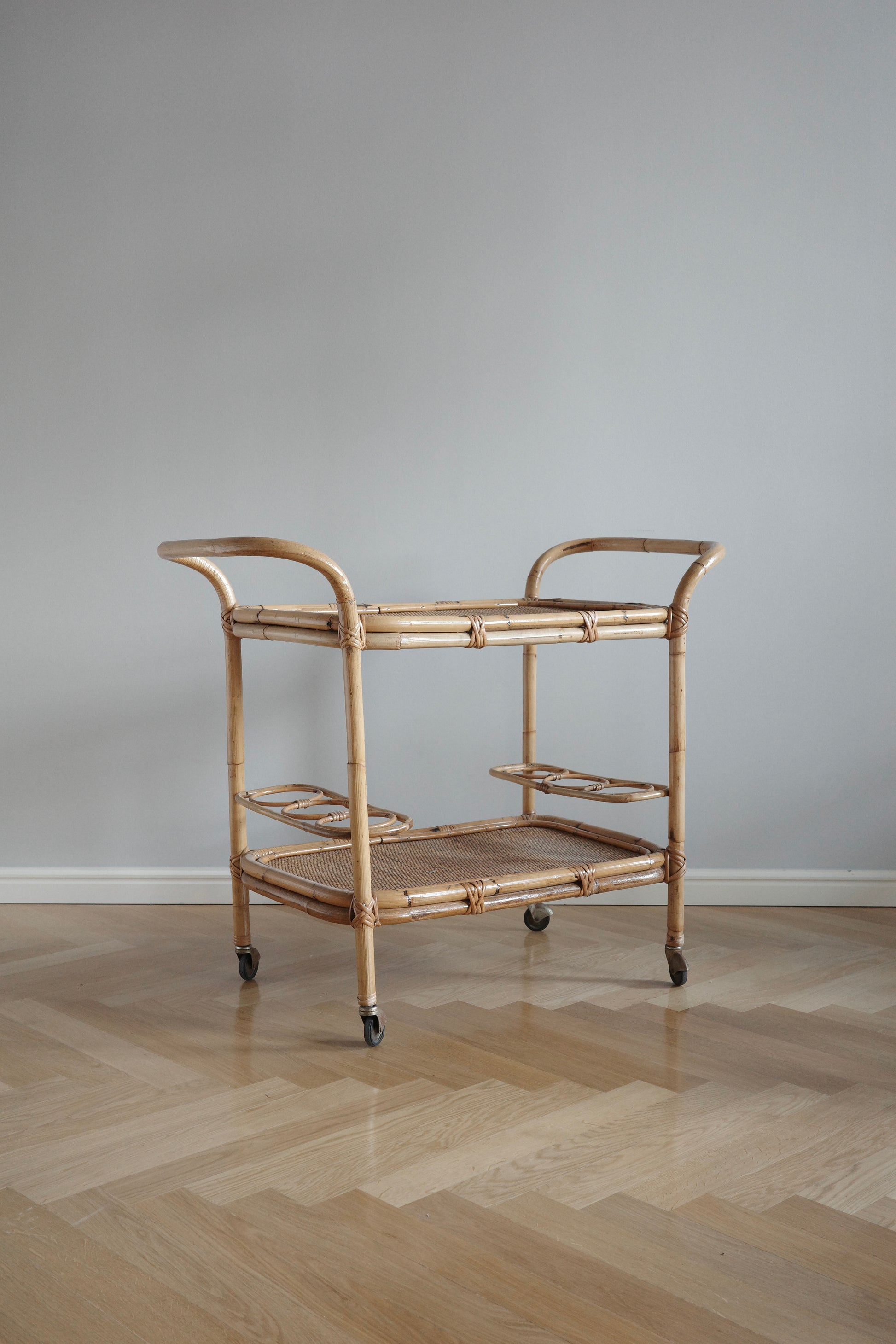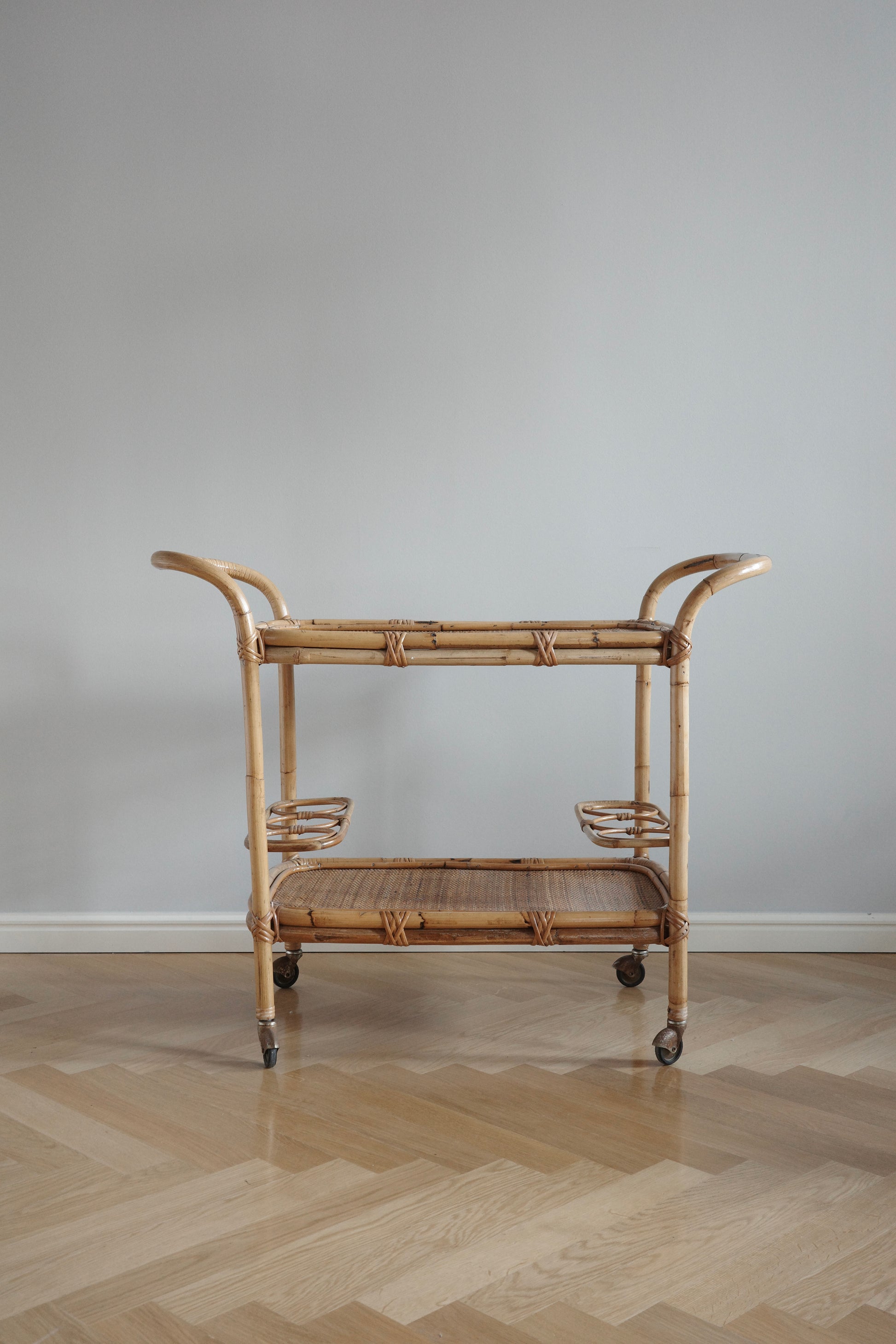 A 1950s bar cart made of bamboo and rattan with two levels and bottle holders makes it a stylish, functional and practical interior accessory.