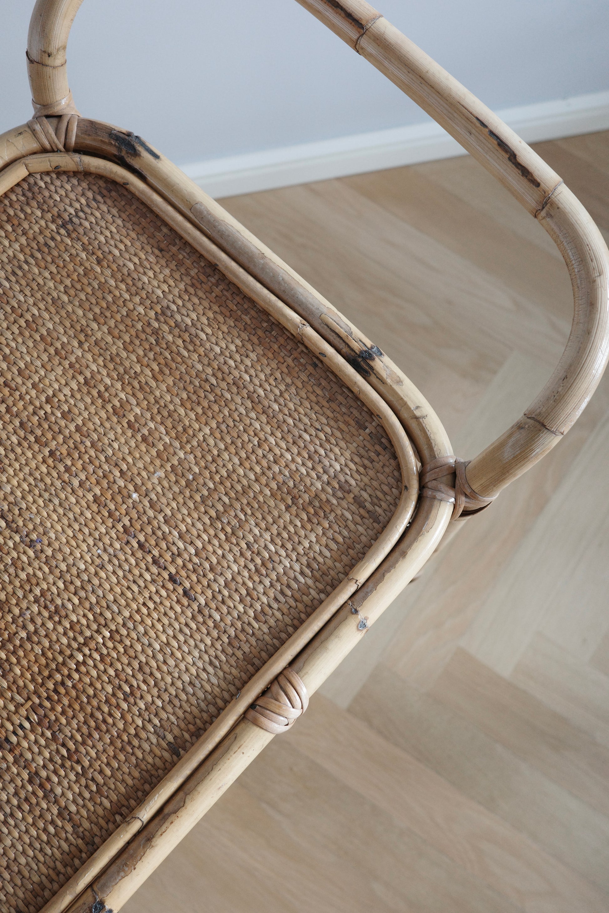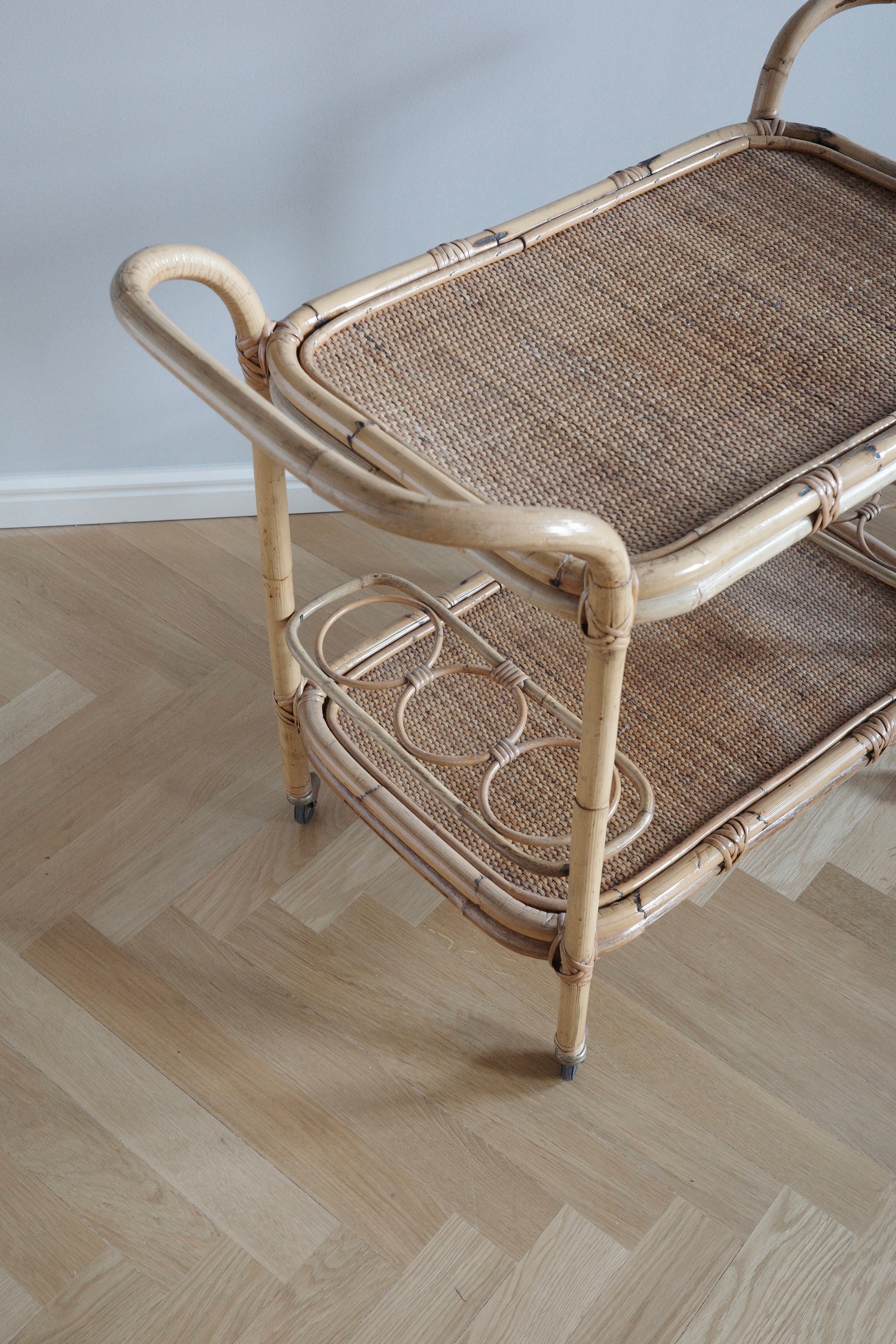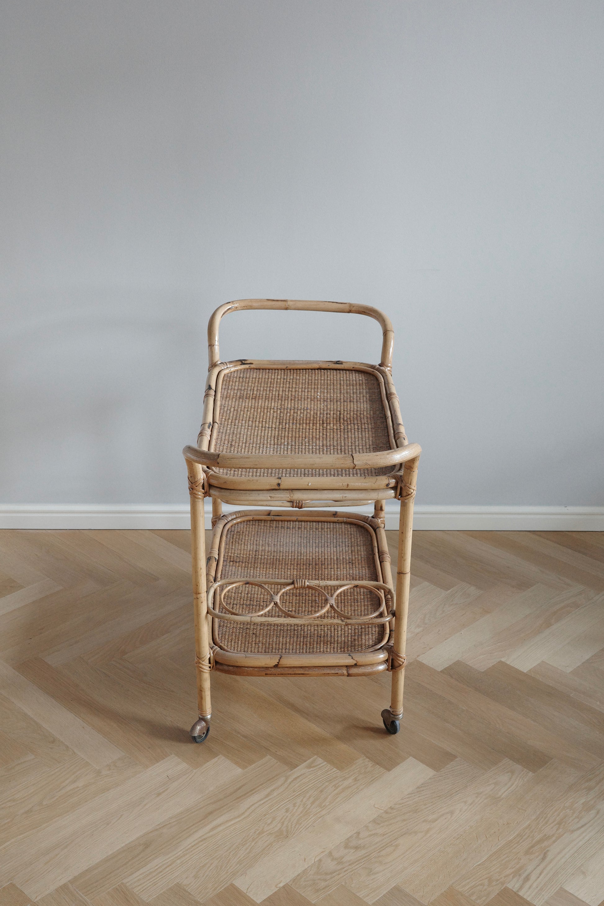 A 1950s bar cart made of bamboo and rattan with two levels and bottle holders makes it a stylish, functional and practical interior accessory.