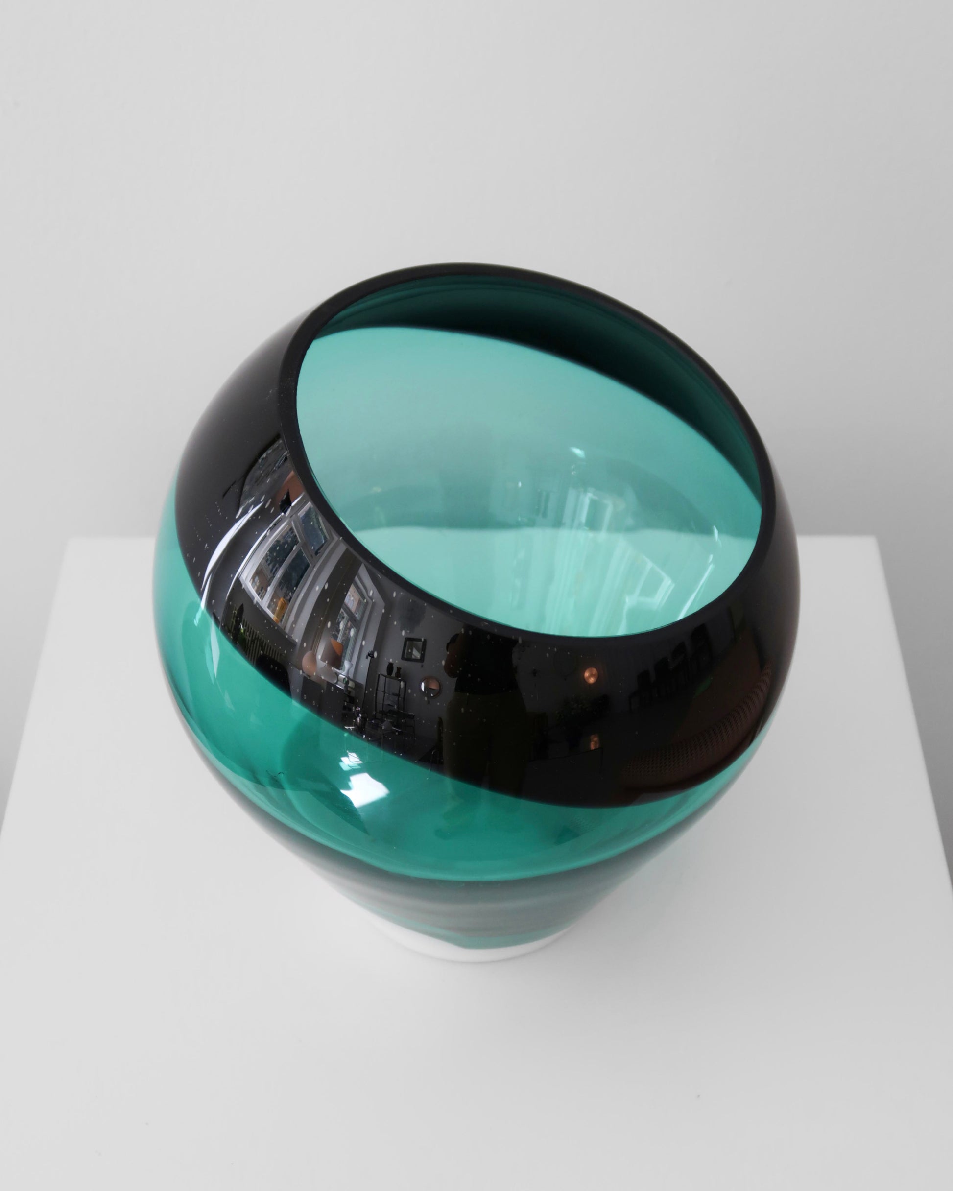 The vase made of thick Murano glass has an interesting slanted opening. We don't know much about its origin, but it caught our attention with its shape and color.