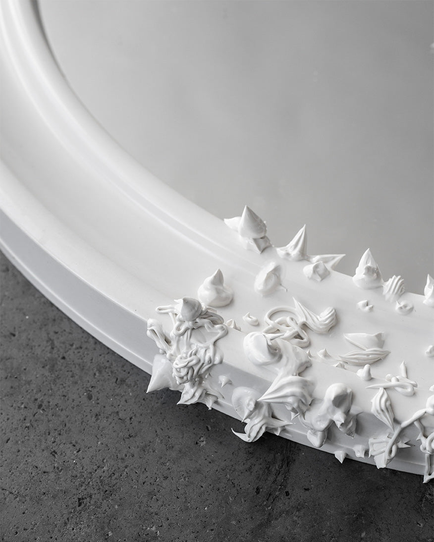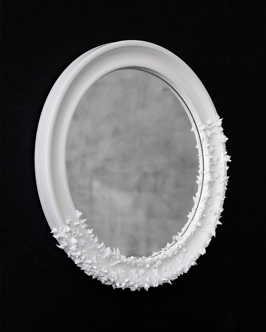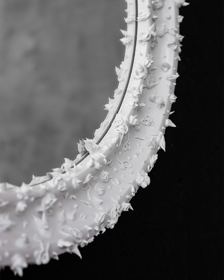 The vintage mirror was created by artist Evgeniia Kazarezova, who works under the brand ZHENI.