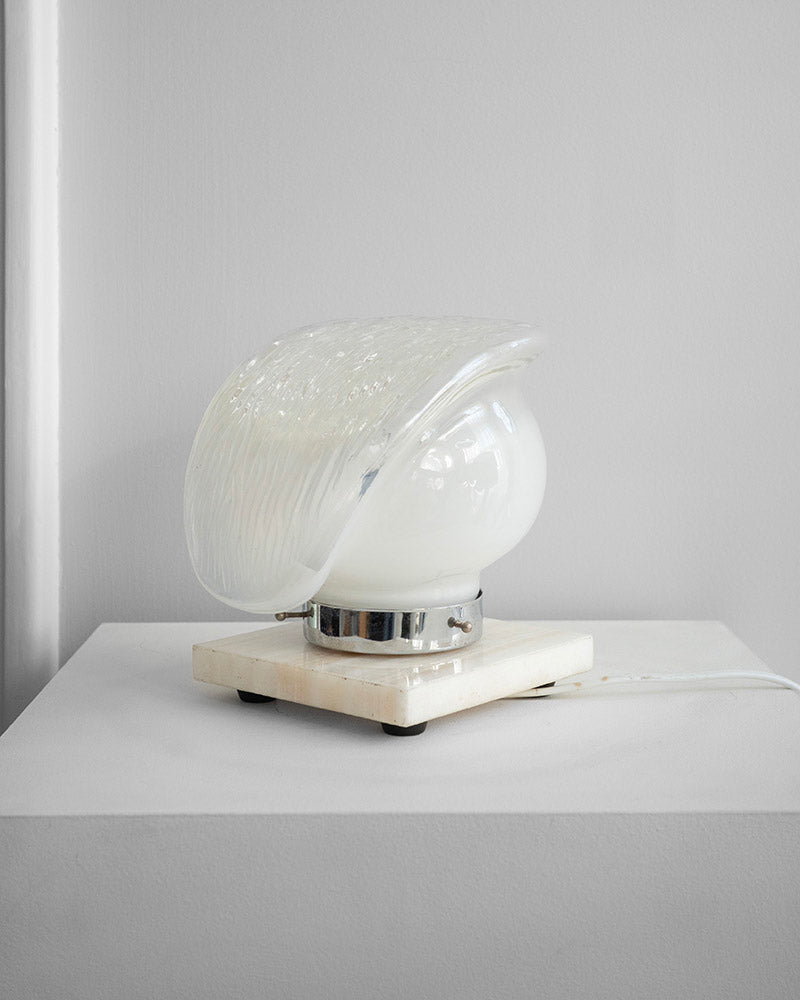 Murano glass table lamp from the 1980s, made in Italy. The lamp is made of hand-blown Murano glass with a structured shape and stands on a marble base. The combination of the unconventional shape of Murano glass and marble creates a strong accent. The lamp has a new cable with a switch, it is in excellent condition. One bulb with an E14 thread.