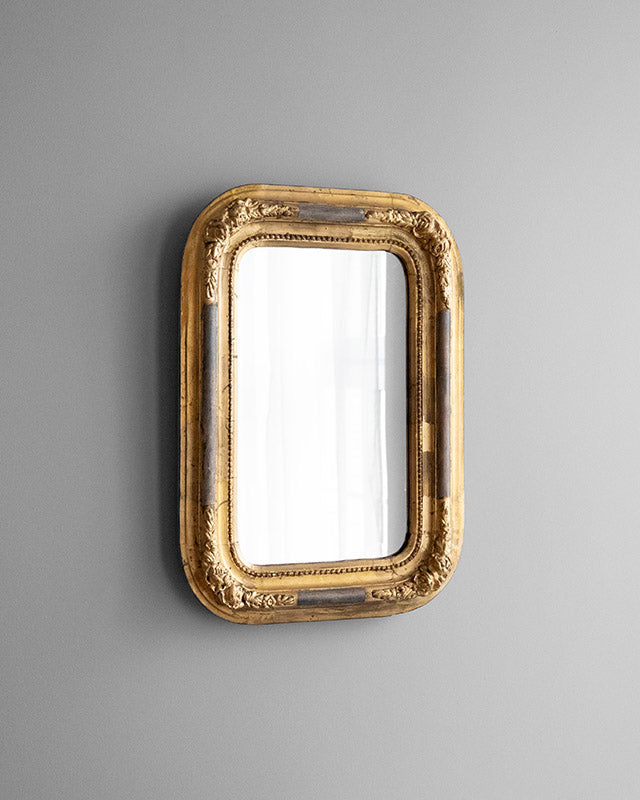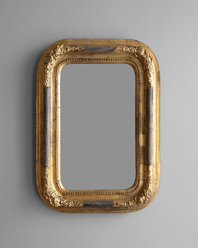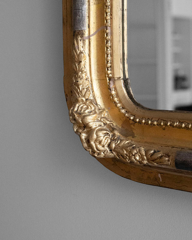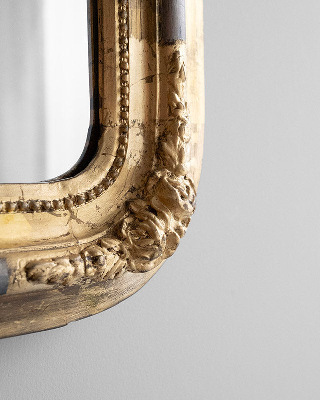 Starožitné nástenné zrkadlo v štýle Louis Philippe, pochádza z Francúzska z druhej polovice 19. storočia. Rám má typické zaoblené horné rohy a je zdobený florálnymi a rastlinnými motívmi.