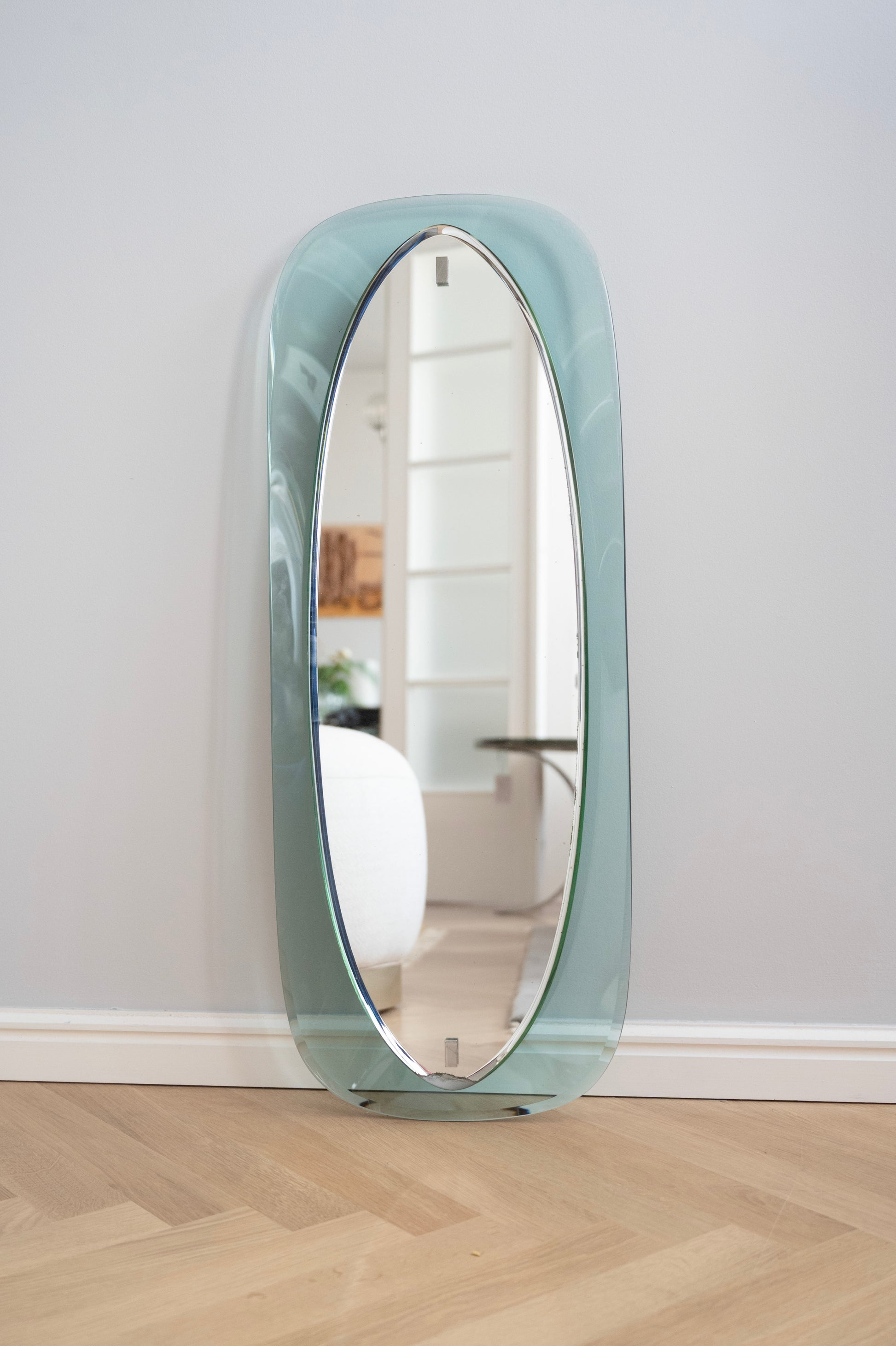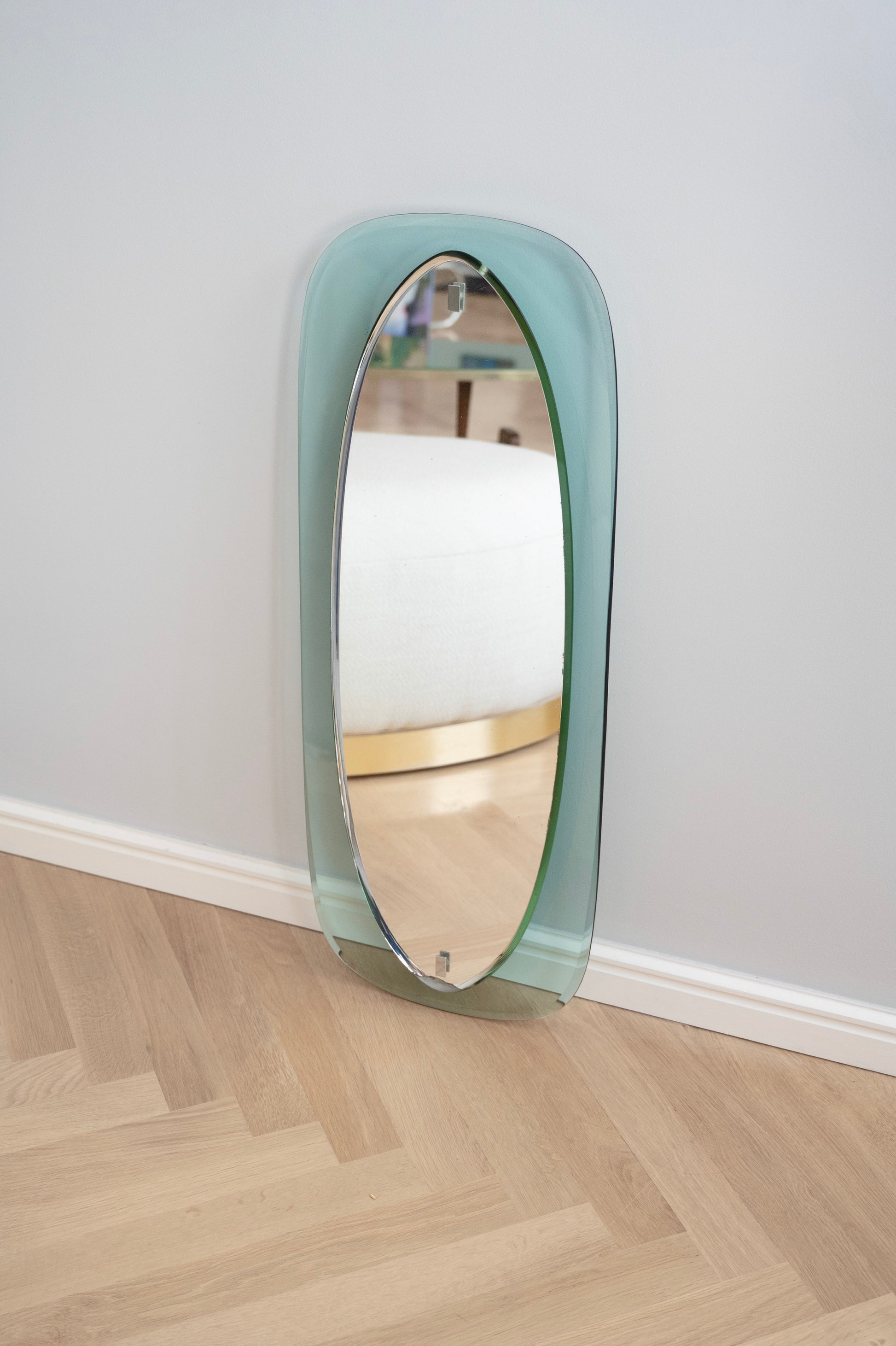 The oval mirror has a soft green glass frame and a bevel along the entire edge. It was made by the Italian company Fontana Arte and dates from the 1970s.