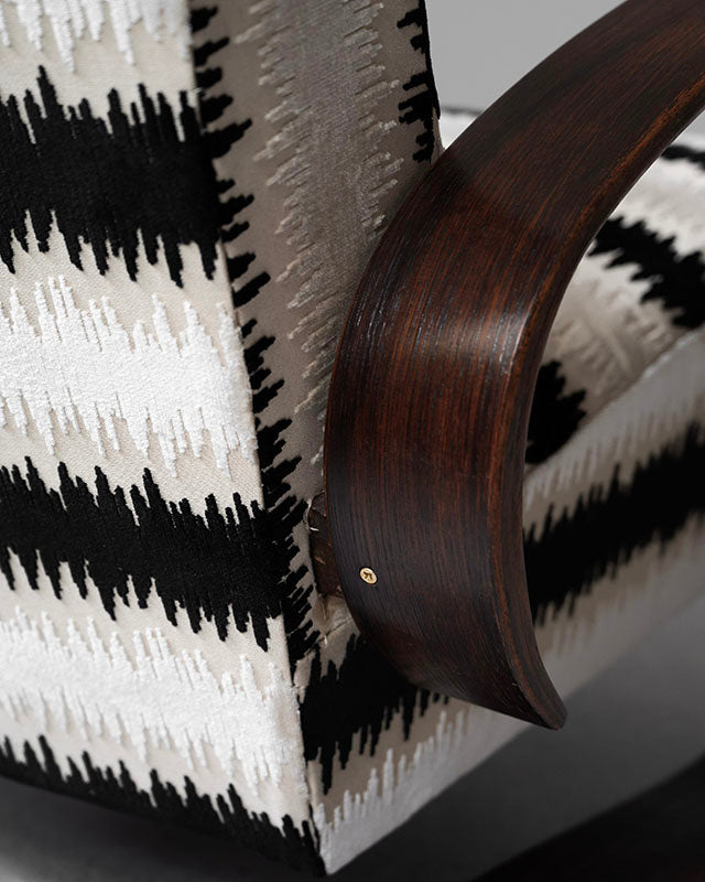 Veľmi elegantné kreslo v štýle Art Deco s zakrivenými drevenými podrúčkami, ktoré bolo nedávno renovované a prečalúnené vysokokvalitnou látkou, ktorá mu dodala nadčasový charakter. Vďaka svojej hlbšej, pohodlnej konštrukcii ponúka ideálne miesto na oddych alebo čítanie. Pôsobí útulne a pritom sofistikovane, dokonale doplní tichý kút obývačky či salónika.