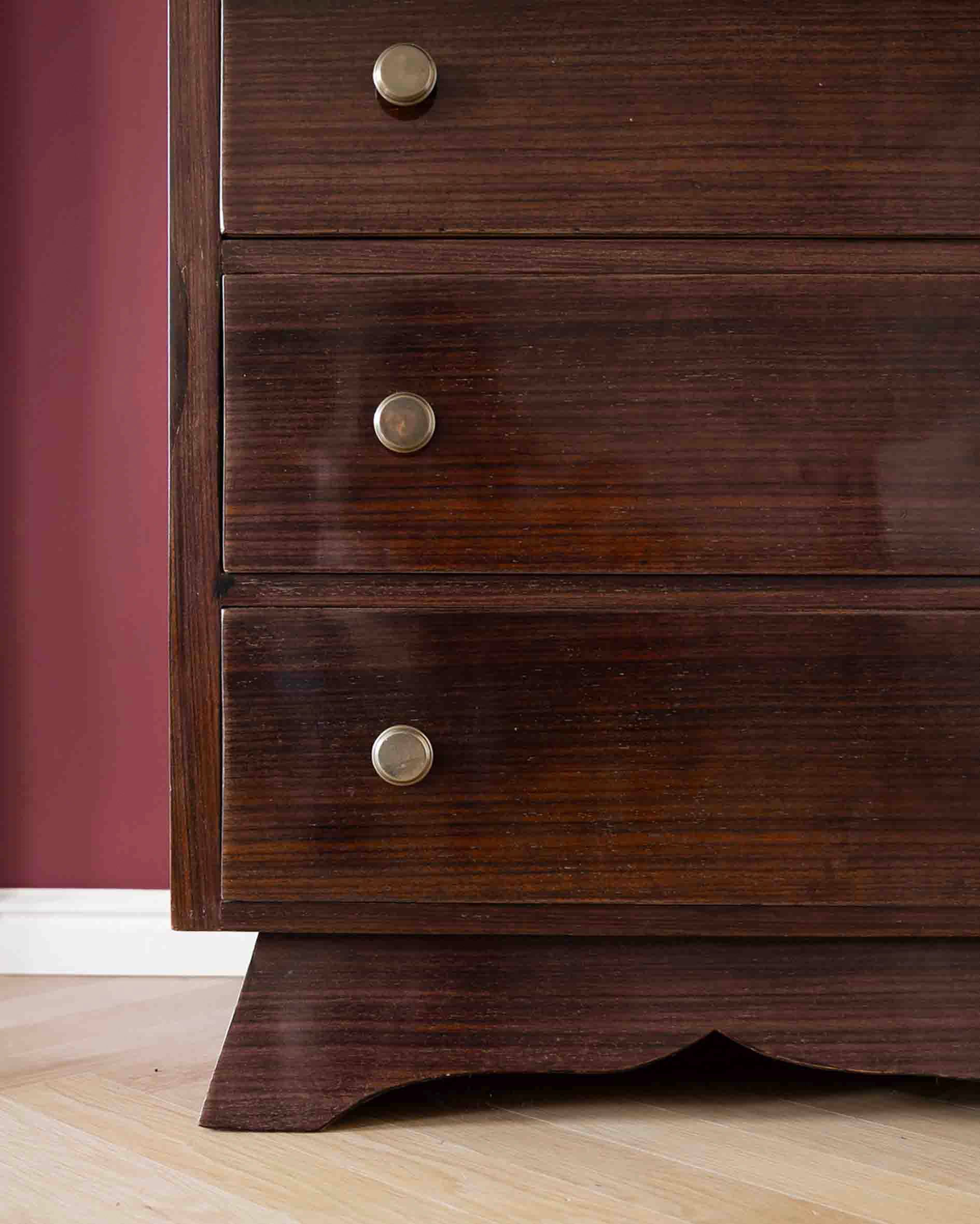 Elegantná art-deco zásuvková komoda z Francúzska, vyrobená z ušľachtilého palisandrového dreva. Vizuálne ju dotvárajú originálne mosadzné úchytky a nanovo leštený povrch, ktorý zvýrazňuje jej jedinečný charakter a remeselnú precíznosť.