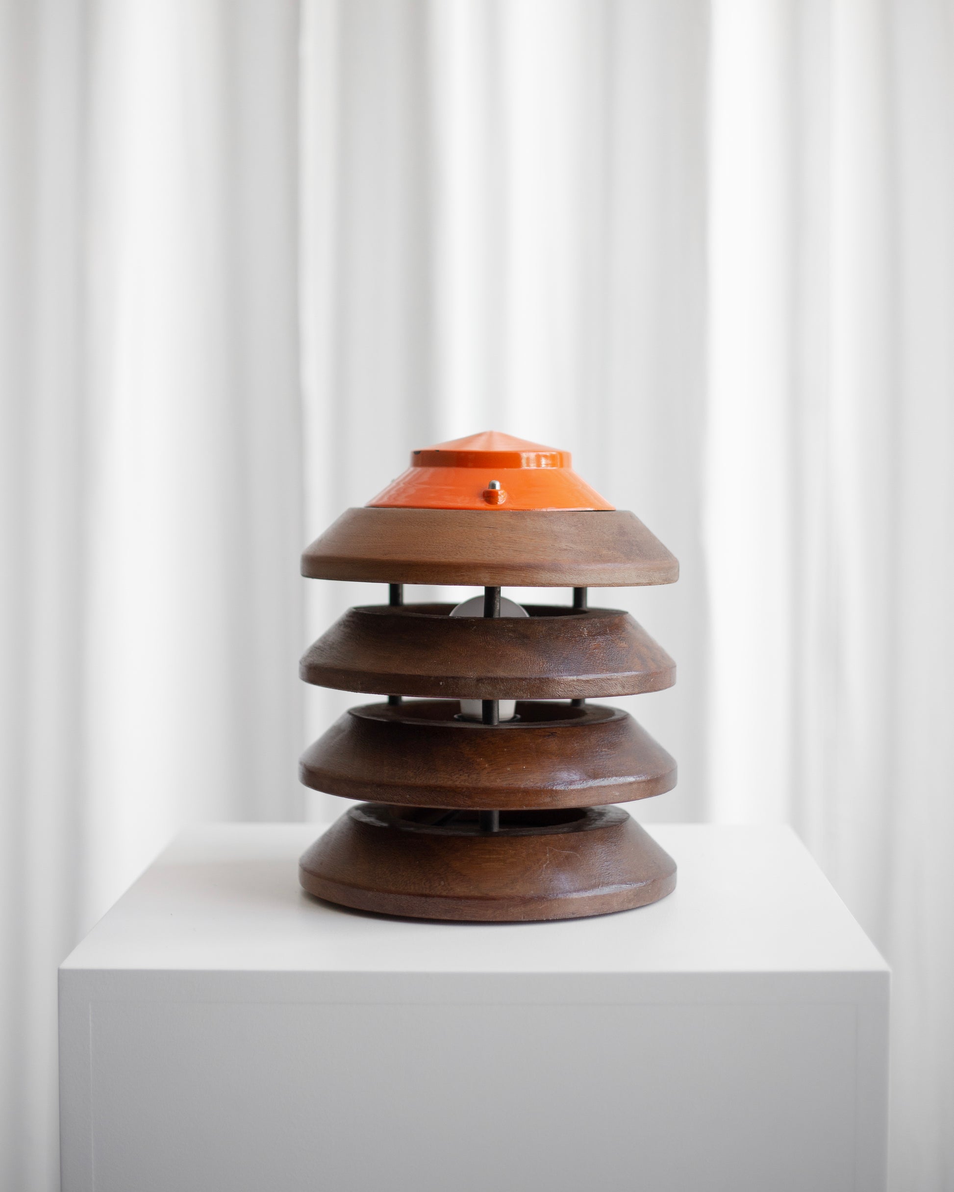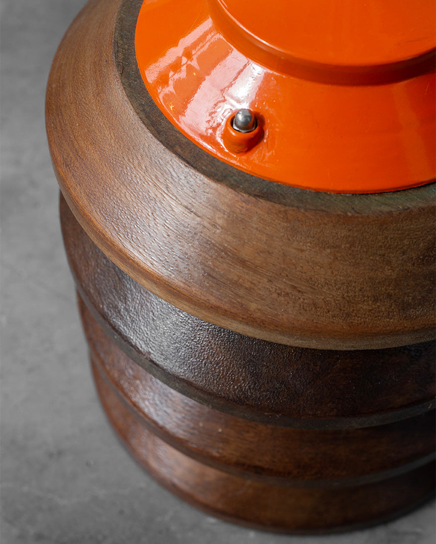 Mid-century lampu sme doviezli z Talianska. Lampa sa skladá zo štyroch drevených kruhov, ktoré spája vrchný kovový kryt v oranžovej farbe. Po zasvietení vytvára veľmi príjemné nepriame osvetlenie. Je skontrolovaná elektrikárom a má novú koncovku.Jeden zdroj E27.