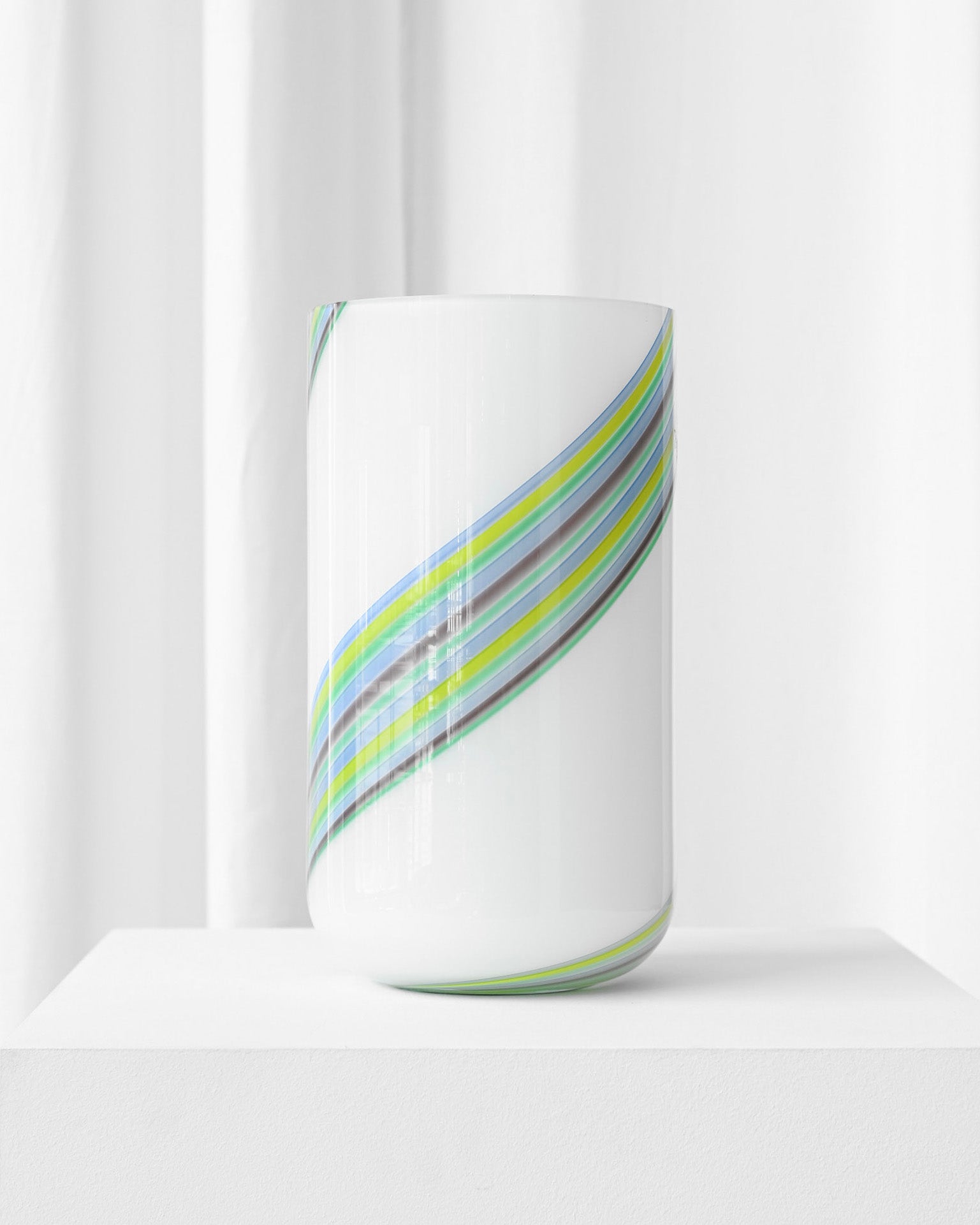 Vysoká váza z Murano skla má bielu farbu a šikmo cez ňu sklár naťahal farby dúhy.;Váza nie je značená, no táto farebná kombinácia je typická pre značku F. Fabbiani. Je vo vynikajúcom stave.