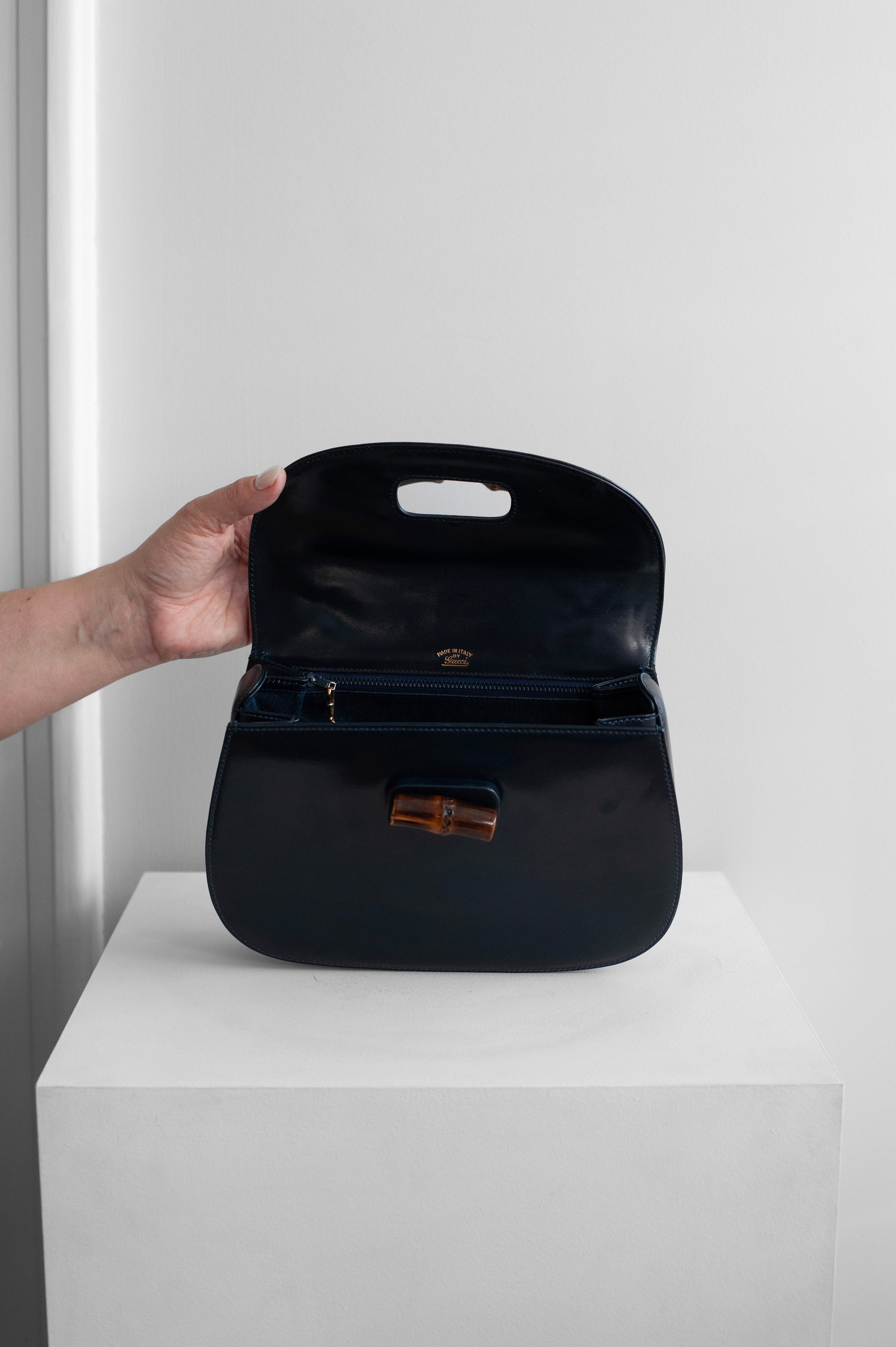 Ikona do vásho šatníka! Vintage kabelka GUCCI Bamboo v našej ponuke pochádza z 80. rokov a je vo výbornom stave. Farba kože je tmavomodrá, tzv.”box leather” v jemne lesklom prevedení. Kov je zlatý. Tento model bol navrhnutý ešte v roku 1947. Keďže po druhej svetovej vojne bol nedostatok kvalitnej kože, rúčka bola navrhnutá z ohýbaného bambusu. Aktuálne kabelka zažíva znovuzrodenie a jej ambasádorom je napríklad aj Harry Styles. Kabelka je značená vo vnútornej časti, dodáva sa s dustbagom.