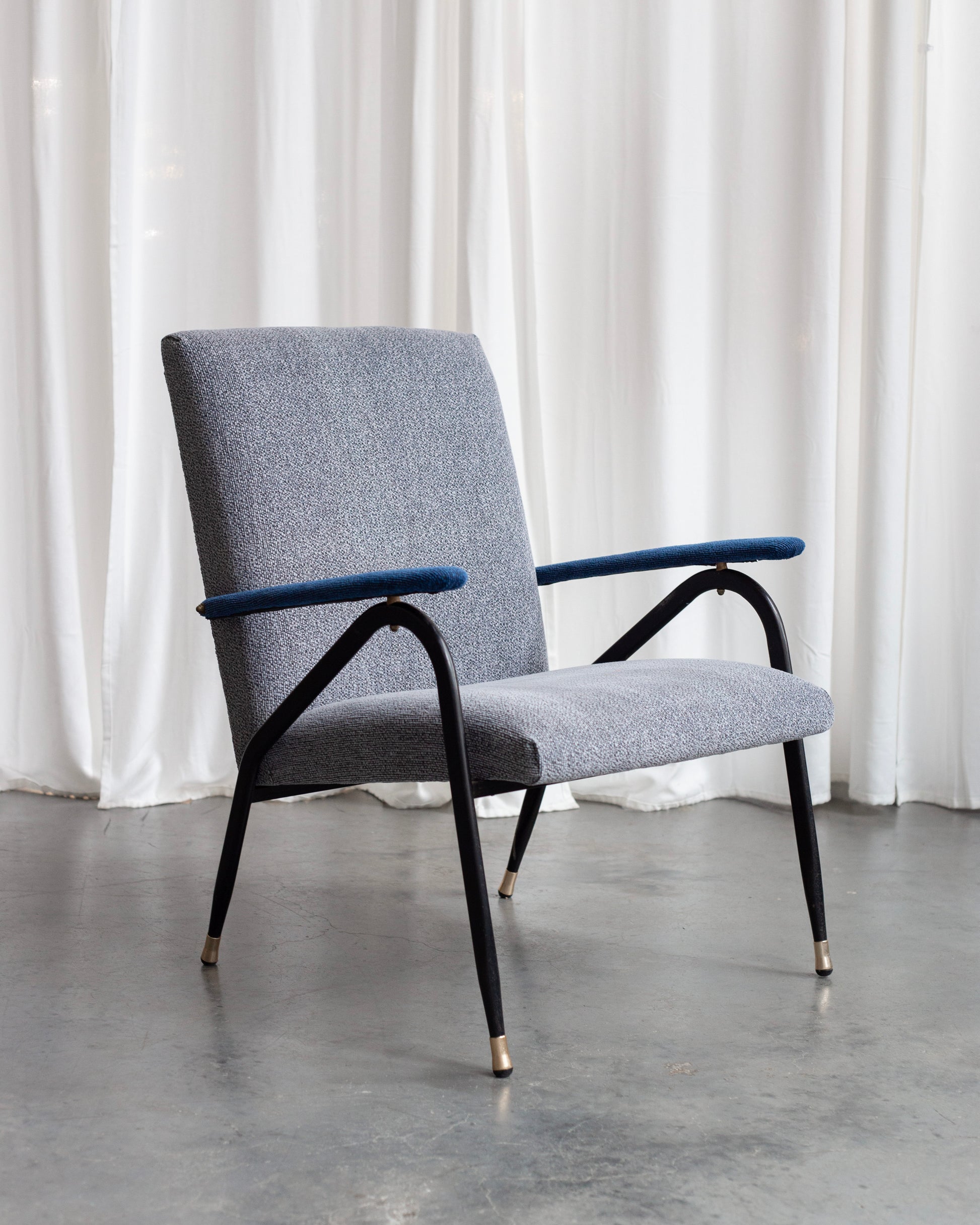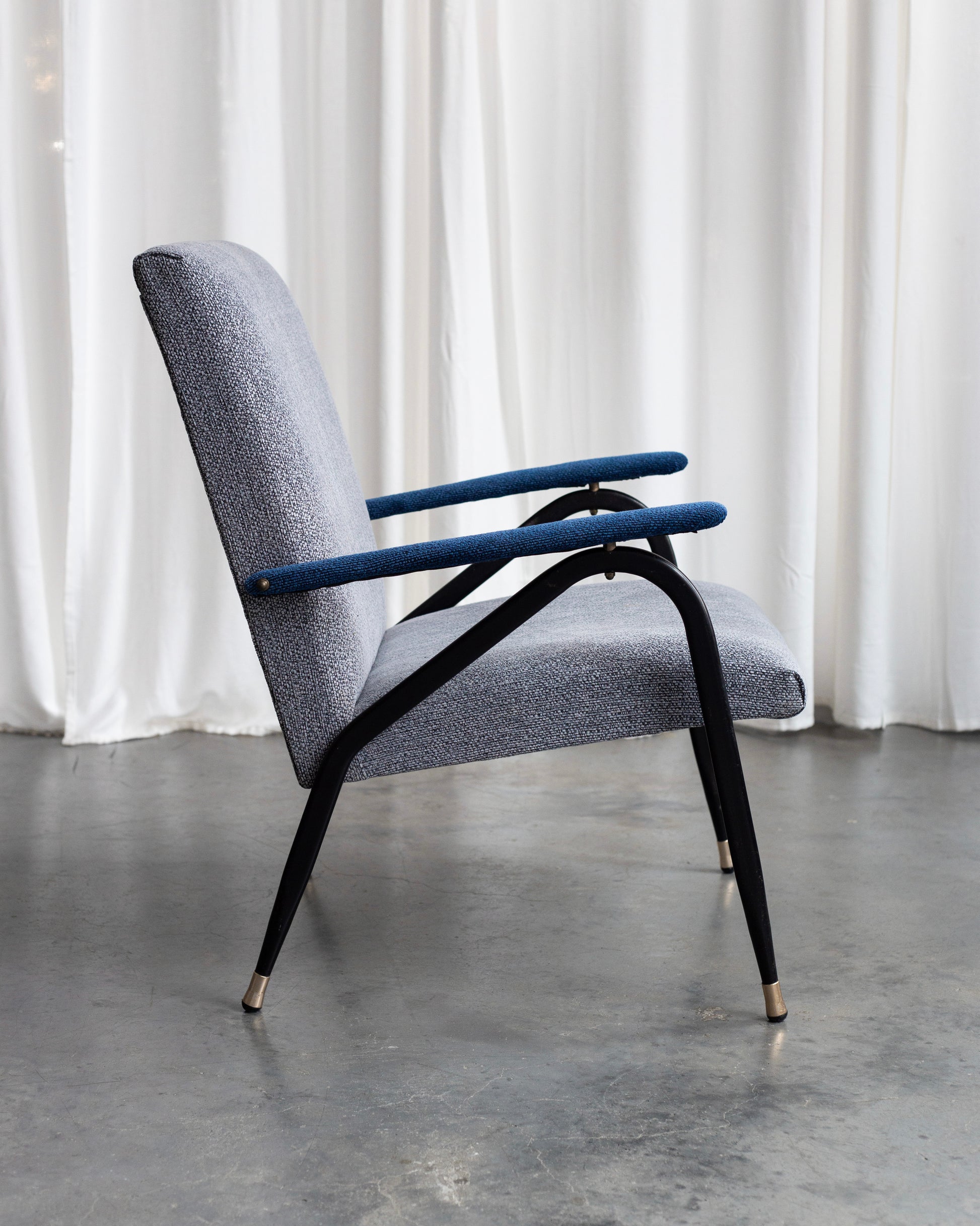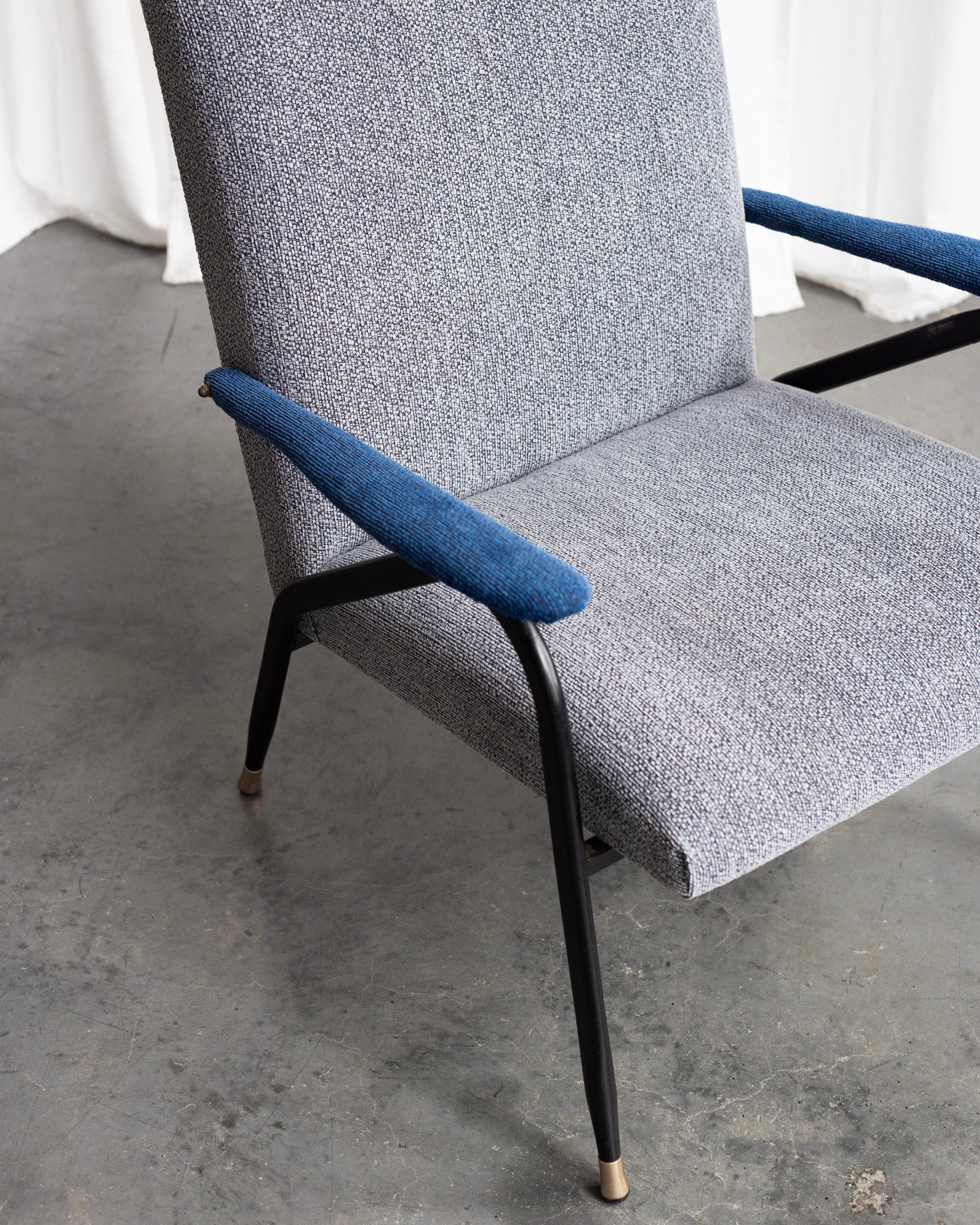 Kreslo sme prečalúnili do sivej látky s jemnou štruktúrou. Podrúčky sú z látky rovnakého typu v modrej farbe. Vymenené sú aj molitany, takže jemná patina je vidno iba na čiernej kovovej konštrukcii. Ukončenie nožičiek je hliníkové. Kreslo sme doviezli z Talianska a pochádza zo 60tych rokov. V prípade záujmu sa dajú podrúčky vymeniť a získať tak jednofarebné kreslo.