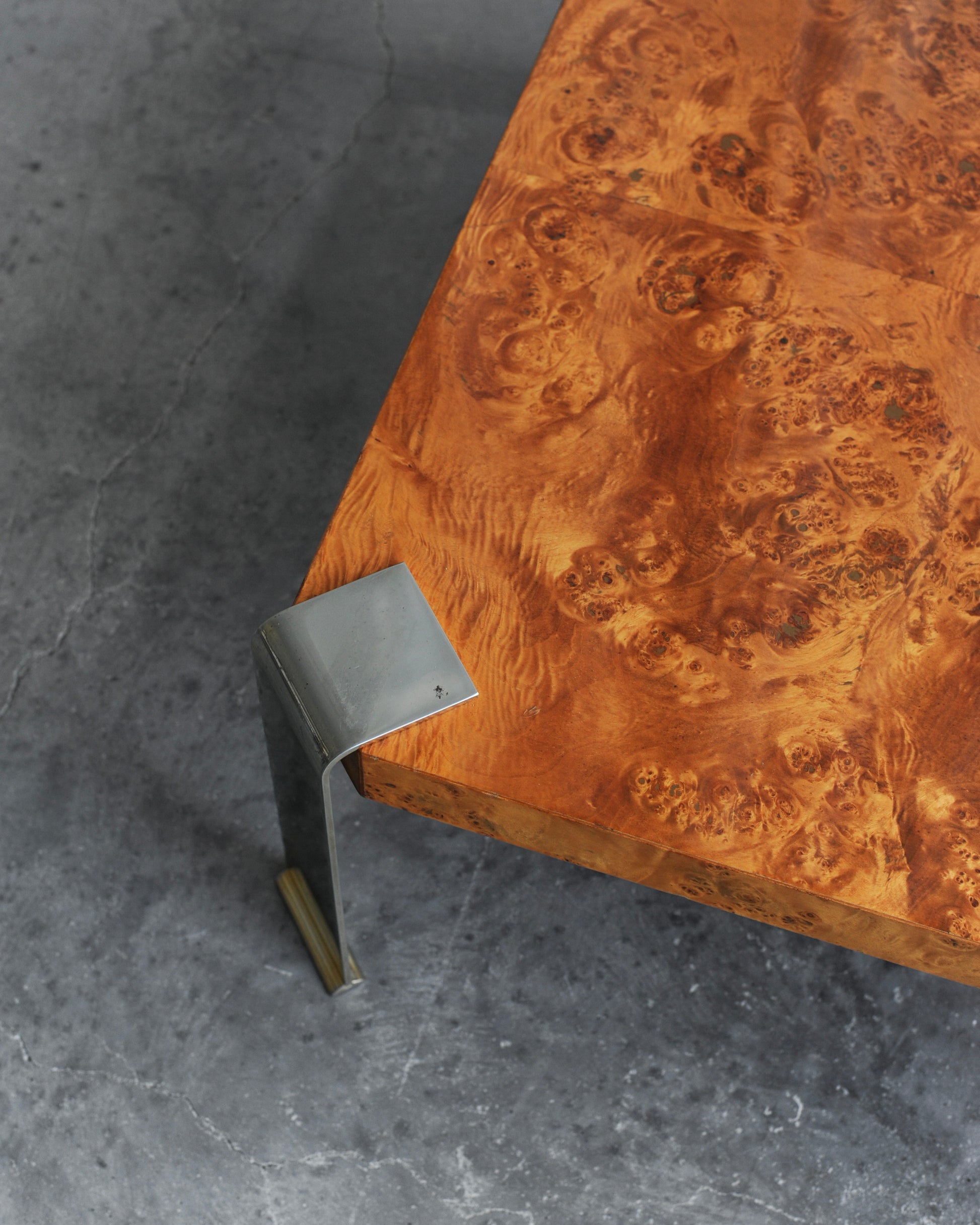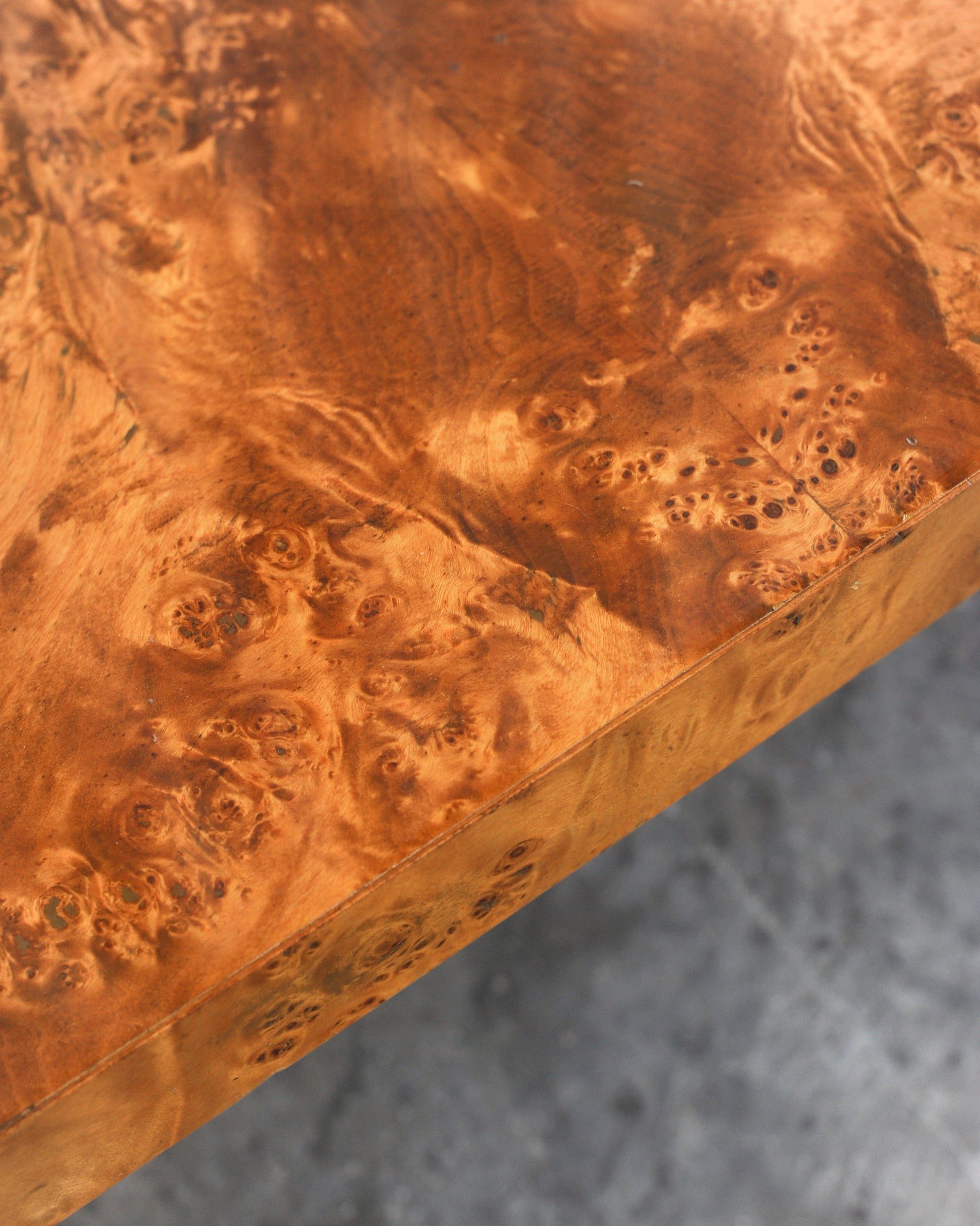 Stolík s krásnou korenicovou dýhou sme našli v Taliansku na burze. Povrch stolíka sme doleštili a zapracovali nerovnosti, rovnako ako aj kovové nohy.