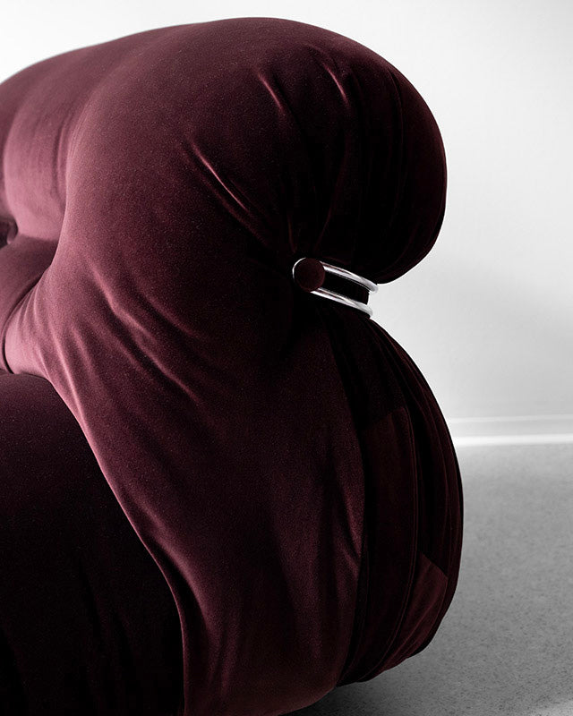 Ikonické kreslo Soriana sme našli v Taliansku. Rozhodli sme sa mu dopriať nový vzhľad v podobe kvalitného bavlneného zamatu bordovej farby. Čalúnenie bolo zverené profesionálom, ktorí vrátili kreslu jeho pôvodnú kvalitu a komfort. Vpredu má dve kolieska a vzadu dve nožičky, vďaka čomu sa dá ľahko presúvať po interiéri. Na spodnej strane je originálne označenie Cassina.