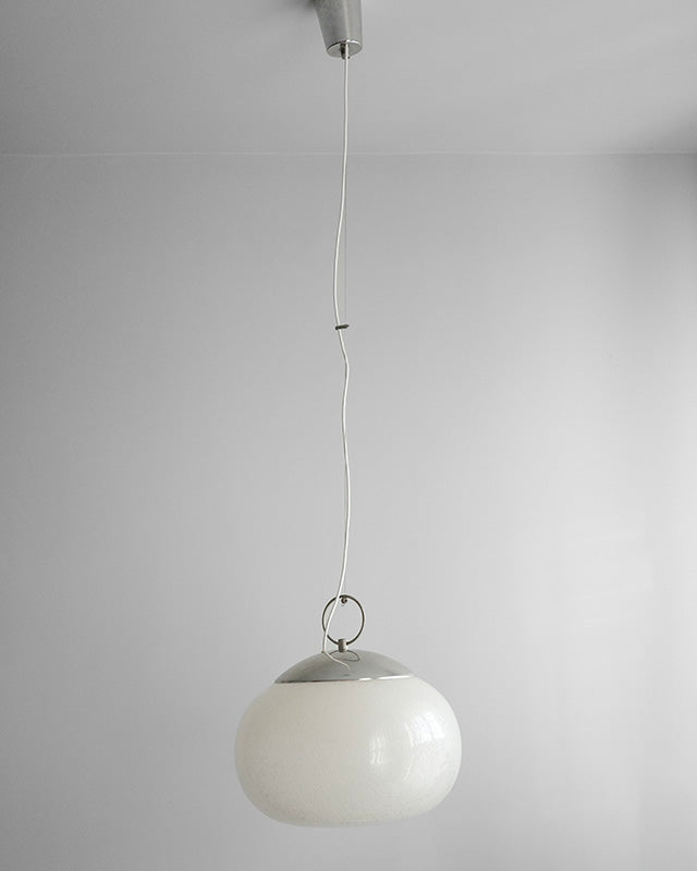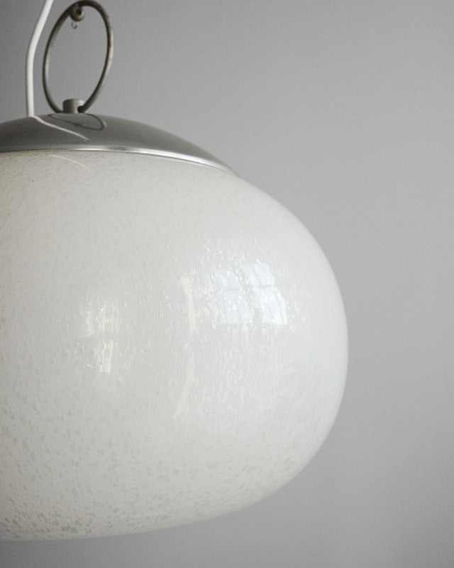 Talianske závesné svietidlo je vyrobené z ručne fúkaného muránskeho skla značkou Mazzega. Má organický tvar a zastupuje typický dizajn 70. rokov. Sklo má púdrovú farbu jemné bublinky v skle. Luster je vo výbornom stave, je skontrolovaný elektrikárom a má natiahnutú novú kabeláž a závesné lanko. Výška sa dá bez problémov na požiadanie upraviť. Aktuálne sme ho nechali na dlhšom kábli - 140cm.
